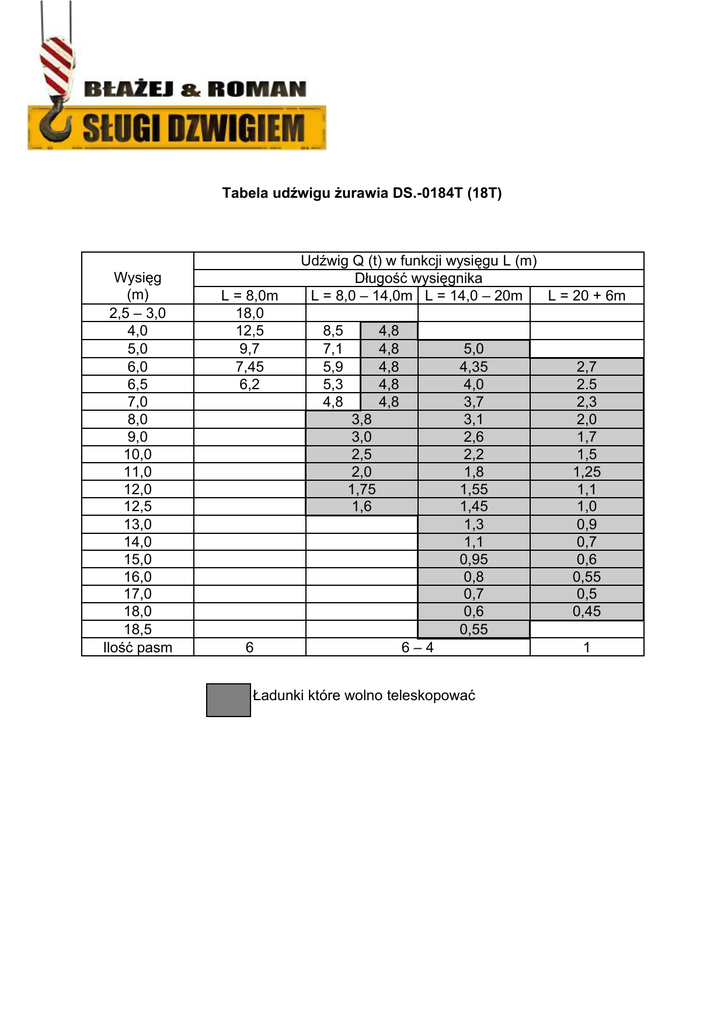 Tabela udźwigu żurawia DS.-0184T (18T) Wysięg (m) 2,5 – 3,0 4,0 5,0 6,0 6,5 7,0 8,0 9,0 10,0 11,0 12,0 12,5 13,0 14,0 15,0 16,0 17,0 18,0 18,5 Ilość pasm L = 8,0m 18,0 12,5 9,7 7,45 6,2 Udźwig Q (t) w funkcji wysięgu L (m) Długość wysięgnika L = 8,0 – 14,0m L = 14,0 – 20m L = 20 + 6m 8,5 7,1 5,9 5,3 4,8 4,8 4,8 4,8 4,8 4,8 5,0 4,35 4,0 3,7 3,1 2,6 2,2 1,8 1,55 1,45 1,3 1,1 0,95 0,8 0,7 0,6 0,55 3,8 3,0 2,5 2,0 1,75 1,6 6 6–4 Ładunki które wolno teleskopować 2,7 2.5 2,3 2,0 1,7 1,5 1,25 1,1 1,0 0,9 0,7 0,6 0,55 0,5 0,45 1