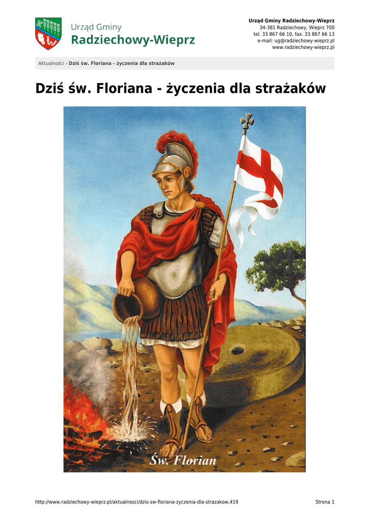 Urząd Gminy Radziechowy-Wieprz 34-381 Radziechowy, Wieprz 700 tel. 33 867 66 10, fax. 33 867 66 13 e-mail: [email protected] www.radziechowy-wieprz.pl Aktualności › Dziś św. Floriana - życzenia dla strażaków Dziś św. Floriana - życzenia dla strażaków http://www.radziechowy-wieprz.pl/aktualnosci/dzis-sw-floriana-zyczenia-dla-strazakow,419 Strona 1 Urząd Gminy Radziechowy-Wieprz 34-381 Radziechowy, Wieprz 700 tel. 33 867 66 10, fax. 33 867 66 13 e-mail: [email protected] www.radziechowy-wieprz.pl Aktualności › Dziś św. Floriana - życzenia dla strażaków Z okazji Święta Świętego Floriana, patrona wszystkich strażaków, składam wszystkim druhom z Ochotniczych Straży Pożarnych w Gminie RadziechowyWieprz serdecznie podziękowania za codzienną pracę na rzecz bezpieczeństwa mieszkańców naszej Gminy. Życzę Wam, aby Wasza działalność dawała jak najwięcej satysfakcji, pozwalała na spokojny powrót do domu pomimo coraz trudniejszych zadań, a wszystkim mieszkańcom dawała poczucie bezpieczeństwa. Aby wspomnienie Waszego patrona było dla Was źródłem natchnienia do dalszej służby pożarniczej niezależnie od tego czy pełniona jest ona ochotniczo czy zawodowo. Gratuluję sukcesów i życzę Wam wszelkiej pomyślności oraz spełnienia planów zarówno na gruncie osobistym, jak i zawodowym. Z wyrazami szacunku Maciej Mika Wójt Gminy Radziechowy-Wieprz http://www.radziechowy-wieprz.pl/aktualnosci/dzis-sw-floriana-zyczenia-dla-strazakow,419 Strona 2