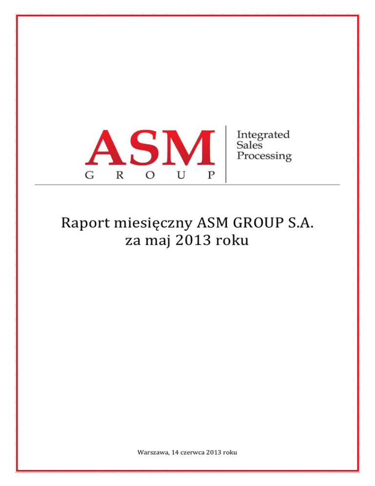 Raport miesięczny ASM GROUP S.A. za maj 2013 roku Warszawa, 14 czerwca 2013 roku RAPORT M)ES)ĘCZNY ASM GROUP S.A. – MAJ 2013 1) Informacje na temat wystąpienia tendencji i zdarzeń w otoczeniu rynkowym Emitenta, które w ocenie Emitenta mogą mieć w przyszłości istotne skutki dla kondycji finansowej oraz wyników finansowych Emitenta W maju działania Spółki ukierunkowane na pozyskanie nowych klientów pozwoliły podjąć współpracę w zakresie merchandisingu z takimi podmiotami jak Mead Johnson Nutrition (Poland) Sp. z o.o., będącym globalnym producentów produktów spożywczych dla niemowląt i dzieci, Karlovarské minerální vody, a.s., jednym z największych producentów wód mineralnych w Czechach oraz zawarto 2 nowe umowy o charakterze sezonowym na rzecz De Molen S.A. oraz SASKA Sp. z o.o., dystrybutora rowerów i akcesoriów do grilla. Ponadto, Spółce udało się pozyskać kontrakt na obsługę promocyjną Tata Global Beverages Polska Sp. z o.o., właściciela m.in. popularnej marki herbat Tetley. W maju jedna z dwóch spółek zależnych Emitenta działających we Włoszech zawarła umowę na świadczenie usług merchandisingu na rzecz Peroni, jednego z najpopularniejszych włoskich producentów piwa. Z uwagi na przedłużenie większości obowiązujących spółki włoskie z Grupy ASM umów z klientami jeszcze w pierwszym kwartale 2013 roku, Emitent zakłada, że struktura portfela klientów tych spółek zależnych będzie stabilna. Na koniec maja 2013 roku wszystkie spółki z Grupy ASM obsługiwały łącznie ponad 700 klientów. 2) Zestawienie wszystkich informacji opublikowanych przez Emitenta w trybie raportu bieżącego w okresie objętym raportem Data publikacji raportu Numer raportu EBI / ESPI Tytuł raportu 2013-05-14 Raport bieżący EB) 10/2013 Raport miesięczny za kwiecień 2013 roku 2013-05-29 Raport bieżący EB) /2013 Ogłoszenie o zwołaniu Zwyczajnego Walnego Zgromadzenia spółki ASM GROUP S.A. 3) Informacja na temat realizacji celów emisji Cel emisji akcji serii C został przez Spółkę zrealizowany w marcu 2013 roku, w wyniku wprowadzenia tych akcji do obrotu i ich debiutu w alternatywnym systemie obrotu. Spółka szczegółowo opisała sposób realizacji celów emisji akcji serii C w Dokumencie Informacyjnym. 4) Kalendarz inwestora obejmujący wydarzenia mające mieć miejsce w nadchodzącym miesiącu, które dotyczą Emitenta i są istotne z punktu widzenia interesów inwestorów str. 2 RAPORT M)ES)ĘCZNY ASM GROUP S.A. – MAJ 2013 Zgodnie z treścią opublikowanego w dniu kwietnia roku raportu bieżącego EB) 6/ Zarząd Spółki przyjął następujący harmonogram publikacji raportów okresowych w 2013 roku (poniżej przedstawiono harmonogram pozostających do publikacji raportów okresowych): Raporty kwartalne 7 sierpnia 2013 roku – skonsolidowany raport kwartalny za )) kwartał 6 listopada 2013 roku – skonsolidowany raport kwartalny za ))) kwartał roku; roku. Podstawa prawna: Punkt 6 Załącznika do Uchwały Nr / Zarządu Giełdy Papierów Wartościowych w Warszawie S.A. z dnia 31 marca 2010 r. – „Dobre Praktyki Spółek notowanych na NewConnect". Osoby reprezentujące Spółkę: Adam Stańczak – Prezes Zarządu Marcin Skrzypiec – Członek Zarządu ds. Finansów str. 3 RAPORT M)ES)ĘCZNY ASM GROUP S.A. – MAJ 2013 ASM GROUP S.A. ul. Świętokrzyska 00-052 Warszawa [email protected] tel.: (22) 829 94 61 fax: (22) 829 94 62 Spółki zależne – podmioty krajowe Spółki zależne – podmioty zagraniczne GRUPPO TRADE SERVICE – POLSKA SP. Z O.O. ul. Świętokrzyska 00-052 Warszawa adres korespondencyjny ul. Targowa 72 03-734 Warszawa TRADE S.P.A. Corso Francesco Ferrucci 77 / 9 10138 CAP Turyn (Włochy tel.: (0039) 0289289000 fax: (0039) 028928903031 [email protected] tel.: (22) 449 26 01 GREYMATTERS SP. Z O.O. ul. Świętokrzyska 00-052 Warszawa [email protected] tel.: (22) 829 94 85 fax. (22) 829 94 62 PROMOTION INTRADE S.R.L. Mediolan, Corso di Porto Nuova 46 CAP Mediolan Włochy tel.: (0039) 0289289000 fax: (0039) 028928903031 NEW LINE MEDIA SP. Z O.O. ul. Świętokrzyska 00-052 Warszawa tel.: (22) 829 94 61 fax: (22) 829 94 62 str. 4
