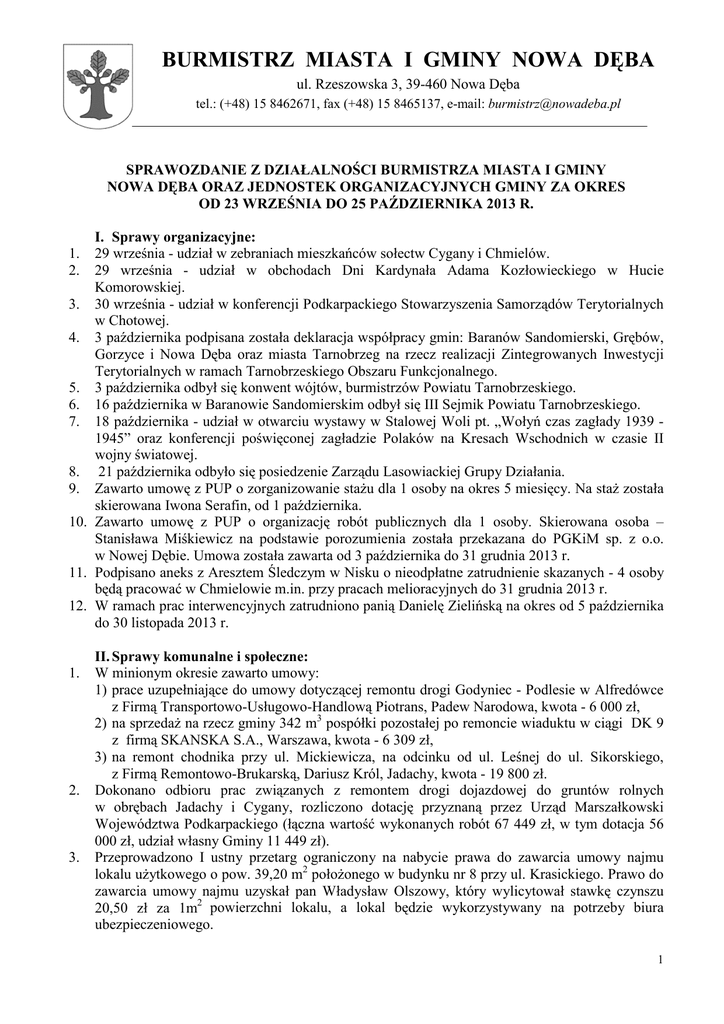 BURMISTRZ MIASTA I GMINY NOWA DĘBA ul. Rzeszowska 3, 39-460 Nowa Dęba tel.: (+48) 15 8462671, fax (+48) 15 8465137, e-mail: [email protected] SPRAWOZDANIE Z DZIAŁALNOŚCI BURMISTRZA MIASTA I GMINY NOWA DĘBA ORAZ JEDNOSTEK ORGANIZACYJNYCH GMINY ZA OKRES OD 23 WRZEŚNIA DO 25 PAŹDZIERNIKA 2013 R. I. Sprawy organizacyjne: 1. 29 września - udział w zebraniach mieszkańców sołectw Cygany i Chmielów. 2. 29 września - udział w obchodach Dni Kardynała Adama Kozłowieckiego w Hucie Komorowskiej. 3. 30 września - udział w konferencji Podkarpackiego Stowarzyszenia Samorządów Terytorialnych w Chotowej. 4. 3 października podpisana została deklaracja współpracy gmin: Baranów Sandomierski, Grębów, Gorzyce i Nowa Dęba oraz miasta Tarnobrzeg na rzecz realizacji Zintegrowanych Inwestycji Terytorialnych w ramach Tarnobrzeskiego Obszaru Funkcjonalnego. 5. 3 października odbył się konwent wójtów, burmistrzów Powiatu Tarnobrzeskiego. 6. 16 października w Baranowie Sandomierskim odbył się III Sejmik Powiatu Tarnobrzeskiego. 7. 18 października - udział w otwarciu wystawy w Stalowej Woli pt. „Wołyń czas zagłady 1939 1945” oraz konferencji poświęconej zagładzie Polaków na Kresach Wschodnich w czasie II wojny światowej. 8. 21 października odbyło się posiedzenie Zarządu Lasowiackiej Grupy Działania. 9. Zawarto umowę z PUP o zorganizowanie staŜu dla 1 osoby na okres 5 miesięcy. Na staŜ została skierowana Iwona Serafin, od 1 października. 10. Zawarto umowę z PUP o organizację robót publicznych dla 1 osoby. Skierowana osoba – Stanisława Miśkiewicz na podstawie porozumienia została przekazana do PGKiM sp. z o.o. w Nowej Dębie. Umowa została zawarta od 3 października do 31 grudnia 2013 r. 11. Podpisano aneks z Aresztem Śledczym w Nisku o nieodpłatne zatrudnienie skazanych - 4 osoby będą pracować w Chmielowie m.in. przy pracach melioracyjnych do 31 grudnia 2013 r. 12. W ramach prac interwencyjnych zatrudniono panią Danielę Zielińską na okres od 5 października do 30 listopada 2013 r. 1. 2. 3. II. Sprawy komunalne i społeczne: W minionym okresie zawarto umowy: 1) prace uzupełniające do umowy dotyczącej remontu drogi Godyniec - Podlesie w Alfredówce z Firmą Transportowo-Usługowo-Handlową Piotrans, Padew Narodowa, kwota - 6 000 zł, 2) na sprzedaŜ na rzecz gminy 342 m3 pospółki pozostałej po remoncie wiaduktu w ciągi DK 9 z firmą SKANSKA S.A., Warszawa, kwota - 6 309 zł, 3) na remont chodnika przy ul. Mickiewicza, na odcinku od ul. Leśnej do ul. Sikorskiego, z Firmą Remontowo-Brukarską, Dariusz Król, Jadachy, kwota - 19 800 zł. Dokonano odbioru prac związanych z remontem drogi dojazdowej do gruntów rolnych w obrębach Jadachy i Cygany, rozliczono dotację przyznaną przez Urząd Marszałkowski Województwa Podkarpackiego (łączna wartość wykonanych robót 67 449 zł, w tym dotacja 56 000 zł, udział własny Gminy 11 449 zł). Przeprowadzono I ustny przetarg ograniczony na nabycie prawa do zawarcia umowy najmu lokalu uŜytkowego o pow. 39,20 m2 połoŜonego w budynku nr 8 przy ul. Krasickiego. Prawo do zawarcia umowy najmu uzyskał pan Władysław Olszowy, który wylicytował stawkę czynszu 20,50 zł za 1m2 powierzchni lokalu, a lokal będzie wykorzystywany na potrzeby biura ubezpieczeniowego. 1 BURMISTRZ MIASTA I GMINY NOWA DĘBA ul. Rzeszowska 3, 39-460 Nowa Dęba tel.: (+48) 15 8462671, fax (+48) 15 8465137, e-mail: [email protected] 4. 5. 6. 7. Przeprowadzono I ustny przetarg ograniczony na nabycie prawa do zawarcia umowy najmu (bez moŜliwości wykupu) mieszkania o pow. 99,55m2 połoŜonego przy ul. Jana Pawła II 16, wylicytowana stawka czynszu 3,82 zł za 1m2 . Przyjęto i przetworzono za przedsiębiorcę z formy papierowej na elektroniczną 43 wnioski do CEIDG. Dokonano rozliczenia wpłaty III raty opłat za korzystanie z zezwoleń na sprzedaŜ napojów alkoholowych w kwocie 91 199 zł; łącznie od początku roku wpłaty wyniosły 283 851 zł. Zakończono usuwanie wyrobów zawierających azbest, firma odebrała łącznie 46,5t z 21 nieruchomości. Koszt realizacji zadania 17 722 zł, w tym NFOŚIGW- 8 861 zł, WFOŚiGW – 6 203 zł, budŜet Gminy – 2 658 zł. III. Sprawy finansowe: 1. Rozliczono wniosek o płatność dla zadania pn. Poprawa funkcjonalności i wizerunku miasta Nowa Dęba - otrzymano refundację w wysokości 1 077 350 zł. 2. Przygotowano wniosek o płatność końcową dla zadania pn. Poprawa funkcjonalności i wizerunku miasta Nowa Dęba - planowana kwota refundacji kosztów 1 195 655 zł. 3. Rozliczono wniosek końcowy o płatność zadania pn. Przebudowa Samorządowego Ośrodka Kultury w Nowej Dębie wraz z termomodernizacją filii w Cyganach - otrzymana kwota refundacji 82 215 zł. IV. Sprawy inwestycyjne: Zakończono i odebrano prace dotyczące: 1) remontu dróg gminnych, 2) rewitalizacji terenów zielonych wzdłuŜ ulic: Rzeszowskiej, Jana Pawła II , Mickiewicza, Krasickiego, 1-go Maja i Al. Zwycięstwa, 3) zagospodarowania terenu przy WCK w Chmielowie – budowy placu zabaw. V. Sprawy z zakresu rozwoju lokalnego i współpracy: 1. Zakończono postępowania o udzielenie zamówień publicznych i podpisano umowy: 1) na opracowanie dokumentacji projektowo – budowlanej, wykonawczej, kosztorysowej, budynku mieszkalnego wielorodzinnego, podpiwniczonego, wraz z niezbędną infrastrukturą techniczną na działkach po kotłowni przy ul Krasickiego w Nowej Dębie, wykonawca - MLBud P.B.P.H. – s.c. Mariusz i Leszek Czyszek, Gliwice, kwota- 59 901 zł, 2) na budowę sali sportowej przy Szkole Podstawowej Nr 2, wykonawca - Przedsiębiorstwo Budowlano – Produkcyjne Tawo-Bis Wojciech Szwarc, Tarnobrzeg, kwota - 137 835 zł (etap – budowa fundamentów), 3) na dowóz uczniów szkół podstawowych i gimnazjów z terenu Gminy Nowa Dęba na krytą pływalnię, wykonawca - PKS Tarnobrzeg, kwota - 2 497 za 1 cykl (2 tygodnie). 2. 11 października na zorganizowanej konferencji dokonano podsumowania r