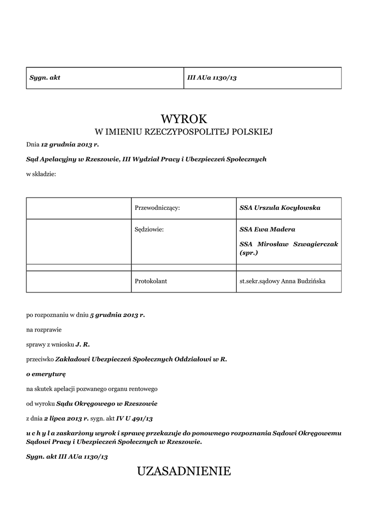 Sygn. akt III AUa 1130/13 WYROK W IMIENIU RZECZYPOSPOLITEJ POLSKIEJ Dnia 12 grudnia 2013 r. Sąd Apelacyjny w Rzeszowie, III Wydział Pracy i Ubezpieczeń Społecznych w składzie: Przewodniczący: SSA Urszula Kocyłowska Sędziowie: SSA Ewa Madera SSA Mirosław Szwagierczak (spr.) Protokolant st.sekr.sądowy Anna Budzińska po rozpoznaniu w dniu 5 grudnia 2013 r. na rozprawie sprawy z wniosku J. R. przeciwko Zakładowi Ubezpieczeń Społecznych Oddziałowi w R. o emeryturę na skutek apelacji pozwanego organu rentowego od wyroku Sądu Okręgowego w Rzeszowie z dnia 2 lipca 2013 r. sygn. akt IV U 491/13 u c h y l a zaskarżony wyrok i sprawę przekazuje do ponownego rozpoznania Sądowi Okręgowemu Sądowi Pracy i Ubezpieczeń Społecznych w Rzeszowie. Sygn. akt III AUa 1130/13 UZASADNIENIE Decyzją z 31 stycznia 2013 r. Oddział ZUS w R. odmówił J. R. prawo do emerytury – w uzasadnieniu decyzji wskazano, iż wnioskodawca nie udowodnił co najmniej 15 lat pracy w warunkach szczególnych ani nie wykazał co najmniej 8 lat pracy górniczej. W skutek odwołania wnioskodawcy Sąd Okręgowy Sąd Pracy i Ubezpieczeń Społecznych w Rzeszowie wyrokiem z dnia 2 lipca 2013 r. zmienił zaskarżoną decyzję i przyznał wnioskodawcy prawo do emerytury od 30 listopada 2012 r. oraz zasądził na jego rzecz zwrot kosztów procesu w kwocie 60 zł. Swoje rozstrzygnięcie Sąd Okręgowy oparł na ustaleniu, że p. J. R. w okresach: 1.03.1976 r. – 30.09.1982 r. i 1.01.1984 r. – 31.01.1987 r., będąc zatrudniony w Kopalni (...) w W., na stanowiskach inspektorach ds. gospodarki materiałowej oraz inspektora ds. obudowy, wykonywał pracę górniczą w rozumieniu art. 50 c ust. 1 pkt 5 e. i r. Taką też pracę wykonywał, zdaniem Sądu Okręgowego, podczas zatrudnienia w Przedsiębiorstwie (...) w W. – jako inspektor ds. zużycia materiałów pod ziemią. Sąd I instancji uznał, że p. J. R. legitymuje się okresem 9 lat i 6 miesięcy pracy górniczej oraz spełnia pozostałe przesłanki z art. 184 w związku z art. 39 ustawy emerytalnej, co skutkuje obniżeniem jego wieku emerytalnego o 4 lata i 6 miesięcy i uznaniem, że w dniu 30 listopada 2012 r., składając wniosek, posiadał wymagany wiek emerytalny uprawniający do emerytury. Stąd orzeczenie zmieniające decyzję ZUS (art. 477 14 § 2 kpc). Organ rentowy złożył apelację od powyższego wyroku zarzucając: - naruszenie art. 39 w związku z art. 184 i art. 50 c ust. 1 pkt 4 i 5 ustawy o emeryturach i rentach z Funduszu Ubezpieczeń Społecznych – poprzez błędną wykładnię i przyjęcie, że praca wnioskodawcy w spornych okresach była pracą górniczą oraz przyznanie mu emerytury, - obrazą art. 233 § 1 kpc – wobec nie rozważenia wszystkich okoliczności sprawy. Apelujący wniósł o zmianę zaiskrzonego wyroku i oddalenie odwołania. Uzasadnienie apelacji zasadza się na twierdzeniu, że wnioskodawca nie przepracował co najmniej 15 lat w warunkach szczególnych, a zwłaszcza w latach 1976 – 1982 i 1984 – 1987 nie wykazał pracy górniczej. Odpowiadając na apelację powód wniósł o jej oddalenie i zasądzenie kosztów - podtrzymując stanowisko. Rozpoznając sprawę Sąd Apelacyjny ustalił i zważył co następuje: 1. Wnioskodawca J. R. urodził się (...) W dniu 30 listopada 2012 r. złożył wniosek o przyznanie prawa do emerytury. Wnioskodawca nie był członkiem Otwartego Funduszu Emerytalnego i nie pozostawał w stosunku pracy (k. 77-79 akt emerytalnych). Okolicznością bezsporną jest, że wnioskodawca legitymuje się stażem ogólnym w wymiarze 29 lat, 11 miesięcy i 17 dni okresów składkowych i nieskładkowych. Uprzednio ubiegał się o przyznanie prawa do emerytury i dwukrotnie otrzymał decyzję odmowną. W uchylonych decyzjach z dnia 12 marca 2012 r. i 10 grudnia 2012 r. odmówiono wnioskodawcy prawa do emerytury, lecz pierwotnie uznano jako okres pracy górniczej (pracy w szczególnych warunkach) zatrudnienie od dnia 1 maja 1976 r. do 30 września 1982 r. w Przedsiębiorstwie (...) w W. (łącznie 6 lat i 5 miesięcy). Niesporne w sprawie jest również, że J. R. był zatrudniony w Przedsiębiorstwie (...) w W., w pełnym wymiarze czasu pracy, od 1 sierpnia 1973 r. do 31 grudnia 1983 r. Przy czym w okresie od 1 sierpnia 1973 r. do 30 kwietnia 1976 r. zajmował stanowisko specjalisty ds. planowania. Od 1 maja 1976 r. do 30 września 1982 r. wnioskodawca zajmował stanowisko inspektora ds. gospodarki materiałowej. Zaś od 1 października 1982 r. do 31 grudnia 1983 r. zajmował stanowisko starszego inspektora ds. zużycia materiałów. Od 1 stycznia 1984 r. do 31 stycznia 1987 r. pozostawał w zatrudnieniu z Kopalnią (...) w W., w pełnym wymiarze czasu pracy, na stanowisku inspektora ds. odbudowy pod ziemią. Wnioskodawca pracował stale i w pełnym wymiarze czasu pracy. J. R. był obowiązany do wykonywania 12 zjazdów pod ziemię miesięcznie. 2. Decyzją z dnia 31 stycznia 2013 r. ZUS odmówił wnioskodawcy prawa do emerytury w oparciu o art. 184 w związku z art. 32 i art. 39 ustawy z dnia 17 grudnia 1998 r. o emeryturach i rentach z Funduszu Ubezpieczeń Społecznych (tekst jedn. Dz. U. z 2009 r. Nr 153 poz. 1227 ze zm.) oraz w związku z przepisami rozporządzenia Rady Ministrów z dnia 7 lutego 1983 r. w sprawie wieku emerytalnego pracowników zatrudnionych w szczególnych warunkach lub w szczególnym charakterze (Dz. U. Nr 8 poz. 43 ze zm.). Organ rentowy nie uznał jako pracy w szczególnych warunkach zatrudnienia wnioskodawcy od 7.10.1968 r. do 30.06.1972 r. w (...) Kamieniołomach (...) oraz okresu od 1.10.1982 r. do 31.12.1983 r. w Przedsiębiorstwie (...) w W., a także nie został uznany ten czas jako okres pracy górniczej - w rozumieniu przepisów ustawy emerytalnej (art. 50 c ust. 1) - okres od 1.05.1976 r. do 30.09.1982 r. w Przedsiębiorstwie (...) w W. oraz od 1.01.1984 r. do 31.01.1987 r. w Kopalni (...). 3. Ponieważ p. J. R. nie osiągnął wieku 65 lat jego wniosek emerytalny na