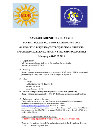ZAWIADOMIENIE O REGATACH PUCHAR POLSKI JACHTÓW KABINOWYCH 2015 42 REGATY O BŁĘKITNĄ BŁĘ WSTĘGĘ JEZIORA IORA MIEDWIE i PUCHAR UCHAR PREZYDENTA MIASTA STRGARD SZCZECIŃSKI SZCZECI Morzyczyn 04-05.07.2015 1. Organizator Młodzieżowym owym Domu Kultury w Stargardzie Szczecińskim, Stowarzyszenie MIEDWIE. 2. Przepisy Regaty zostanąą rozegrane zgodnie z przepisami (PRŻ (PR 2013 – 2016), 20 przepisami pomiarowymi związków zwią i klas uczestniczących w regatach. 3. Klasy - Omega - Jachty Kabinowe T1, T2, T3, TR - SIGMA ACTIVE - Long Dystans - OPEN 4. Termin i miejsce rozegrania regat oraz scenariusz godzinowy. Regaty odbędą ę ą się w dniach 04 0 – 05. 07. 2015 r. na akwenie jeziora Miedwie 5. Zgłoszenia i wpisowe do regat Zgłoszenie do regat wraz z formularzem pomiarowym lub świadectwem pomiarowym można żna zgłaszać zgłasza internetowo na adres: [email protected] do dnia 2.07.2015. Indywidualne zgłoszenia przyjmowane będą b w biurze iurze regat na przystani MDK w Morzyczynie w dn. 03.07.2015 w godz. 17.00-21.00 17.00 21.00 oraz w dniu 04.07.2015 w godz. 08.00-09.00. Wpisowe do regat wynosi 45 zł. od załogi. Wpisowe załóg zgłaszanych w dniu regat. regat. 04.07.2015 wynosi 60zł. Wpisowe do wyścigu ścigu dla jachtów zgłaszających się tylko do wyścigu wyś długiego LONG DYSTANS wynosi 30zł. 6. Program regat Otwarcie regat w dn. 04.07.2015 o godz. 10.00 na przystani MDK w Morzyczynie Gotowość startowa w dn. 04.07.2015 godz11.00 Gotowość startowa w dn. 05.07.2015 godz. 10.30 Planuje się rozegranie 5 wyścigów klasowych i jednego wyścigu długiego punktowanego oddzielnie. Regaty będą ważne po rozegraniu przynajmniej 1 wyścigu. 7. Instrukcja żeglugi Instrukcja żeglugi dostępna będzie w biurze regat w dniu 03.07.2015 r. 8. Punktacja W wyścigu długim nie będzie przeliczania czasu. Wyścig długi nie wlicza się do punktacji klasowej. W regatach stosowany będzie system małych punktów zgodnie z Dodatkiem A PRŻ 2013-2016. 9. Kontrola sprzętu: kontrola sprzętu w zakresie zgodności jachtu z przepisami klasowymi może zostać dokonana w dowolnym czasie podczas regat. Osobami uprawnionymi do przeprowadzenia kontroli wielkości zadeklarowanej przez zawodnika wartości współczynnika Vi oraz warunków zabudowy kabiny zgodnie z przepisami Pomiarowymi Jednokadłubowych Jachtów Kabinowych i składania na piśmie raportów do Komisji Sędziowskiej ( pkt. 1.3 b Podręcznik Mierniczych Międzynarodowych) jest Kontroler Sprzętu Jarosław Bazylko 10. Nagrody Puchary i dyplomy dla jachtów na pierwszych miejscach w swojej grupie. Błękitna Wstęga i puchar dla najszybszego jachtu w wyścigu długim. Nagrody rzeczowe losowane wśród załóg. 11.Odpowiedzialność Żadna z czynności wykonana lub niewykonana przez organizatorów nie zwalnia uczestnika regat od ponoszenia odpowiedzialności za jakąkolwiek szkodę spowodowana przez zawodnika lub jego jacht. Kapitan jest odpowiedzialny za wyposażenie jachtu zgodne z przepisami. Ubezpieczenie OC jachtu jest obowiązkowe 12. Ubezpieczenie Każdy uczestniczący jacht musi posiadać ubezpieczenie OC na czas regat. 13.Adres organizatora Młodzieżowy dom Kultury w Stargardzie Szczecińskim ul. Portowa 3 73 – 110 Stargard Szczeciński Tel 91(834-43-01) 14. Miejsce regat Ośrodek wodny MDK ul. Szczecińska 10 A 73 -108 Morzyczyn 15. Zakwaterowanie Organizator zapewnia bezpłatne skorzystanie z pola biwakowego na przystani MDK oraz parkingu dla samochodów i przyczep. Informacja dla ekip chcących skorzystać z odpłatnych noclegów: Motel Polonus ul. Szczecińska 4 73-108 Morzyczyn Tel./fax.: (91) 561-00-12 Tel. kom.: 602-153-236 www.motelpolonus.com HOTEL FENIX ** ul. Szczecińska 12 73-108 Morzyczyn http://www.fenix-hotel.pl Organizator życzy wszystkim uczestnikom sukcesów i zadowolenia z pobytu nad pięknym a mało znanym jeziorem Miedwie.