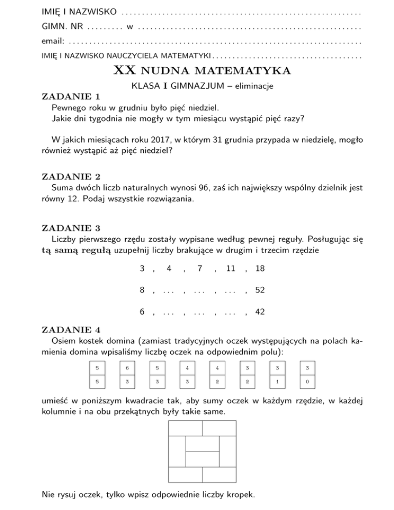 IMIĘ I NAZWISKO . . . . . . . . . . . . . . . . . . . . . . . . . . . . . . . . . . . . . . . . . . . . . . . . . . . . . . . . . . . GIMN. NR . . . . . . . . . w . . . . . . . . . . . . . . . . . . . . . . . . . . . . . . . . . . . . . . . . . . . . . . . . . . . . . . . email: . . . . . . . . . . . . . . . . . . . . . . . . . . . . . . . . . . . . . . . . . . . . . . . . . . . . . . . . . . . . . . . . . . . . . . . . IMIĘ I NAZWISKO NAUCZYCIELA MATEMATYKI . . . . . . . . . . . . . . . . . . . . . . . . . . . . . . . . . . . . . XX NUDNA MATEMATYKA KLASA I GIMNAZJUM – eliminacje ZADANIE 1 Pewnego roku w grudniu było pięć niedziel. Jakie dni tygodnia nie mogły w tym miesiącu wystąpić pięć razy? W jakich miesiącach roku 2017, w którym 31 grudnia przypada w niedzielę, mogło również wystąpić aż pięć niedziel? ZADANIE 2 Suma dwóch liczb naturalnych wynosi 96, zaś ich największy wspólny dzielnik jest równy 12. Podaj wszystkie rozwiązania. ZADANIE 3 Liczby pierwszego rzędu zostały wypisane według pewnej reguły. Posługując się tą samą regułą uzupełnij liczby brakujące w drugim i trzecim rzędzie 3 , 4 , 7 , 11 , 18 8 , . . . , . . . , . . . , 52 6 , . . . , . . . , . . . , 42 ZADANIE 4 Osiem kostek domina (zamiast tradycyjnych oczek występujących na polach kamienia domina wpisaliśmy liczbę oczek na odpowiednim polu): 5 6 5 4 4 3 3 3 5 3 3 3 2 2 1 0 umieść w poniższym kwadracie tak, aby sumy oczek w każdym rzędzie, w każdej kolumnie i na obu przekątnych były takie same. Nie rysuj oczek, tylko wpisz odpowiednie liczby kropek.
