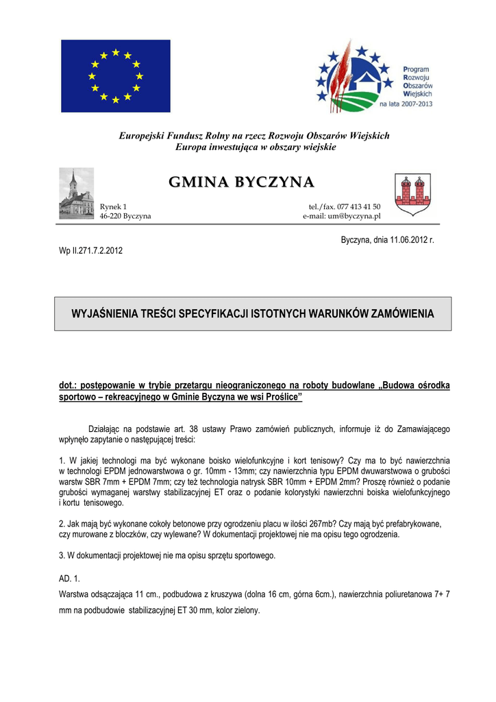 Europejski Fundusz Rolny na rzecz Rozwoju Obszarów Wiejskich Europa inwestująca w obszary wiejskie GMINA BYCZYNA Rynek 1 46-220 Byczyna tel./fax. 077 413 41 50 e-mail: [email protected] Byczyna, dnia 11.06.2012 r. Wp II.271.7.2.2012 WYJAŚNIENIA TREŚCI SPECYFIKACJI ISTOTNYCH WARUNKÓW ZAMÓWIENIA dot.: postępowanie w trybie przetargu nieograniczonego na roboty budowlane „Budowa ośrodka sportowo – rekreacyjnego w Gminie Byczyna we wsi Proślice” Działając na podstawie art. 38 ustawy Prawo zamówień publicznych, informuje iŜ do Zamawiającego wpłynęło zapytanie o następującej treści: 1. W jakiej technologi ma być wykonane boisko wielofunkcyjne i kort tenisowy? Czy ma to być nawierzchnia w technologi EPDM jednowarstwowa o gr. 10mm - 13mm; czy nawierzchnia typu EPDM dwuwarstwowa o grubości warstw SBR 7mm + EPDM 7mm; czy teŜ technologia natrysk SBR 10mm + EPDM 2mm? Proszę równieŜ o podanie grubości wymaganej warstwy stabilizacyjnej ET oraz o podanie kolorystyki nawierzchni boiska wielofunkcyjnego i kortu tenisowego. 2. Jak mają być wykonane cokoły betonowe przy ogrodzeniu placu w ilości 267mb? Czy mają być prefabrykowane, czy murowane z bloczków, czy wylewane? W dokumentacji projektowej nie ma opisu tego ogrodzenia. 3. W dokumentacji projektowej nie ma opisu sprzętu sportowego. AD. 1. Warstwa odsączająca 11 cm., podbudowa z kruszywa (dolna 16 cm, górna 6cm.), nawierzchnia poliuretanowa 7+ 7 mm na podbudowie stabilizacyjnej ET 30 mm, kolor zielony. AD. 2. Cokoły wykonać jako betonowe, wylewane. AD. 3. SIATKÓWKA i BADMINTON - Słupki do siatkówki aluminiowe, wielofunkcyjne, z naciągiem śrubowym, Siatka do siatkówki czarna z antenkami, 2 piłki, 2 komplety kometki + lotki KOSZYKÓWKA 2 KOMPLETY – Tablica do koszykówki laminowana, z Ŝywic epoksydowych, obręcz uchylna, profesjonalna (z siłownikiem spręŜynowym), + siatka, stojak do koszykówki na boisko ocynkowany, 2 piłki; TENIS – siatka do tenisa ziemnego czarna z fartuchem PE, słupki do tenisa aluminiowe owalne z naciągiem śrubowym, 2 komplety rakietek + 12 piłek. PIŁKA RĘCZNA – bramka do piłki ręcznej aluminiowa, przedłuŜana 3 x 2 m do mocowania w tunelach, siatka do bramki do piłki ręcznej PE grubość splotu 2,5 mm, 2 piłki do ręcznej, 2 piłki do nogi. WSZYSTKIE SŁUPKI MAJĄ MIEĆ TYPOWE TULEJE DO OSADZENIA. KAZDE BOISKO MUSI MIEĆ LINIE DLA DANEJ KONKURANCJI.