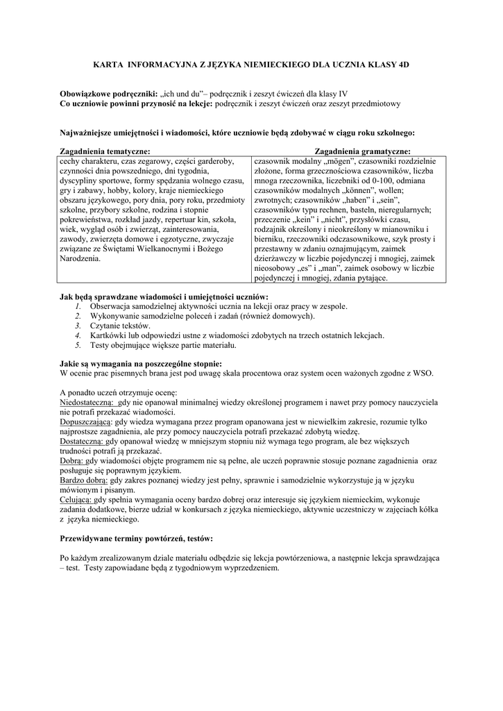 KARTA INFORMACYJNA Z JĘZYKA NIEMIECKIEGO DLA UCZNIA KLASY 4D Obowiązkowe podręczniki: „ich und du”– podręcznik i zeszyt ćwiczeń dla klasy IV Co uczniowie powinni przynosić na lekcje: podręcznik i zeszyt ćwiczeń oraz zeszyt przedmiotowy Najważniejsze umiejętności i wiadomości, które uczniowie będą zdobywać w ciągu roku szkolnego: Zagadnienia tematyczne: cechy charakteru, czas zegarowy, części garderoby, czynności dnia powszedniego, dni tygodnia, dyscypliny sportowe, formy spędzania wolnego czasu, gry i zabawy, hobby, kolory, kraje niemieckiego obszaru językowego, pory dnia, pory roku, przedmioty szkolne, przybory szkolne, rodzina i stopnie pokrewieństwa, rozkład jazdy, repertuar kin, szkoła, wiek, wygląd osób i zwierząt, zainteresowania, zawody, zwierzęta domowe i egzotyczne, zwyczaje związane ze Świętami Wielkanocnymi i Bożego Narodzenia. Zagadnienia gramatyczne: czasownik modalny „mögen”, czasowniki rozdzielnie złożone, forma grzecznościowa czasowników, liczba mnoga rzeczownika, liczebniki od 0-100, odmiana czasowników modalnych „können”, wollen; zwrotnych; czasowników „haben” i „sein”, czasowników typu rechnen, basteln, nieregularnych; przeczenie „kein” i „nicht”, przysłówki czasu, rodzajnik określony i nieokreślony w mianowniku i bierniku, rzeczowniki odczasownikowe, szyk prosty i przestawny w zdaniu oznajmującym, zaimek dzierżawczy w liczbie pojedynczej i mnogiej, zaimek nieosobowy „es” i „man”, zaimek osobowy w liczbie pojedynczej i mnogiej, zdania pytające. Jak będą sprawdzane wiadomości i umiejętności uczniów: 1. Obserwacja samodzielnej aktywności ucznia na lekcji oraz pracy w zespole. 2. Wykonywanie samodzielne poleceń i zadań (również domowych). 3. Czytanie tekstów. 4. Kartkówki lub odpowiedzi ustne z wiadomości zdobytych na trzech ostatnich lekcjach. 5. Testy obejmujące większe partie materiału. Jakie są wymagania na poszczególne stopnie: W ocenie prac pisemnych brana jest pod uwagę skala procentowa oraz system ocen ważonych zgodne z WSO. A ponadto uczeń otrzymuje ocenę: Niedostateczną: gdy nie opanował minimalnej wiedzy określonej programem i nawet przy pomocy nauczyciela nie potrafi przekazać wiadomości. Dopuszczającą: gdy wiedza wymagana przez program opanowana jest w niewielkim zakresie, rozumie tylko najprostsze zagadnienia, ale przy pomocy nauczyciela potrafi przekazać zdobytą wiedzę. Dostateczną: gdy opanował wiedzę w mniejszym stopniu niż wymaga tego program, ale bez większych trudności potrafi ją przekazać. Dobrą: gdy wiadomości objęte programem nie są pełne, ale uczeń poprawnie stosuje poznane zagadnienia oraz posługuje się poprawnym językiem. Bardzo dobrą: gdy zakres poznanej wiedzy jest pełny, sprawnie i samodzielnie wykorzystuje ją w języku mówionym i pisanym. Celującą: gdy spełnia wymagania oceny bardzo dobrej oraz interesuje się językiem niemieckim, wykonuje zadania dodatkowe, bierze udział w konkursach z języka niemieckiego, aktywnie uczestniczy w zajęciach kółka z języka niemieckiego. Przewidywane terminy powtórzeń, testów: Po każdym zrealizowanym dziale materiału odbędzie się lekcja powtórzeniowa, a następnie lekcja sprawdzająca – test. Testy zapowiadane będą z tygodniowym wyprzedzeniem.