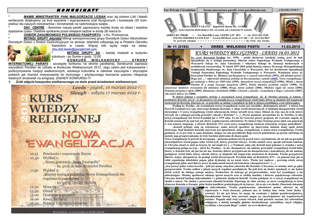 K O M U N I K A TY * MAMIE MINISTRANTEK PANI MAŁGORZACIE LESIAK oraz Jej córkom Lidii i Natalii serdecznie dziękujemy za trud wyprania i wyprasowania szat liturgicznych i komeszek /20 kompletów/ dla naszych ministrantów i ministrantek na nadchodzące święta. . * DAY CENTRE - Seniorów naszej parafii zapraszamy każdej środy na obiad i wspólne spędzenie czasu. Ostatnie spotkanie przed świętami będzie w środę 28 marca br. * ODBIÓR ZAGUBIONEGO POLSKIEGO PASZPORTU - u Ks. Proboszcza. * MITINGI GRUPY dda/ddd Mitingi samopomocowej grupy Dorosłych Dzieci Alkoholików/ Dorosłych Dzieci z Rodzin Dysfunkcyjnych (w skrócie: dda/ddd) odbywają się w Polskim Ośrodku Katolickim w Leeds. Więcej info wyślij mejla na adres: [email protected] * MITINGI GRUPY AA - każdej niedzieli w budynku szkolnym - po Sumie o godz. 12:00 * KONKURS WIELKANOCNY STRONY INTERNETOWEJ PARAFII - szczegóły konkursu na stronie parafialnej. Serdecznie zaprasza wszystkich Parafian do udziału w Konkursie Wielkanocnym 2012. Jego celem jest kultywowanie i podtrzymywanie tradycji wielkanocnych, edukacja kulturalna w zakresie zwyczajów i obyczajów polskich jak również motywowanie do twórczego i artystycznego tworzenia poprzez integracje lokalnych środowisk na emigracji. ZASADY KONKURSU !!! 1. Zrób zdjęcie koszyczka wielkanocnego na stole przed śniadaniem wielkanocnym. For Private Circulation „ CHAPELTOWN ” Strona internetowa parafii: www.parafialeeds.com P O L S K I E J P A R A F I I Registered Charity No: 1119423 M.B.CZĘSTOCHOWSKIEJ I ŚW. STANISŁAWA KOSTKI W LEEDS. ADRES KS. PROB. + 6A, Harehills Lane, LEEDS, LS7 4EY + tel. 0113-262 3220 POLSKI OŚRODEK KATOLICKI + Newton Hill Road, Leeds, LS7 4JE + tel. 0113-262 8019 Na prawach rękopisu + + + + + + + + + + + + + + + + + + + Ks. Prob. Jan Zaręba Nr 11 (2193) + OKRES WIELKIEGO POSTU + 11.03.2012 KURS WIEDZY RELIGIJNEJ - LEEDS 16.03.2012 Ks. prof. Krzysztof Pawlina (ur. 1959) – polski duchowny katolicki, teolog, prof. dr hab. Specjalizuje się w teologii pastoralnej. Obecnie rektor Papieskiego Wydziału Teologicznego w Warszawie Sekcja św. Jana Chrzciciela i wikariusz biskupi ds. formacji duchownych w archidiecezji warszawskiej. W latach 1997-2010 pełnił funkcję rektora Wyższego Metropolitalnego Seminarium Duchownego św. Jana Chrzciciela w Warszawie. Był też dyrektorem Specjalizacji Teologii Pastoralnej Papieskiego Wydziału Teologicznego w Warszawie. Ważniejsze prace ks. Krzysztofa Pawliny to: Młodzież i jej duszpasterze w czasach zniewolenia (1993), Jak młodym mówić o Bogu dziś ... : odpowiedzi młodzieży polskiej na Kwestionariusz rzymski (1995), Nowa ewangelizacja i jej realizacja w Polsce po 1989 roku (1995), Apostołowie nowej ewangelizacji (1996), Młodzi z Janem Pawłem II u progu trzeciego tysiąclecia (1997), Polska młodzież przełomu wieków (1998), Nie zmarnować młodości: rozważania dla młodzieży (2000), Droga, której szukam (2001), Młodzież ciągle nie znana (2005), Pomiędzy pustynią a rajem (2005), Zdumienie człowiekiem (2006), Człowiek z odzysku : rozmyślania o Bogu i człowieku (2007), Aby umieć dobrze żyć (2008). W trakcie jednego z wywiadów, mówiąc o wyzwaniach nowej ewangelizacji Ks. K. Pawlina zauważa, że jednym z problemów Kościoła jest to , że duszpasterze nie potrafią jeszcze ewangelizować wśród ludzi, którzy są obojętnie lub negatywnie nastawieni do Kościoła. Zauważa on , że potrzebne są zmiany w parafiach, by były to miejsca asymilujące, a nie odstraszające. Według ks. Pawliny „do zrozumienia nowej ewangelizacji ważna jest encyklika „Redemptoris missio”, w której Jan Paweł II wymienia trzy typy zbawczego działania Kościoła: 1/ misje wśród niewierzących, 2/ działania duszpasterskie wśród chrześcijan i 3/ nową ewangelizację wśród ochrzczonych, którzy utracili żywą wiarę. Odnosi się więc ona do tych, którzy wierzyli, ale z jakiegoś powodu przestali i odeszli z Kościoła.” (…) „Warto pamiętać, przypomina ks. K. Pawlina, że ideę nowej ewangelizacji Jan Paweł II poddał już w 1979 roku. To nie był wówczas gotowy program, ale wezwanie, impuls, by Kościół zastanowił się nad tym jak służyć współczesnemu człowiekowi. Po śmierci Ojca Świętego przez jakiś czas panowała w tym temacie stagnacja, a obecnie Benedykt XVI czyni nową ewangelizację istotnym elementem swojego pontyfikatu”. „Kościół próbuje stale się reformować, szuka nowych sposobów na ukazywanie ludziom danej epoki dzieła zbawczego. Stąd działanie Kościoła nazywane jest apostolatem, misją, ewangelizacją, w końcu nową ewangelizacją. Trzeba pamiętać, że to jest stale to samo działanie, mające na celu przybliżenie Boga nowym pokoleniom, po prostu zmieniają się metody jego przeprowadzania, by były bardziej adekwatne do danej epoki. Nowa ewangelizacja to powrót do kerygmatu – głoszenia podstawowych prawd wiary i jej budzenia, ale nie jak na początku chrześcijaństwa wśród pogan, tylko wśród tych, którzy przestali wierzyć. Trzeba znaleźć nowy sposób mówienia ludziom, że Chrystus umarł za nich na krzyżu, by oni mogli żyć (…) Trudność, jaką cały Kościół musi pokonać w związku z nową ewangelizacją polega na tym, - mówi Ks. Pawlina, - że my, duszpasterze, nie umiemy prowadzić ewangelizacji wśród ludzi, którzy w Kościele byli, ale już ich nie ma. Jesteśmy dobrze przygotowani do duszpasterstwa i katechizacji, ale nie umiemy posługiwać wśród ludzi, którzy odeszli, którzy są obojętnie lub negatywnie nastawieni do Kościoła. Trzeba przygotować liderów, księży, duszpasterzy do posługi wśród niewierzących. Przykład idzie od Benedykta XVI – on pokazał nam jak to robić organizując dziedziniec pogan, gdzie dyskutuje się na temat wiary. Ważne jest zaplecze – powstają szkoły nowej ewangelizacji, gdzie nowi liderzy uczyć się będą metod innych niż katecheza i duszpa