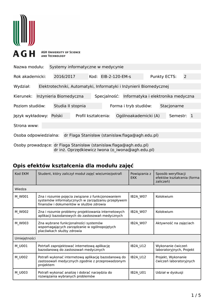Nazwa modułu: Rok akademicki: Wydział: Kierunek: Systemy informatyczne w medycynie 2016/2017 Kod: EIB-2-120-EM-s Punkty ECTS: 2 Elektrotechniki, Automatyki, Informatyki i Inżynierii Biomedycznej Inżynieria Biomedyczna Poziom studiów: Specjalność: Studia II stopnia Język wykładowy: Polski Informatyka i elektronika medyczna Forma i tryb studiów: Profil kształcenia: Stacjonarne Ogólnoakademicki (A) Semestr: 1 Strona www: Osoba odpowiedzialna: dr Flaga Stanisław ([email protected]) Osoby prowadzące: dr Flaga Stanisław ([email protected]) dr inż. Oprzędkiewicz Iwona ([email protected]) Opis efektów kształcenia dla modułu zajęć Kod EKM Student, który zaliczył moduł zajęć wie/umie/potrafi Powiązania z EKK Sposób weryfikacji efektów kształcenia (forma zaliczeń) M_W001 Zna i rozumie pojęcia związane z funkcjonowaniem systemów informatycznych w zarządzaniu przepływem finansów i dokumentów w służbie zdrowia IB2A_W07 Kolokwium M_W002 Zna i rozumie problemy projektowania internetowych aplikacji bazodanowych do zastosowań medycznych IB2A_W07 Kolokwium M_W003 Zna wybrane funkcjonalności systemów wspomagających zarządzanie w ogólnopojętych placówkach służby zdrowia IB2A_W07 Aktywność na zajęciach M_U001 Potrtafi zaprojektować internetową aplikację bazodanową do zastosowań medycznych IB2A_U12 Wykonanie ćwiczeń laboratoryjnych, Projekt M_U002 Potrafi wykonać internetową aplikację bazodanową do zastosowań medycznych zgodnie z przeprowadzonym projektem IB2A_U12 Projekt, Wykonanie ćwiczeń laboratoryjnych M_U003 Potrafi wykonać analizę i dobrać narzędzia do rozwiązania wybranych problemów IB2A_U01 Udział w dyskusji Wiedza Umiejętności 1/5 Karta modułu - Systemy informatyczne w medycynie Matryca efektów kształcenia w odniesieniu do form zajęć Konwersatori um Zajęcia seminaryjne Zajęcia praktyczne Zajęcia terenowe Zajęcia warsztatowe Zna i rozumie pojęcia związane z funkcjonowaniem systemów informatycznych w zarządzaniu przepływem finansów i dokumentów w służbie zdrowia + - - - - - - - - - - M_W002 Zna i rozumie problemy projektowania internetowych aplikacji bazodanowych do zastosowań medycznych + - - - - - - - - - - M_W003 Zna wybrane funkcjonalności systemów wspomagających zarządzanie w ogólnopojętych placówkach służby zdrowia + - - - - - - - - - - M_U001 Potrtafi zaprojektować internetową aplikację bazodanową do zastosowań medycznych - - + - - - - - - - - M_U002 Potrafi wykonać internetową aplikację bazodanową do zastosowań medycznych zgodnie z przeprowadzonym projektem - - + - - - - - - - - M_U003 Potrafi wykonać analizę i dobrać narzędzia do rozwiązania wybranych problemów - - + - - - - - - - - E-learning Ćwiczenia projektowe M_W001 Inne Ćwiczenia laboratoryjne Forma zajęć Ćwiczenia audytoryjne Student, który zaliczył moduł zajęć wie/umie/potrafi Wykład Kod EKM Wiedza Umiejętności Treść modułu zajęć (program wykładów i pozostałych zajęć) Wykład Wprowadzenie do struktury i obiegu dokumentów finansowych i medycznych w ogólnie rozumianej służbie zdrowia oraz zapoznanie studentów z narzędziami informatycznymi do ich obsługi (2 h). Język SQL i zarządzanie relacyjnymi bazami danych: MS SQL Server, Oracle, MySQL (4 h). Aplikacje internetowe w zastosowaniach medycznych – podstawowe technologie i ich wykorzystanie (4). Systemy informatyczne wspomagające pracę placówek służby zdrowia (5 h)1. 2/5 Karta modułu - Systemy informatyczne w medycynie <strong>Zaliczenie wykładu obejmuje samodzielne wykonanie i oddanie projektu</strong> (przykładowy projekt z 2011 r) Domowy skład leków (Apteczka czy bałagan?) <strong>Cel projektu:</strong> racjonalizacja gospodarki lekami w apteczkach domowych. <strong>Narzędzia:</strong> php, MySQL. <strong>Środowisko:</strong> Linux na serwerze student.agh.edu.pl <strong>Interfejs:</strong> przeglądarka internetowa W większości gospodarstw domowych leki różnej maści, kupowane z ordynacji lekarza bądź też w wyniku samoleczenia zalegają różnego rodzaju półki. Niekiedy kupujemy lek, który posiadamy, głównie ze względu na brak wiedzy o stanie posiadania. Dlatego też proponuję zaprojektowanie i wykonanie systemu który, ułatwi pacjentowi zapanowanie nad tym, najczęściej, bałaganem. Ogólnym zadaniem systemu będzie przechowywanie informacji o posiadanych lekach wraz z ich terminami przydatności oraz sugerowanie utylizacji specyfików przeterminowanych. W wersji najbardziej rozwiniętej system powinien móc przechowywać dane kto z rodziny, kiedy i jaki lek przyjmował co znacznie ułatwi w sytuacjach kryzysowych odpowiedzieć na często zadawane pytanie: Jakie i kiedy leki Pani/Pan przyjmował(a)? <strong>Oceniany będzie projekt i jego wykonanie.</strong> Nie będzie można uzyskać oceny pozytywnej bez znajomości działania napisanego kodu źródłowego (odpowiedź ustna). <strong>Aby otrzymać ocenę 3,0</strong> należy zaprojektować i wykonać system umożliwiający: - logowanie wybranych użytkowników wykorzystując mechanizm sesji, - wprowadzanie nowych medykamentów wraz z ich ilościami, cenami i terminami ważności, - notowanie ilościowych rozchodów leków, - informowanie użytkownika po zalogowaniu o lekach które powinny zostać zutylizowane. <strong>Aby otrzymać ocenę 4,0</strong> należy zaprojektować i wykonać system umożliwiający: - realizację wszystkich funkcjonalności na ocenę 3,0, - notowanie nie tylko ilości, ale również kto i kiedy przyjmował dane leki. <strong>Aby otrzymać ocenę 5,0</strong> należy zaprojektować i wykonać system umożliwiający: - realizację wszystkich funkcjonalności na ocenę 4,0, - prezentację podstawowych parametrów statystycznych wykorzystania leków zgromadzonych w apteczce, - prezentację raportu o kosztach leków utylizowanych w wybranych okresach czasu. Ćwiczenia laboratoryjne Obsługa konta i podstawowe wiadomości o systemie L