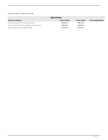Cennik na dzień: 07-03-2017 16:16 Sportowe Nazwa produktu Cena brutto Cena netto Cena poprzednia Gra Xbox One FIFA 17 Edycja Deluxe 229,00 zł 186,18 zł - Gra Xbox One PES Pro Evolution Soccer 2017 209,00 zł 169,92 zł - Kinect Sports Rivals (XBOX ONE) 115,00 zł 93,50 zł - 1/1 Powered by TCPDF (www.tcpdf.org)