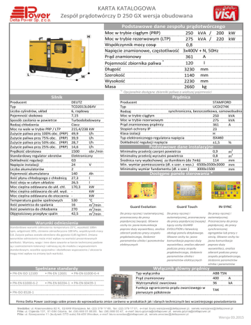 KARTA KATALOGOWA Zespół prądotwórczy D 250 GX wersja obudowana Podstawowe dane zespołu prądotwórczego Moc w trybie ciągłym (PRP) 250 kVA / 200 kW Moc w trybie rezerwowym (LTP) 275 kVA / 220 kW Współczynnik mocy cosϕ 0,8 Napięcie znamionowe, częstotliwość 3x400V + N, 50Hz Prąd znamionowy A 361 * l 120 Pojemność zbiornika paliwa Długość 3230 mm Szerokość 1140 mm Wysokość 2230 mm Masa kg 2660 *) Opcjonalnie dostępne zbiorniki paliwa o wiekszej pojemności Silnik Producent Typ Liczba cylindrów, układ Pojemność skokowa Sposób zasilania w powietrze Rodzaj chłodzenia Moc na wale w trybie PRP / LTP Zużycie paliwa przy 100% obc. (PRP) Zużycie paliwa przy 75% obc. (PRP) Zużycie paliwa przy 50% obc. (PRP) Zużycie paliwa przy 25% obc. (PRP) Prędkość obrotowa Standardowy regulator obrotów Dokładność regulacji Napięcie instalacji Liczba akumulatorów Pojemność akumulatora Ilość płynu chłodzącego z chłodnicą Ilość oleju w całym układzie Moc cieplna oddawana do ukł. chł. Moc cieplna oddawana do ukł. wyd. Moc cieplna oddawana do otoczenia Temperatura gazów spalinowych Ilość powietrza do spalania Ilość powietrza do chłodzenia Objętościowy przepływ spalin Prądnica DEUTZ TCD2013L064V 6, rzędowy 7,15 Turbodoładowany Ciecz 215,4/238,4kW 49,9 l/h 39,9 l/h 28,7 l/h 14,6 l/h 1500 obr./min Elektroniczny G3 24 V 2 140 Ah 27,3 l 26,5 l 170,3 kW kW kW 530 °C 16 m3/min 3 270 m /min 3 42,5 m /min Warunki odniesienia Standardowe warunki odniesienia: temperatura 25°C, wysokość 100m npm, wilgotność 30%, ciśnienie atmosferyczne 100 kPa, współczynnik mocy 0,8. Zużycie paliwa zostało określone dla gęstości 0,85 kg/dm3. Zmiana warunków odniesienia może mieć wpływ na wartości prezentowanych wielkości. Wymiary, waga i inne dane zawarte w karcie technicznej podane są z zastrzeżeniem tolerancji i odnoszą się do modelu z wyposażeniem standardowym; wszelkie opcjonalne i dodatkowe wyposażenie / akcesoria mogą mieć wpływ na zmianę tych wartości. Spełniane standardy • PN-EN ISO 12100 • PN-EN 12601 • PN-EN 61000-6-2 • PN-EN 60204-1 • PN-EN 60439-1 • PN-ISO 8528-1 • PN-EN 61000-6-4 Producent STAMFORD Typ UCDI274K synchroniczna, bezszczotkowa, samowzbudna Rodzaj Moc w trybie ciągłym 250 kVA Moc w trybie rezerwowym 275 kVA Prąd znamionowy prądnicy 361 A Stopień ochrony IP 23 Klasa izolacji H Typ elektronicznego regulatora napięcia SX460 Dokładność regulacji napięcia ±1,5 % Podstawowe dane instalacyjne Minimalny przekrój czerpni powietrza 0,9 Minimalny przekrój wyrzutni powietrza 0,8 Średnica rury wydechowej za tłumikiem (do 7mb) 114 Min. wymiar pomieszczenia (dł. x szer. x wys.) 6500x3500x3000 Minimalny wymiar fundamentu (dł. x szer.) 3000x1500 m2 m2 mm mm mm Dostępne panele sterowania * Guard Evolution Guard Touch IN-SYNC Do pracy ręcznej i automatycznej, przeznaczony do pracy pojedynczej (wyspa). Głowne cechy to: jasna komunikacja poprzez duży wyswietlacz, analiza zdarzeń podczas pracy zespołu prądotwórczego, śledzenie parametrów silnika i parametrów elektrycznych Do pracy ręcznej i automatycznej, przeznaczony do pracy pojedynczej (wyspa). Łączy cechy GUARD EVOLUTION z łatwością obsługi panelu dotykowego. Głowne cechy to: jasna komunikacja poprzez duży wyswietlacz, analiza zdarzeń podczas pracy zespołu prądotwórczego, śledzenie parametrów silnika i parametrów elektrycznych Do pracy ręcznej i automatycznej. Przeznaczony do pracy pojedynczej, do pracy synchronicznej agregatów lub pracy z siecią. Głowne cechy to: jasna komunikacja poprzez duży wyswietlacz, analiza zdarzeń podczas pracy zespołu prądotwórczego, śledzenie parametrów silnika i parametrów Wyłącznik główny prądnicy Typ wyłącznika Prąd znamionowy Wytrzymałość zwarciowa Funkcja ograniczenia prądu zwarciowego w pierwszym półokresie ABB T5N 400 A 36 kA TAK Firma Delta Power zastrzega sobie prawo do wprowadzania zmian zarówno w produktach jak i danych technicznych bez wcześniejszego powiadamiania Wersja 03.2015