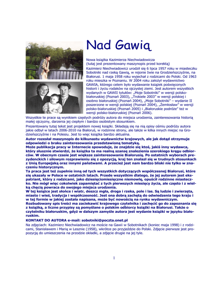 Nad Gawią Nowa książka Kazimierza Niechwiadowicza (tutaj jest prezentowany maszynopis przed korektą) Kazimierz Niechwiadowicz urodził się 6 lipca 1957 roku w miasteczku Sobotniki nad rzeką Gawią, w rejonie Iwie na Grodzieńszczyźnie, na Białorusi. 1 maja 1958 roku wyjechał z rodzicami do Polski. Od 1963 roku mieszka w Poznaniu. W 2004 roku założył wydawnictwo GAWIA, którego celem było wydawanie książek poświęconych historii i życiu rodaków na ojczystej ziemi. Jest autorem wszystkich wydanych w GAWII tytułów: „Moje Sobotniki” w wersji polskobiałoruskiej (Poznań 2003), „Trokiele 2003” w wersji polskiej i osobno białoruskiej (Poznań 2004), „Moje Sobotniki” – wydanie II poszerzone w wersji polskiej (Poznań 2004), „Żemłosław” w wersji polsko-białoruskiej (Poznań 2005) i „Białoruskie podróże” też w wersji polsko-białoruskiej (Poznań 2006). Wszystkie te prace są wynikiem częstych podróży autora do miejsca urodzenia, zainteresowania historią małej ojczyzny, darzenia jej ciepłym i bardzo osobistym stosunkiem. Prezentowany tutaj tekst jest projektem nowej książki. Składają się na nią opisy ośmiu podróży autora jakie odbył w latach 2006-2010 na Białoruś, w rodzinne strony, ale także w kilka innych miejsc na Grodzieńszczyźnie i na Polesiu. Jest to więc książka bardzo aktualna. Autor rozesłał maszynopis do kilkunastu wydawnictw krajowych, ale jak dotąd otrzymuje odpowiedzi o braku zainteresowania przedstawioną tematyką. Może publikacja pracy w Internecie spowoduje, że znajdzie się ktoś, jakiś inny wydawca, który słusznie stwierdzi, że książka ta ma realną szansę znalezienia szerokiego kręgu odbiorców. W obecnym czasie jest większe zainteresowanie Białorusią. Po ostatnich wyborach prezydenckich i siłowym rozprawieniu się z opozycją, kraj ten znalazł się w trudnych stosunkach z Unią Europejską oraz innymi państwami. A przecież jest nam bardzo bliski nie tylko w znaczeniu historycznym. Ta praca jest też zupełnie inną od tych wszystkich dotyczących współczesnej Białorusi, które się ukazały w Polsce w ostatnich latach. Przede wszystkim dlatego, że jej autorem jest ekspatriant, który z rodzicami, jako dziesięciomiesięczne niemowlę, opuścił rodzinne miasteczko. Nie mógł więc cokolwiek zapamiętać z tych pierwszych miesięcy życia, ale często i z wielką chęcią powraca do swojego miejsca urodzenia. W tej książce jest słońce i wiatr, deszcz mgła, droga i rzeka, pole i las. Są ludzie i zwierzęta, miasto i wieś, tradycja i współczesność. Jest ona dobrą zachętą do odwiedzenia tego kraju i w tej formie w jakiej została napisana, może być nowością na rynku wydawniczym. Rozbudowany spis treści ma zaciekawić krajowego czytelnika i zachęcić go do zapoznania się z książką, a liczne przypisy są pomyślane o polskim odbiorcy książki na Białorusi. Także o czytelniku białoruskim, gdyż w dalszym zamyśle autora jest wydanie książki w języku białoruskim. KONTAKT DO AUTORA e-mail: [email protected] Na zdjęciach: Kazimierz Niechwiadowicz na moście na Gawii w Sobotnikach (koniec maja 1998) i z rodzicami, Stanisławem i Marią w Lesznie (1958), wkrótce po przyjeździe do Polski. Zdjęcie pierwsze jest propozycją do umieszczenia na przodzie okładki, a zdjęcie drugie na jej tyle. 1 Nad Gawią Kazimierz Niechwiadowicz „Ludzie żyją koło rzek i jezior, ale wiedzą o nich tylko 10-15 km, a więcej absolutnie nic. Nawet jak rzeka płynie, skąd zaczyna się i gdzie wpada. Tylko rybak powie, że Wilia wpada do Niemna w Kownie”. Józef Rusakiewicz z Dowgiałowszczyzny Kocham cię Gawio Stoję często nad moją Gawią, dziewczyna z warkoczem z książką pod pachą. Wędruję brzegiem i myślę, skąd i dokąd płynie. Kocham cię Gawio, kiedy rozlewasz wody jak okiem sięgnąć i szalejesz jak burza. Kiedy jesteś łagodnie przyjazna, wierzby i olchy w zadumie do ciebie się tulą, dawne dzieje las opowiada. Przychodzę z daleka na żabi i ptasi koncert. Próbuję uczesać myśli i uczucia na gałązkach czasu, nad moją Gawią. Irena Hryncewicz1 2 Wstęp Ta książka jest kontynuacją opisu mojej ziemi rodzinnej, miasteczka i gminy Sobotniki nad rzeką Gawią w rejonie2 Iwie, w obwodzie3 grodzieńskim na Białorusi. Grodzieńszczyzna jest spadkobierczynią Nowogródczyzny, a obecny rejon Iwie jest częścią przedwojennego powiatu lidzkiego. W swojej wielowiekowej historii Sobotniki najdłużej należały do powiatu oszmiańskiego województwa Wileńskiego, utworzonego w 1413 roku w Wielkim Księstwie Litewskim. Od 1569 roku znalazły się w Rzeczypospolitej Obojga Narodów i w prawie niezmienionej strukturze administracyjnej (Oszmiana – powiat, Wilno – województwo, gubernia) przetrwały do 1921 roku. 19 lutego tego roku zostało utworzone województwo Nowogródzkie w odrodzonym państwie polskim, a w jednym z jego powiatów w Wołożynie znalazła się gmina Sobotniki. W 1926 roku przeprowadzono reformę administracyjną Polski i z dniem 22 stycznia nasza gmina została przydzielona do powiatu lidzkiego. Ten stan trwał do dnia 17 września 1939 roku, do zajęcia Kresów Wschodnich przez bolszewików. Od dnia 15 stycznia 1940 roku Sobotniki znajduj się w rejonie iwiejskim, znacznie mniejszym niż przedwojenny lidzki. Nasza gmina leży tuż przy Litwie i za graniczną miedzą ma gminę Dziewieniszki. Po stronie białoruskiej sąsiadują z nią gminy: Gieraniony, Lipniszki, Iwie, Juraciszki i Traby. Ziemie te w swej dawnej historii związane były z takimi postaciami jak król Zygmunt August, Barbara Radziwiłł, z rodami Gasztoldów, Kiszków i Radziwiłłów, z polskimi Tatarami, z arianami - Braćmi Litewskimi, a w bliższych nam czasach z Józefem Piłsudskim. Część tych ziem łączy rzeka Gawia, która swój początek bierze w okolicy niewielkiej wioski Dzijaki tuż za Łukszanami. Jest to na północ od Dziewieniszek, ale po stron
