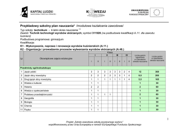 Przykładowy szkolny plan nauczania* /modułowe kształcenie zawodowe/ Typ szkoły: technikum - 4-letni okres nauczania /1/ Zawód: Technik technologii wyrobów skórzanych; symbol 311926 (na podbudowie kwalifikacji A.11. dla zawodu: kuśnierz) Podbudowa programowa: gimnazjum Kwalifikacje: K1 - Wykonywanie, naprawa i renowacja wyrobów kuśnierskich (A.11.) K2 - Organizacja i prowadzenie procesów wytwarzania wyrobów skórzanych (A.46.) Klasa II I III IV I II I II I II I II Liczba godzin tygodniowo w czteroletnim okresie nauczania 1 Język polski 3 3 3 3 3 3 2 4 12 360 2 Język obcy nowożytny 2 2 2 2 3 3 1 4 9,5 285 3 Drugi język obcy nowożytny 1 1 1 1 1 1 1 4 5,5 165 4 Wiedza o kulturze 1 1 1 30 5 Historia 2 2 2 60 6 Wiedza o społeczeństwie 1 1 1 30 7 Podstawy przedsiębiorczości 1 1 2 60 8 Geografia 1 1 1 30 9 Biologia 1 1 1 30 10 Chemia 1 1 1 30 11 Fizyka 1 1 1 30 Lp Obowiązkowe zajęcia edukacyjne Liczba godzin w czteroletnim okresie nauczania Przedmioty ogólnokształcące 1 1 1 Projekt „Szkoła zawodowa szkołą pozytywnego wyboru” współfinansowany przez Unię Europejską w ramach Europejskiego Funduszu Społecznego 2 300 1 30 12 360 1 30 1 4 120 10 20 65 1950 2 2 6 8 240 1 1 1 3 6 180 2 2 2 2 4 120 5 5 5 11 18 540 8 240 21 630 9 270 12 360 50 1500 133 3990 2 2 13 Informatyka 1 1 14 Wychowanie fizyczne 3 3 15 Edukacja dla bezpieczeństwa 1 1 16 Zajęcia z wychowawcą 1 1 1 1 1 1 1 23 23 13 13 14 14 2 2 2 2 2 Łączna liczba godzin 2 10 12 Matematyka 3 3 3 3 3 3 2 4 3 3 Przedmioty realizowane w zakresie rozszerzonym oraz uzupełniające 1 Chemia 2 Matematyka 1 1 3 Historia i społeczeństwo - przedmiot uzupełniający Łączna liczba godzin 1 1 9 7 4 4 Modułowe kształcenie zawodowe 1 M1 Przygotowanie do prowadzenia działalności usługowej 2 M2 Wytwarzanie wyrobów kuśnierskich 2 18 18 3 M3 Wykonywanie renowacji wyrobów kuśnierskich 4 11 7 4 M4 Organizowanie procesów wytwarzania wyrobów skórzanych Łączna liczba godzin kształcenia zawodowego Tygodniowy wymiar godzin obowiązkowych zajęć edukacyjnych 9 9 33 18 35 18 15 8 16 15 16 34 31 0 /1/ do celów obliczeniowych przyjęto 30 tygodni w ciągu jednego roku szkolnego *w szkolnym planie uwzględnia się również wymiar godzin zajęć określonych w par. 4 ust. 2 rozporządzenia w sprawie ramowych planów nauczania, t.j. m.in. religii lub etyki oraz wychowania do życia w rodzinie. 2 Projekt „Szkoła zawodowa szkołą pozytywnego wyboru” współfinansowany przez Unię Europejską w ramach Europejskiego Funduszu Społecznego Wymiar praktyk zawodowych tyg. godz. kl. I - zgodnie z podstawą programową 0 kl. II - zgodnie z podstawą programową 0 kl. III - zgodnie z podstawą programową 4 kl. IV - zgodnie z podstawą programową 160 0 Razem 4 160 Egzamin potwierdzający pierwszą kwalifikację (A.11.) odbywa się pod koniec klasy trzeciej. Egzamin potwierdzający drugą kwalifikację (A.46.) odbywa się pod koniec pierwszego semestru klasy czwartej. 3 Projekt „Szkoła zawodowa szkołą pozytywnego wyboru” współfinansowany przez Unię Europejską w ramach Europejskiego Funduszu Społecznego Tabela efektów kształcenia Tabela przyporządkowania poszczególnym modułom efektów kształcenia dla zawodu: I semestr IV II semestr I semestr III II semestr I semestr II II semestr Uczeń: I semestr Efekty kształcenia /umiejętności, wiedza oraz kompetencje personalne i społeczne/ I II semestr Liczba godzin przeznaczona na realizację efektów kształcenia klasa Efekty wspólne dla wszystkich zawodów / wspólne dla zawodów w ramach obszaru A / kwalifikacje Numer i nazwa jednostki modułowej Numer i nazwa modułu Technik technologii wyrobów skórzanych; symbol 311926 (na podbudowie kwalifikacji A.11. dla zawodu: kuśnierz) BHP(2) rozróżnia zadania i uprawnienia instytucji oraz służb działających w zakresie ochrony pracy i ochrony środowiska w Polsce; 25 X X BHP(4) przewiduje zagrożenia dla zdrowia i życia człowieka oraz mienia i środowiska związane z wykonywaniem zadań zawodowych; BHP(5) określa zagrożenia związane z występowaniem szkodliwych czynników w środowisku pracy; BHP X BHP(3) określa prawa i obowiązki pracownika oraz pracodawcy w zakresie bezpieczeństwa i higieny pracy; X 311926 M1(753106)J1 Przestrzeganie zasad bezpieczeństwa i higieny pracy BHP(1) rozróżnia pojęcia związane z bezpieczeństwem i higien ochroną przeciwpożarową, ochroną środowiska i ergonomią; X 311926(753106) M1 Przygotowanie do prowadzenia działalności usługowej Kształcenie modułowe 4 Projekt „Szkoła zawodowa szkołą pozytywnego wyboru” współfinansowany przez Unię Europejską w ramach Europejskiego Funduszu Społecznego X BHP(6) określa skutki oddziaływania czynników szkodliwych na organizm człowieka; X BHP(7) organizuje stanowisko pracy zgodnie z obowiązującymi wymaganiami ergonomii, przepisami bezpieczeństwa i higieny pracy, ochrony przeciwpożarowej i ochrony środowiska; X BHP(8) stosuje środki ochrony indywidualnej i zbiorowej podczas wykonywania zadań zawodowych; X BHP(9) przestrzega zasad bezpieczeństwa i higieny pracy oraz stosuje przepisy prawa dotyczące ochrony przeciwpożarowej i ochrony środowiska; BHP(10) udziela pierwszej pomocy poszkodowanym w wypadkach przy pracy oraz w stanach zagrożenia zdrowia i życia. X 311926.M1(753106)J3 Podejmowanie i prowadzenie działalności usługowej 31192(753106) M1.J2 Wykonywanie rysunku zawodowego Łączna liczba godzin przeznaczona na jednostkę modułową M1.J1 KPS(2) jest kreatywny i konsekwentny w realizacji zadań; KPS KPS(4) jest otwarty na zmiany; KPS(7) przestrzega tajemnicy zawodowej; X X PKZ(A.e)(1) wykonuje rysunki wyrobów skórzanych; PKZ(A.e)(8) odczytuje oznaczenia i symbole stosowane w rysunkach X X PKZ(A.e) technicznych; PKZ(A.e)(11) stosuje programy komputerowe wspomagające wykonywanie X X zadań; Łączna liczba godzin przeznaczona na jednostkę modułową M1.J2 KPS(1) przestrzega zasad kultury i etyk