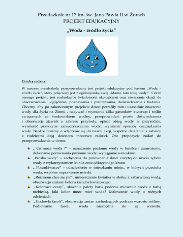 Przedszkole nr 17 im. św. Jana Pawła II w Żorach PROJEKT EDUKACYJNY „Woda - źródło życia” Drodzy rodzice! W naszym przedszkolu przeprowadzany jest projekt edukacyjny pod hasłem „Woda – źródło życia”, który połączony jest z ogólnopolską akcją „Mamo, tato wolę wodę!”. Celem naszego projektu jest rozbudzenie świadomości ekologicznej oraz stwarzanie okazji do obserwowania i oglądania, poznawania i przeżywania, doświadczania i badania. Chcemy, aby po zakończonym projekcie dzieci potrafiły min.: uzasadnić znaczenie wody dla życia na Ziemi, , nazywać i wymienić kilka gatunków zwierząt i roślin związanych ze środowiskiem wodny, przeprowadzić proste doświadczenia i obserwacje zjawisk z zakresu przyrody, opisać obieg wody w przyrodzie, wymienić przyczyny zanieczyszczania wody, wymienić sposoby oszczędzania wody. Bardzo prośmy o włączenie się do naszej akcji, wspólne działania i zabawy z rodzicami dają dzieciom mnóstwo radości. Oto propozycje zadań do przeprowadzenia w domu: „ Co może woda ?” – oznaczenie poziomu wody w butelce i zamrożenie, dokonanie porównania poziomu wody, wyciąganie wniosków. „Prośba wody” – zachęcenia do porównania ilości zużytej do mycia zębów wody z wykorzystaniem kubka oraz odkręconego kranu. „ Poszukiwacze” – odnalezienie w mieszkaniu miejsc, w których przecieka woda, wspólne naprawienie usterki. „Roślinom chce się pić”, umieszczenie kwiatka w słoiku z zabarwioną wodą, obserwacja zmiany koloru kielicha kwiatowego. „Kolorowe czary”, ukazanie palety barw podczas mieszania wody z farbą niebieską. Jaki kolor może mieć woda? Malowanie wody o różnych odcieniach. „Hodowla fasoli”, obserwacja zmian zachodzących podczas wzrostu rośliny. Podlewanie fasoli, woda niezbędna do jej wzrostu.