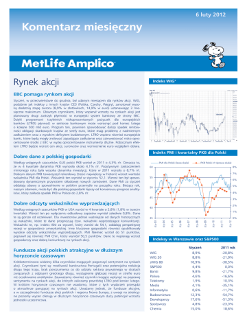 6 luty 2012 Komentarz miesięczny Rynek akcji Indeks WIG* EBC pomaga rynkom akcji Styczeń, w przeciwieństwie do grudnia, był udanym miesiącem dla rynków akcji. WIG, podobnie jak indeksy z innych krajów CE3 (Polska, Czechy, Węgry), zanotował wysoką dodatnią stopę zwrotu (8,9% w złotówkach, 14,9% w euro) ustanawiając 3 miesięczne maksimum. Głównym czynnikiem, który wspierał wzrosty na rynkach akcji jest planowany drugi zastrzyk płynności w europejski system bankowy ze strony EBC. Dzięki programowi trzyletnich niskoprocentowych pożyczek dla europejskich banków (LTRO) płynność w sektorze bankowym może wzrosnąć pod koniec lutego o kolejne 500 mld euro. Program ten, powinien spowodować dalszy spadek rentowności obligacji skarbowych krajów ze strefy euro, które mają problemy z nadmiernym zadłużeniem oraz z wysokim deficytem budżetowym. LTRO wspiera również europejskie banki, które będą mogły zrolować zapadające zadłużenie oraz zainwestować nisko oprocentowane środki z EBC w wyżej oprocentowane instrumenty dłużne. Pobocznym efektem LTRO będzie wzrost cen akcji, surowców oraz wzmocnienie euro względem dolara. Indeks PMI i kwartalny PKB dla Polski Dobre dane z polskiej gospodarki Według wstępnych szacunków GUS polski PKB wzrósł w 2011 o 4,3% r/r. Oznacza to, że w 4 kwartale dynamika PKB wynosiła około 4,1% r/r. Pozytywnym zaskoczeniem minionego roku była wysoka dynamika inwestycji, które w 2011 wzrosły o 8,7% r/r. Dobrym danym PKB towarzyszył rekordowy (trzeci największy w historii) wzrost wartości wskaźnika PMI dla Polski. Wskaźnik ten wyniósł w styczniu 52,1. Wzrost ten był spowodowany dynamicznym przyrostem składowej nowych zamówień. Dane PMI za styczeń oddalają obawy o spowolnienie w polskim przemyśle na początku roku. Bieżący rok, naszym zdaniem, może być dla polskiej gospodarki lepszy od konsensusu prognoz analityków, który zakłada spadek PKB w Polsce do 2,8% r/r. PMI dla Polski (lewa skala) PKB Polski r/r (prawa skala) 8% 60 7% 55 6% 5% 50 4% 45 3% Dobre odczyty wskaźników wyprzedzających Fundusze akcji polskich atrakcyjne w dłuższym horyzoncie czasowym Krótkoterminowo widzimy kilka czynników mogących pogorszyć sentyment na rynkach akcji. Czynnikami tymi są: możliwość bankructwa Portugalii oraz potencjalna redukcja długu tego kraju, brak porozumienia co do udziału sektora prywatnego w stratach związanych z odpisami greckiego długu, wystąpienie głębszej recesji w strefie euro niż oczekiwania analityków. Zauważamy również czynniki mogące wpłynąć na poprawę sentymentu na rynkach akcji, do których zaliczamy powtórkę LTRO pod koniec lutego. W krótkim horyzoncie czasowym nie wiadomo, które z tych wydarzeń przesądzi o atmosferze panującej na rynkach akcji. Uważamy jednak, że fundusze akcyjne, a w szczególności fundusze akcji polskich i regionu Nowa Europa, z uwagi na atrakcyjne poziomy wycen oferują w dłuższym horyzoncie czasowym duży potencjał wzrostu jednostki uczestnictwa. 2% 40 1% st y-12 st y-11 st y-10 st y-09 st y-08 st y-07 st y-06 st y-05 0% st y-04 35 st y-03 Według wstępnych szacunków PKB w USA wzrósł w 4 kwartale o 2,8% (1,8% w trzecim kwartale). Wzrost ten po wyłączeniu odbudowy zapasów wyniósł zaledwie 0,8%. Dane te są gorsze od oczekiwań. Dla inwestorów jednak ważniejsze od danych historycznych są wskaźniki, które te dane prognozują (tzw. wskaźniki wyprzedzające koniunkturę). Wskaźniki te, np. indeks ISM za styczeń, który wzrósł do 54,1, oddalają perspektywę recesji w gospodarce amerykańskiej. Inne kluczowe gospodarki również opublikowały wysokie odczyty wskaźników wyprzedzających. PMI Niemiec wzrósł do 51 punktów, poprawił się również PMI Chin, który wyniósł 50,5 punktów. Dane te wspierają wzrost gospodarczy oraz dobrą koniunkturę na rynkach akcji. Indeksy w Warszawie oraz S&P500 WIG WIG 20 sWIG 80 S&P500 Banki Paliwa Telekomy Media Informatyka Budownictwo Deweloperzy Spo¿ywczy Chemia Styczeñ 2011 rok 8,9% 8,8% 10,9% 4,4% 9,8% 4,6% 1,9% 4,1% 0,6% 12,3% 17,6% 4,8% 15,0% -20,8% -21,9% -30,5% 0,0% -21,7% -16,6% 10,3% -35,1% -11,7% -54,7% -51,3% -23,3% 18,6% 6 luty 2012 Komentarz miesięczny Rynek długu Kurs obligacji DS1020* Gwałtowne spadki rentowności i wzrosty cen obligacji Indeks obligacji Citigroup Poland GBI wzrósł w styczniu o 1,51%. Największe wzrosty - prawie 3% - zanotował sektor 10+ czyli obligacje o terminach zapadalności powyżej 10 lat. Najsłabiej wypadł natomiast sektor 1-3, czyli obligacje o terminach zapadalności od 1 do 3 lat, zyskując 0,60%. W styczniu mogliśmy zaobserwować gwałtowne spadki rentowności praktycznie na wszystkich rynkach, zarówno EM, czyli krajów zaliczanych do tzw. rynków wschodzących, jak i krajów rozwiniętych w tym strefy euro. Poza jednym wyjątkiem, a mianowicie Portugalii, rentowności w krajach strefy euro wróciły do poziomów przedkryzysowych. Wydaje się, że jest to reakcja rynków na program europejskiego banku centralnego (LTRO), który w praktyce oferuje bankom nieograniczone tanie finansowanie na 3 lata. Część tych środków popłynęła na rynki w poszukiwaniu zysku. Wracając na rodzimy rynek obligacji, to w roku 2012 w dalszym ciągu oczekujemy spadku inflacji poniżej 4% średniorocznie i spowolnienia PKB do 3% i obniżki stóp procentowych. Te warunki będą wspierać rynek długu jednak trudno oczekiwać dalszego tak dynamicznego spadku rentowności. Spadek rentowności obligacji 10-letnich do 5,5% obniża oczekiwaną stopę zwrotu z funduszy obligacyjnych opartych na obligacjach skarbowych do poniżej 5%. Mimo, że nie wykluczamy dalszego spadku rentowności na skutek programu LTRO, to nie jest to nasz główny scenariusz rozwoju sytuacji. Oferta produktowa Subfundusze Amplico Parasola Krajowego Subfundusze Amplico Parasola Światowego Pieniężny Lokacyjny Obligacji Obligacji Plus Aktywnej Alokacji Obligacji Światowych