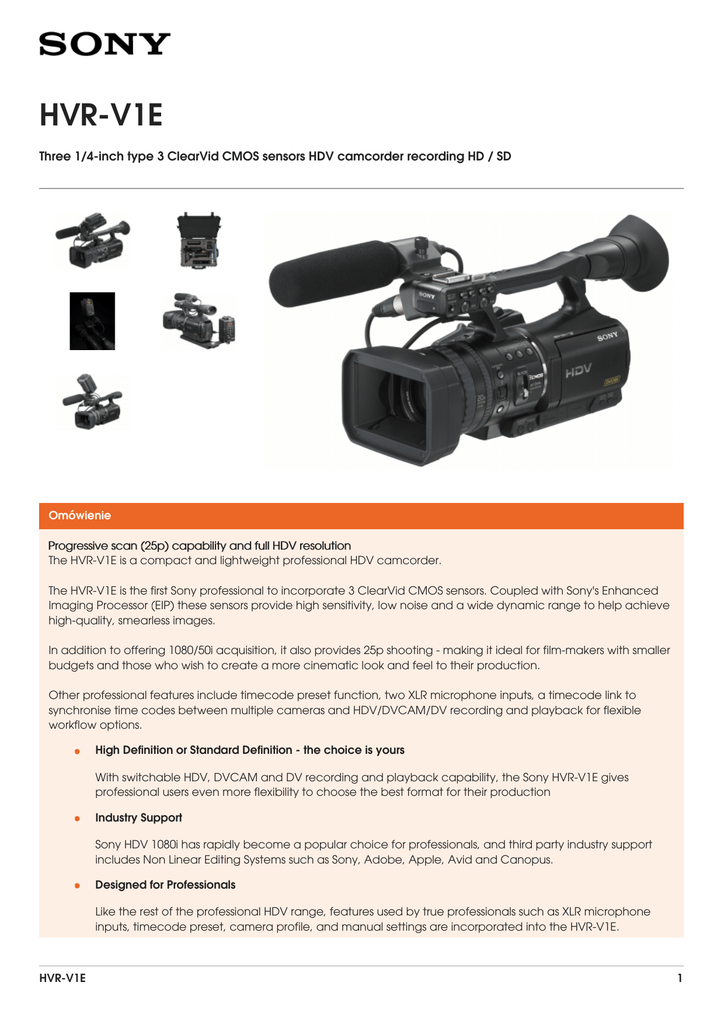 HVR-V1E Three 1/4-inch type 3 ClearVid CMOS sensors HDV camcorder recording HD / SD Omówienie Progressive scan (25p) capability and full HDV resolution The HVR-V1E is a compact and lightweight professional HDV camcorder. The HVR-V1E is the first Sony professional to incorporate 3 ClearVid CMOS sensors. Coupled with Sony's Enhanced Imaging Processor (EIP) these sensors provide high sensitivity, low noise and a wide dynamic range to help achieve high-quality, smearless images. In addition to offering 1080/50i acquisition, it also provides 25p shooting - making it ideal for film-makers with smaller budgets and those who wish to create a more cinematic look and feel to their production. Other professional features include timecode preset function, two XLR microphone inputs, a timecode link to synchronise time codes between multiple cameras and HDV/DVCAM/DV recording and playback for flexible workflow options. • High Definition or Standard Definition - the choice is yours With switchable HDV, DVCAM and DV recording and playback capability, the Sony HVR-V1E gives professional users even more flexibility to choose the best format for their production • Industry Support Sony HDV 1080i has rapidly become a popular choice for professionals, and third party industry support includes Non Linear Editing Systems such as Sony, Adobe, Apple, Avid and Canopus. • Designed for Professionals Like the rest of the professional HDV range, features used by true professionals such as XLR microphone inputs, timecode preset, camera profile, and manual settings are incorporated into the HVR-V1E. HVR-V1E 1 • Long Recording Times Using the Sony Digital Master tapes, recording times of 63 minutes are achievable in HDV mode. • Compatible with existing HDV equipment & software Because the HVR-V1E's 25p scan signal is recorded as a 50i signal (by dividing each frame into two fields) it can be played back or fed to an editing suite using the thousands of Sony professional HDV equipment already in use throughout the world. HVR-V1E 2 Funkcje • HDV/DVCAM/DV The HVR-V1E supports recording and playback of HDV 1080i, DVCAM and DV. • 3 ClearVid CMOS Sensors The HVR-V1E is the first Sony professional camcorder to feature three ClearVid CMOS Sensors. Coupled with Sony's Enhanced Imaging Processor (EIP), these sensors provide high sensitivity, low noise and a wide dynamic range to achieve high-quality images. The ClearVid CMOS Sensor also eradicates picture smear and has 4 times high speed scanning capability enabling 'Smooth Slow Rec' function. • 20 x Optical Zoom Carl Zeiss Vario-Sonnar T* Lens The Carl Zeiss Vario-Sonnar T* Lens features Extra-low Dispersion (ED) Glass and a 20x optical zoom lens with F2.8 at the tele-photo end for greater light sensitivity and long-range image acquisition for maximum shooting flexibility. • 2 x XLR Microphone Inputs For enhanced audio options • Down-conversion Like the other Sony professional HDV camcorders, users can choose to shoot in HDV and then down-convert to DVCAM via the camcorder. • 3.5" Clear Photo LCD For image monitoring • Timecode Options Including preset and synchronisation. • HDMI Output For direct interface with HD ready consumer displays. HVR-V1E 3 Akcesoria Baterie i zasilacze HVL-LBPA Lampa LED zasilana akumulatorowo 2NP-F970/B Info-Lithium Battery Twin Pack HVL-LBPB Lampa LED do montaż u na kamerze ACC-L1BP Zasilacz prądu przemiennego/ładowarka i akumulator AC-VQ1050B Piloty Zasilacz prądu przemiennego/ładowarka RM-1BP Pilot LANC AC-VQL1BP Inteligentna poczwórna ładowarka do akumulatorów i podwójny zasilacz prądu przemiennego Słuchawki MDR-7506 NP-F570 Profesjonalne słuchawki stereofoniczne Akumulator InfoLITHIUM MDR-7510 NP-F770 Profesjonalne słuchawki studyjne Akumulator InfoLITHIUM MDR-7520 Wysokiej jakości profesjonalne słuchawki studyjne HVR-V1E 4 NP-F970 Akumulator InfoLITHIUM Statywy i podpórki VCT-1BP Uchwyt do mocowania akcesoriów z tyłu kamery HDV i DVCAM VCT-PG11RMB HVR-DR60 Statyw Przenośny rejestrator z dyskiem twardym VCT-SP1BP HVR-MRC1K Extendable Monopod Camcorder Support System Kompaktowy rejestrator flash HDV VCT-SP2BP Wielofunkcyjna podpórka naramienna do kamer wideo Mikrofon kierunkowy ECM-673 Short Shotgun Electret Condenser Microphone. Torby i osłony LCH-GT1BP ECM-674 Affordable shotgun Electret condenser microphone Torba podróż na o sztywnych ściankach LCS-BP1BP ECM-678 Miękka torba plecakowa Shotgun Electret condenser microphone LCS-G1BP Miękka torba HVR-V1E 5 ECM-680S Kierunkowy, stereofoniczny (MS), pojemnościowy mikrofon elektretowy Wizjery SH-L35WBP Osłona na ekran LCD ECM-VG1 Shotgun Electret condenser microphone Zestawy przenośnych mikrofonów analogowych Miksery dźwięku i wzmacniacze AV DMX-P01 UWP-V2 Zestaw mikrofonu bezprzewodowego UWP Przenośny cyfrowy mikser audio UWP-V6 Monitory produkcyjne LCD Zestaw mikrofonu bezprzewodowego UWP z mocowaniem do paska i nadajnikiem podłączanym do złącza XLR LPM-770BP 7-calowy przenośny monitor LCD do uż ytku w terenie Oświetlenie © 2016 Sony Corporation. Wszystkie prawa zastrzeżone. Zabrania się reprodukcji całości lub fragmentów niniejszej publikacji bez pisemnego zezwolenia. Cechy i dane techniczne mogą ulec zmianie. Waga i wymiary są podane w przybliżeniu. Wszystkie znaki towarowe stanowią własność odpowiednich właścicieli. HVR-V1E 6