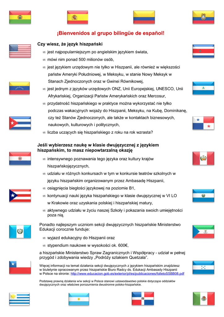 ¡Bienvenidos al grupo bilingüe de español! Czy wiesz, że język hiszpański • jest najpopularniejszym po angielskim językiem świata, • mówi nim ponad 500 milionów osób, • jest językiem urzędowym nie tylko w Hiszpanii, ale również w większości państw Ameryki Południowej, w Meksyku, w stanie Nowy Meksyk w Stanach Zjednoczonych oraz w Gwinei Równikowej, • jest jednym z języków urzędowych ONZ, Unii Europejskiej, UNESCO, Unii Afrykańskiej, Organizacji Państw Amerykańskich oraz Mercosur, • przydatność hiszpańskiego w praktyce można wykorzystać nie tylko podczas wakacyjnych wojaży do Hiszpanii, Meksyku, na Kubę, Dominikanę, czy też Stanów Zjednoczonych, ale także w kontaktach biznesowych, naukowych, kulturowych i politycznych, • liczba uczących się hiszpańskiego z roku na rok wzrasta? Jeśli wybierzesz naukę w klasie dwujęzycznej z językiem hiszpańskim, to masz niepowtarzalną okazję • intensywnego poznawania tego języka oraz kultury krajów hiszpańskojęzycznych, • udziału w różnych konkursach w tym w konkursie teatrów szkolnych w języku hiszpańskim organizowanym przez Ambasadę Hiszpanii, • osiągnięcia biegłości językowej na poziomie B1, • kontynuacji nauki języka hiszpańskiego w klasie dwujęzycznej w VI LO w Krakowie oraz uzyskania polskiej i hiszpańskiej matury, • aktywnego udziału w życiu naszej Szkoły i pokazania swoich umiejętności poza nią. Ponadto najlepszym uczniom sekcji dwujęzycznych hiszpańskie Ministerstwo Edukacji corocznie funduje: • wyjazd edukacyjny do Hiszpanii oraz • stypendium naukowe w wysokości ok. 600€, a hiszpańskie Ministerstwo Spraw Zagranicznych i Współpracy - udział w pełnej przygód i zdobywania wiedzy „Podróży szlakiem Quetzala”. Więcej informacji na temat działania sekcji dwujęzycznych z językiem hiszpańskim znajdziesz w biuletynie opracowanym przez hiszpańskie Biuro Radcy ds. Edukacji Ambasady Hiszpanii w Polsce na stronie: http://www.educacion.gob.es/exterior/pl/es/publicaciones/folletoSSBB08.pdf Podstawę prawną działania w/w sekcji w Polsce stanowi ustawodawstwo polskie dotyczące oddziałów dwujęzycznych oraz właściwe porozumienia dwustronne polsko-hiszpańskie.