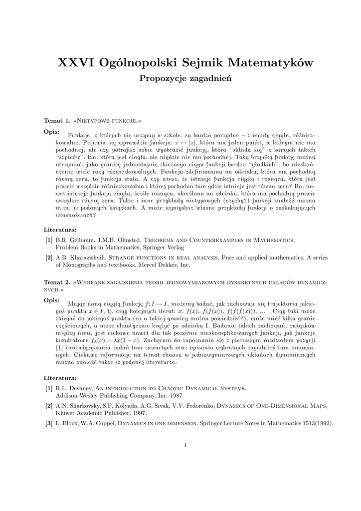 XXVI Ogólnopolski Sejmik Matematyków Propozycje zagadnień Temat 1. »Nietypowe funkcje.« Opis: Funkcje, o których się uczymy w szkole, są bardzo porządne – z reguły ciągłe, różniczkowalne. Pojawia się wprawdzie funkcja: x 7→ |x|, która ma jeden punkt, w którym nie ma pochodnej, ale czy potrafisz sobie wyobrazić funkcję, która “składa się” z samych takich “szpiców”, tzn. która jest ciagła, ale nigdzie nie ma pochodnej. Taką brzydką funkcję można otrzymać, jako granicę jednostajnie zbieżnego ciągu funkcji bardzo “gładkich”, bo nieskończenie wiele razy różniczkowalnych. Funkcja zdefiniowana na odcinku, która ma pochodną równą zeru, to funkcja stała. A czy wiesz, że istnieje funkcja ciągła i rosnąca, która jest prawie wszędzie różniczkowalna i której pochodna tam gdzie istnieje jest równa zeru? Ba, nawet istnieje funkcja ciagła, ściśle rosnąca, określona na odcinku, która ma pochodną prawie wszędzie równą zeru. Takie i inne przykłady nietypowych (czyżby?) funkcji znaleźć mozna m.in. w podanych książkach. A może wymyslisz własne przykłady funkcji o zaskakujących własnościach? Literatura: [1] B.R. Gelbaum, J.M.H. Olmsted, Theorems and Counterexamples in Mathematics, Problem Books in Mathematics, Springer Verlag [2] A.B. Kharazishvili, Strange functions in real analysis, Pure and applied mathematics, A series of Monographs and textbooks, Mercel Dekker, Inc. Temat 2. »Wybrane zagadnienia teorii jednowymiarowych dyskretnych układów dynamicznych.« Opis: Mając daną ciągłą funkcję f : I → I, możemy badać, jak zachowuje się trajektoria jakiegoś punktu x ∈ I, tj. ciąg kolejnych iterat: x, f (x), f (f (x)), f (f (f (x))), ... . Ciąg taki może zbiegać do jakiegoś punktu (co o takiej granicy można powiedzieć?), może mieć kilka granic częściowych, a może chaotycznie krążyć po odcinku I. Badanie takich zachowań, związków między nimi, jest ciekawe nawet dla tak pozornie nieskomplikowanych funkcji, jak funkcje kwadratowe fλ (x) = λx(1 − x). Zachęcam do zapoznania się z pierwszym rozdziałem pozycji [1] i rozwiązywania zadań tam zawartych oraz opisania wybranych zagadnień tam omawianych. Ciekawe informacje na temat chaosu w jednowymiarowych układach dynamicznych można znaleźć także w podanej literaturze. Literatura: [1] R.L. Devaney, An introduction to Chaotic Dynamical Systems, Addison-Wesley Publishing Company, Inc. 1987 [2] A.N. Sharkovsky, S.F. Kolyada, A.G. Sivak, V.V. Fedorenko, Dynamics of One-Dimensional Maps, Kluwer Academic Publisher, 1997, [3] L. Block, W.A. Coppel, Dynamics in one dimension, Springer Lecture Notes in Mathematics 1513(1992). 1 Temat 3. »Geometria w geografii« Opis: Dwie starożytne nauki geografia (opisywanie Ziemi) i geometria (mierzenie ziemi) obecnie nauczane są w szkole jako różne i dosyć odległe przedmioty. A jednak łączy je znacznie więcej niż tylko podobna nazwa i ten związek może być tematem interesującej pracy konkursowej. Warto zastanowić się nad problemami geometrycznymi pochodzącymi z geografii. Na przykład, jak daleko jest do widnokręgu lub jakie jest pole powierzchni czworokątnego obszaru ograniczonego dwoma południkami i dwoma równoleżnikami. Czy po przejściu 100 km w kierunku zachodnim oddaliliśmy się od punktu wyjścia o 100 km? Czy samolot lecący wzdłuż boku “kwadratu” po 500 km kolejno na północ, wschód, południe i zachód powróci do miejsca startu i czy odpowiedź zależy od wyboru punktu początkowego? Bardziej złożonym zadaniem jest wyznaczenie odległości pomiędzy dwoma punktami o danych współrzędnych geograficznych. Czy odległość przebyta przez samolot lecący najkrótszą drogą z jednego punktu do drugiego w zauważalny sposób zależy od wysokości lotu? Zadaniem o znaczeniu praktycznym jest określenie miejsca na widnokręgu (azymutu) wschodu (zachodu) słońca np. w dniach równonocy (wiosennej i jesiennej) oraz przesileń (zimowego i letniego). Kompleksowym rozwiązaniem tego problemu może być program komputerowy, który na podstawie daty i współrzędnych geograficznych obliczy azymut i czas (godz. i min.) wschodu i zachodu słońca w danym miejscu i dniu. Mile widziane będą również propozycje innych ciekawych problemów, których rozwiązanie wymaga uwzględniania kulistości Ziemi. Praca powinna zawierać definicje stosowanych pojęć (np. współrzędne geograficzne, strony świata) oraz założenia upraszczające m. in. doskonała kulistość Ziemi, brak przeszkód terenowych itp. Każdy problem powinien być dokładnie sformułowany i rozwiązany z zachowaniem wymagań ścisłości matematycznej. Geometryczne problemy geografii rzadko dyskutowane są w powszechnie dostępnych podręcznikach. Dlatego autor będzie miał okazję wykazać się umiejętnością samodzielnego rozwiązywania niestandardowych zadań. Wiedza niezbędna do podjęcia tego tematu jest rozproszona w podręcznikach poświęconych geometrii, trygonometrii, astronomii oraz geografii. Literatura: [1] W. Krysicki, H. Pisarewska, T. świątkowski, Z geometrią za pan brat, Akapit Press, 2000. [2] F. Leja, Geometria analityczna, BM 14, PWN, 1972. [3] E. Rybka, Astronomia Ogólna, 1983 Temat 4. »Geometria na bryłach« Opis: W matematyce dobrze znane jest pojęcie geometrii eliptycznej, zwanej inaczej geometrią sferycznej. Polega ona na tym, że uprawiamy geometrię nie na płaszczyźnie, a na powierzchni powierzchni sfery, przyjmując jako odcinki najkrótsze linie łączące dwa dane punkty. Okazuje się, że taka geometria w istotny sposób różni się od klasycznej. Pole trójkąta wyraża się zupełnie innym wzorem, suma kątów w trójkącie nie jest zawsze taka sama, istnieją tzw. dwukąty. Celem pracy ma być samodzielne zbadanie przez ucznia geometrii uprawianej w analogiczny sposób na dowolnie wybranym wielościanie, np. na jednej z tzw. brył platońskich. Przykładowo, mo