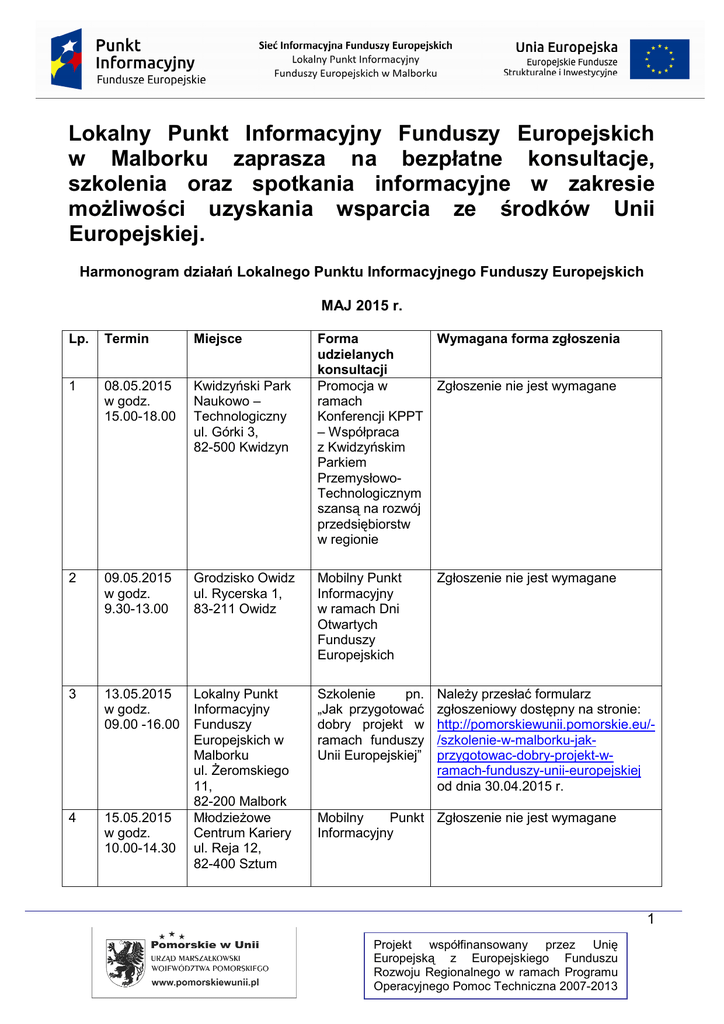 Lokalny Punkt Informacyjny Funduszy Europejskich w Malborku zaprasza na bezpłatne konsultacje, szkolenia oraz spotkania informacyjne w zakresie możliwości uzyskania wsparcia ze środków Unii Europejskiej. Harmonogram działań Lokalnego Punktu Informacyjnego Funduszy Europejskich MAJ 2015 r. Lp. Termin Miejsce Forma udzielanych konsultacji Promocja w ramach Konferencji KPPT – Współpraca z Kwidzyńskim Parkiem PrzemysłowoTechnologicznym szansą na rozwój przedsiębiorstw w regionie Wymagana forma zgłoszenia 1 08.05.2015 w godz. 15.00-18.00 Kwidzyński Park Naukowo – Technologiczny ul. Górki 3, 82-500 Kwidzyn 2 09.05.2015 w godz. 9.30-13.00 Grodzisko Owidz ul. Rycerska 1, 83-211 Owidz Mobilny Punkt Informacyjny w ramach Dni Otwartych Funduszy Europejskich Zgłoszenie nie jest wymagane 3 13.05.2015 w godz. 09.00 -16.00 Lokalny Punkt Informacyjny Funduszy Europejskich w Malborku ul. Żeromskiego 11, 82-200 Malbork Młodzieżowe Centrum Kariery ul. Reja 12, 82-400 Sztum Szkolenie pn. „Jak przygotować dobry projekt w ramach funduszy Unii Europejskiej” Należy przesłać formularz zgłoszeniowy dostępny na stronie: http://pomorskiewunii.pomorskie.eu//szkolenie-w-malborku-jakprzygotowac-dobry-projekt-wramach-funduszy-unii-europejskiej od dnia 30.04.2015 r. 4 15.05.2015 w godz. 10.00-14.30 Zgłoszenie nie jest wymagane Mobilny Punkt Zgłoszenie nie jest wymagane Informacyjny 1 Projekt współfinansowany przez Unię Europejską z Europejskiego Funduszu Rozwoju Regionalnego w ramach Programu Operacyjnego Pomoc Techniczna 2007-2013 5 19.05.2015 w godz. 09.00-14.00 Dom Przedsiębiorcy Tczew, ul. Obrońców Westerplatte 3, 83-110 Tczew Mobilny Punkt Zgłoszenie nie jest wymagane Informacyjny 6 21.05.2015 w godz. 09-11.30 Mobilny Punkt Zgłoszenie nie jest wymagane Informacyjny 7 21.05.2015 w godz. 12.30-15.00 8 25.05.2015 w godz. 11.00-14.00 Urząd Miasta i Gminy Pelplin, ul. Plac Grunwaldzki 4, 83-130 Pelplin Urząd Gminy Subkowy, ul. Wybickiego 19 a, 83-120 Subkowy Urząd Miasta Gdańska 6, 83-203 Starogard Gdański 9 26.05.2015 w godz. 12.00-14.45 Dom Przedsiębiorcy Tczew, ul. Obrońców Westerplatte 3, 83-110 Tczew 10 28.05.2015 w godz. 09-16-00 Lokalny Punkt Informacyjny Funduszy Europejskich w Malborku ul. Żeromskiego 11, 82-200 Malbork Mobilny Punkt Zgłoszenie nie jest wymagane Informacyjny Mobilny Punkt Informacyjny Zgłoszenie nie jest wymagane Spotkanie informacyjne „Możliwości wsparcia dla osób zamierzających rozpocząć działalność gospodarczą” Szkolenie pn. „Zasady aplikowania o Fundusze Europejskie generator wniosków aplikacyjnych SOWA” Należy przesłać formularz zgłoszeniowy dostępny na stronie: http://www.lgd-malemorze.pl/index/1 od dnia 12 maja 2015 r. Należy przesłać formularz zgłoszeniowy dostępny na stronie: http://www.lgd-malemorze.pl/index/1 od dnia 13 maja 2015 r. Ponadto zapraszamy na indywidualne konsultacje do biura Lokalnego Punktu Informacyjnego Funduszy Europejskich w Malborku, mieszczącego się przy ul. Żeromskiego 11, w godz.: Pn. 8.00 - 18.00 Wt. - Pt. 8.00 - 16.00 2 Projekt współfinansowany przez Unię Europejską z Europejskiego Funduszu Rozwoju Regionalnego w ramach Programu Operacyjnego Pomoc Techniczna 2007-2013 Tel.: 668-530-058, 728-486-436 Email: [email protected] Z naszych usług mogą skorzystać wszyscy zainteresowani tematem funduszy europejskich. W szczególności zapraszamy przedsiębiorców oraz osoby fizyczne planujące rozpoczęcie działalności gospodarczej. Konsultacje są bezpłatne. Serdecznie zapraszamy. 3 Projekt współfinansowany przez Unię Europejską z Europejskiego Funduszu Rozwoju Regionalnego w ramach Programu Operacyjnego Pomoc Techniczna 2007-2013
