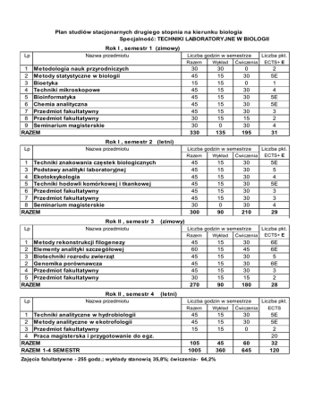 Plan studiów stacjonarnych drugiego stopnia na kierunku biologia Specjalność: TECHNIKI LABORATORYJNE W BIOLOGII Rok I , semestr 1 (zimowy) Lp Nazwa przedmiotu Liczba godzin w semestrze 1 Metodologia nauk przyrodniczych 2 Metody statystyczne w biologii 3 Bioetyka 4 Techniki mikroskopowe 5 Bioinformatyka 6 Chemia analityczna 7 Przedmiot fakultatywny 8 Przedmiot fakultatywny 9 Seminarium magisterskie RAZEM Liczba pkt. Razem Wykład Ćwiczenia ECTS+ E 30 45 15 45 45 45 45 30 30 330 30 15 15 15 15 15 15 15 0 135 0 30 0 30 30 30 30 15 30 195 2 5E 1 4 5E 5E 3 2 4 31 Rok I , semestr 2 (letni) Lp Nazwa przedmiotu Liczba godzin w semestrze 1 Techniki znakowania częstek biologicznych 3 Podstawy analityki laboratoryjnej 4 Ekotoksykologia 5 Techniki hodowli komórkowej i tkankowej 6 Przedmiot fakultatywny 7 Przedmiot fakultatywny 8 Seminarium magisterskie RAZEM Rok II , semestr 3 Lp Nazwa przedmiotu Rok II , semestr 4 Nazwa przedmiotu 1 Techniki analityczne w hydrobiologii 2 Metody analityczne w ekotrofologii 3 Przedmiot fakultatywny 4 Praca magisterska i przygotowanie do egz. RAZEM RAZEM 1-4 SEMESTR Razem Wykład Ćwiczenia ECTS+ E 45 45 45 45 45 45 30 300 15 15 15 15 15 15 0 90 30 30 30 30 30 30 30 210 5E 5 4 5E 3 3 4 29 (zimowy) Liczba godzin w semestrze 1 Metody rekonstrukcji filogenezy 2 Elementy analityki szczegółowej 3 Biotechniki rozrodu zwierząt 2 Genomika porównawcza 4 Przedmiot fakultatywny 5 Przedmiot fakultatywny RAZEM Lp Liczba pkt. Liczba pkt. Razem Wykład Ćwiczenia ECTS+ E 45 60 45 45 45 30 270 15 15 15 15 15 15 90 30 45 30 30 30 15 180 6E 6E 5 6E 3 2 28 (letni) Liczba godzin w semestrze Liczba pkt. Razem Wykład Ćwiczenia ECTS 45 45 15 15 15 15 30 30 0 105 1005 45 360 60 645 5E 5E 2 20 32 120 Zajęcia falultatywne - 255 godz.; wykłady stanowią 35,8%; ćwiczenia- 64,2%
