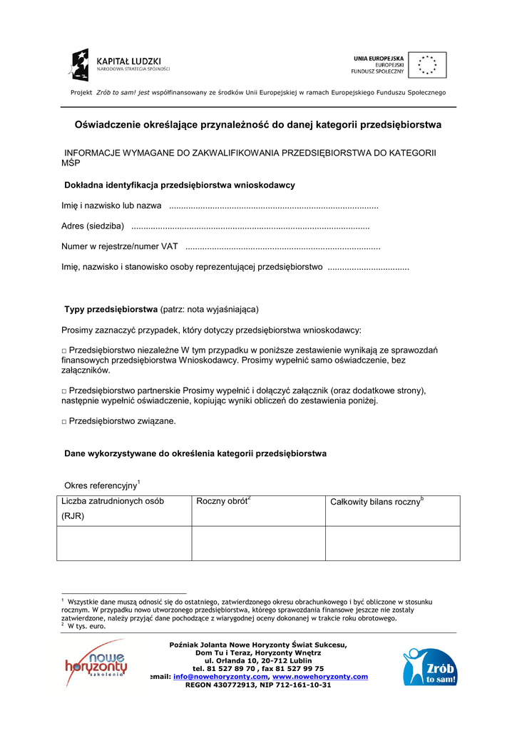 Projekt Zrób to sam! jest współfinansowany ze środków Unii Europejskiej w ramach Europejskiego Funduszu Społecznego Oświadczenie określające przynależność do danej kategorii przedsiębiorstwa INFORMACJE WYMAGANE DO ZAKWALIFIKOWANIA PRZEDSIĘBIORSTWA DO KATEGORII MŚP Dokładna identyfikacja przedsiębiorstwa wnioskodawcy Imię i nazwisko lub nazwa ....................................................................................... Adres (siedziba) ................................................................................................... Numer w rejestrze/numer VAT ................................................................................. Imię, nazwisko i stanowisko osoby reprezentującej przedsiębiorstwo .................................. Typy przedsiębiorstwa (patrz: nota wyjaśniająca) Prosimy zaznaczyć przypadek, który dotyczy przedsiębiorstwa wnioskodawcy: □ Przedsiębiorstwo niezależne W tym przypadku w poniższe zestawienie wynikają ze sprawozdań finansowych przedsiębiorstwa Wnioskodawcy. Prosimy wypełnić samo oświadczenie, bez załączników. □ Przedsiębiorstwo partnerskie Prosimy wypełnić i dołączyć załącznik (oraz dodatkowe strony), następnie wypełnić oświadczenie, kopiując wyniki obliczeń do zestawienia poniżej. □ Przedsiębiorstwo związane. Dane wykorzystywane do określenia kategorii przedsiębiorstwa Okres referencyjny 1 Liczba zatrudnionych osób Roczny obrót 2 b Całkowity bilans roczny (RJR) 1 Wszystkie dane muszą odnosić się do ostatniego, zatwierdzonego okresu obrachunkowego i być obliczone w stosunku rocznym. W przypadku nowo utworzonego przedsiębiorstwa, którego sprawozdania finansowe jeszcze nie zostały zatwierdzone, należy przyjąć dane pochodzące z wiarygodnej oceny dokonanej w trakcie roku obrotowego. 2 W tys. euro. Poźniak Jolanta Nowe Horyzonty Świat Sukcesu, Dom Tu i Teraz, Horyzonty Wnętrz ul. Orlanda 10, 20-712 Lublin tel. 81 527 89 70 , fax 81 527 99 75 email: [email protected], www.nowehoryzonty.com REGON 430772913, NIP 712-161-10-31 Projekt Zrób to sam! jest współfinansowany ze środków Unii Europejskiej w ramach Europejskiego Funduszu Społecznego Uwaga W porównaniu z poprzednim okresem obrachunkowym nastąpiła zmiana danych, która może spowodować zmianę kategorii przedsiębiorstwa wnioskodawcy (mikro, małe, średnie lub duże przedsiębiorstwo). □ Nie □ Tak (w tym przypadku prosimy wypełnić i dołączyć oświadczenie dotyczące poprzedniego okresu obrachunkowego) Podpis Nazwisko i stanowisko osoby podpisującej, upoważnionej do reprezentowania przedsiębiorstwa: …………………………………………………………………………………………………………………………………………………………… Oświadczam, że dane zawarte w niniejszym oświadczeniu i załącznikach do niego są zgodne ze stanem faktycznym. Sporządzono w ……………………………………………………………………………………………………………………………………………………………. ....................................................... Podpis 1) Ustala Państwo Członkowskie w zależności od swoich potrzeb. 2) Prezes, dyrektor naczelny lub osoba na równorzędnym stanowisku. 3) Definicja. Art. 4 ust. 2 załącznika do zalecenia Komisji 2003/361/WE Poźniak Jolanta Nowe Horyzonty Świat Sukcesu, Dom Tu i Teraz, Horyzonty Wnętrz ul. Orlanda 10, 20-712 Lublin tel. 81 527 89 70 , fax 81 527 99 75 email: [email protected], www.nowehoryzonty.com REGON 430772913, NIP 712-161-10-31