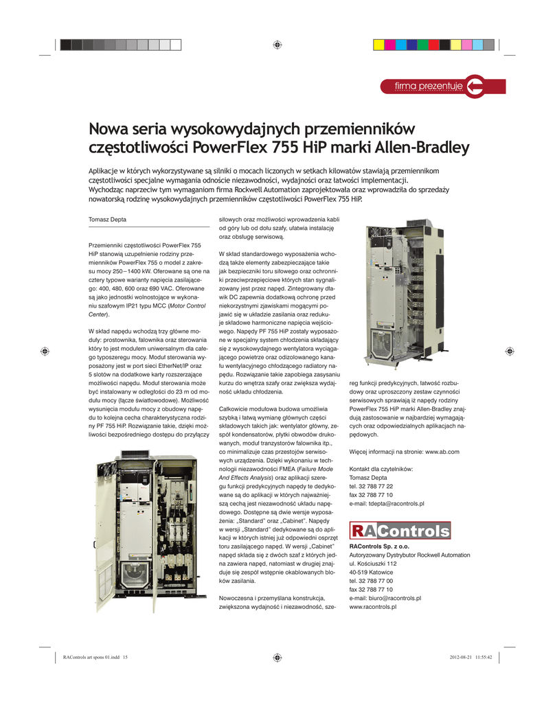 firma prezentuje Nowa seria wysokowydajnych przemienników częstotliwości PowerFlex 755 HiP marki Allen-Bradley Aplikacje w których wykorzystywane są silniki o mocach liczonych w setkach kilowatów stawiają przemiennikom częstotliwości specjalne wymagania odnoście niezawodności, wydajności oraz łatwości implementacji. Wychodząc naprzeciw tym wymaganiom firma Rockwell Automation zaprojektowała oraz wprowadziła do sprzedaży nowatorską rodzinę wysokowydajnych przemienników częstotliwości PowerFlex 755 HiP. Tomasz Depta siłowych oraz możliwości wprowadzenia kabli od góry lub od dołu szafy, ułatwia instalację oraz obsługę serwisową. Przemienniki częstotliwości PowerFlex 755 HiP stanowią uzupełnienie rodziny prze- W skład standardowego wyposażenia wcho- mienników PowerFlex 755 o model z zakre- dzą także elementy zabezpieczające takie su mocy 2501400 kW. Oferowane są one na jak bezpieczniki toru siłowego oraz ochronni- cztery typowe warianty napięcia zasilające- ki przeciwprzepięciowe których stan sygnali- go: 400, 480, 600 oraz 690 VAC. Oferowane zowany jest przez napęd. Zintegrowany dła- są jako jednostki wolnostojące w wykona- wik DC zapewnia dodatkową ochronę przed niu szafowym IP21 typu MCC (Motor Control niekorzystnymi zjawiskami mogącymi po- Center). jawić się w układzie zasilania oraz redukuje składowe harmoniczne napięcia wejścio- W skład napędu wchodzą trzy główne mo- wego. Napędy PF 755 HiP zostały wyposażo- duły: prostownika, falownika oraz sterowania ne w specjalny system chłodzenia składający który to jest modułem uniwersalnym dla całe- się z wysokowydajnego wentylatora wyciąga- go typoszeregu mocy. Moduł sterowania wy- jącego powietrze oraz odizolowanego kana- posażony jest w port sieci EtherNet/IP oraz łu wentylacyjnego chłodzącego radiatory na- 5 slotów na dodatkowe karty rozszerzające pędu. Rozwiązanie takie zapobiega zasysaniu możliwości napędu. Moduł sterowania może kurzu do wnętrza szafy oraz zwiększa wydaj- reg funkcji predykcyjnych, łatwość rozbu- być instalowany w odległości do 23 m od mo- ność układu chłodzenia. dowy oraz uproszczony zestaw czynności dułu mocy (łącze światłowodowe). Możliwość serwisowych sprawiają iż napędy rodziny wysunięcia modułu mocy z obudowy napę- Całkowicie modułowa budowa umożliwia PowerFlex 755 HiP marki Allen-Bradley znaj- du to kolejna cecha charakterystyczna rodzi- szybką i łatwą wymianę głównych części dują zastosowanie w najbardziej wymagają- ny PF 755 HiP. Rozwiązanie takie, dzięki moż- składowych takich jak: wentylator główny, ze- cych oraz odpowiedzialnych aplikacjach na- liwości bezpośredniego dostępu do przyłączy spół kondensatorów, płytki obwodów druko- pędowych. wanych, moduł tranzystorów falownika itp., co minimalizuje czas przestojów serwiso- Więcej informacji na stronie: www.ab.com wych urządzenia. Dzięki wykonaniu w technologii niezawodności FMEA (Failure Mode Kontakt dla czytelników: And Effects Analysis) oraz aplikacji szere- Tomasz Depta gu funkcji predykcyjnych napędy te dedyko- tel. 32 788 77 22 wane są do aplikacji w których najważniej- fax 32 788 77 10 szą cechą jest niezawodność układu napę- e-mail: [email protected] dowego. Dostępne są dwie wersje wyposażenia: „Standard” oraz „Cabinet”. Napędy w wersji „Standard” dedykowane są do aplikacji w których istniej już odpowiedni osprzęt toru zasilającego napęd. W wersji „Cabinet” RAControls Sp. z o.o. napęd składa się z dwóch szaf z których jed- Autoryzowany Dystrybutor Rockwell Automation na zawiera napęd, natomiast w drugiej znaj- ul. Kościuszki 112 duje się zespół wstępnie okablowanych blo- 40-519 Katowice ków zasilania. tel. 32 788 77 00 fax 32 788 77 10 RAControls art spons 01.indd 15 Nowoczesna i przemyślana konstrukcja, e-mail: [email protected] zwiększona wydajność i niezawodność, sze- www.racontrols.pl 2012-08-21 11:55:42