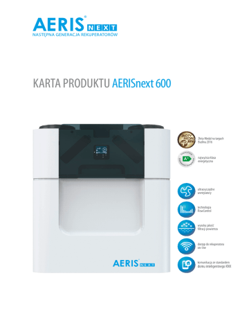 KARTA PRODUKTU AERISnext 600 Złoty Medal na targach Budma 2016 najwyższa klasa energetyczna ultraoszczędne wentylatory technologia FlowControl wysoka jakość filtracji powietrza dostęp do rekuperatora on-line komunikacja ze standardem domu inteligentnego KNX Rekuperatory AERISnext posiadają technologię FlowControl, która: • • • • Rekuperatory AERISnext to następna generacja znanych i cenionych central AERIS, które były obecne na polskim rynku od ponad 10 lat. Nowe rekuperatory to owoc badań, pracy i doświadczeń holenderskich inżynierów, których doświadczenie w produkcji central wentylacyjnych w Holandii jest rozwijane już od ponad 75 lat. AERISnext to zaawansowane technologicznie urządzenia. Wiele dowodów wskazuje na to, że są to obecnie najnowocześniejsze rekuperatory na świecie! Rekuperatory AERISnext dedykowane są szczególnie do budynków energooszczędnych i pasywnych, gdzie niskie zapotrzebowanie energetyczne połączone z wysokim komfortem i jakością powietrza jest priorytetem. Doskonale spełniają swoją funkcję również w obiektach użyteczności publicznej (przychodnie, sklepy, gabinety kosmetyczne, siłownie, sale fitness, studia nagrań). Modele standard występują w wydajnościach 350 i 450 m3/h. Posiadają one: •nowej generacji wymiennik przeciwprądowy o kształcie odwzo• • • AERISnext 600 • • • • • • rowującym idealny szlif brylantowy modulowany bypass modulowaną nagrzewnicę wstępną VV wbudowane czujniki ciśnienia, temperatury i wilgotności do regulacji przepływu powietrza wyświetlacz na froncie jednostki opcję sterowania sterownikiem ComfoSwitch C oraz modułem ComfoConnect LAN C regulowane (TR) oraz stałe (ST) króćce przyłączeniowe możliwość montażu na ścianie lub na podstawie możliwość łatwego przeprogramowania strony rekuperatora możliwość podłączenia urządzenia jonizująco-oczyszczającego AERIS Oxy Wersje pełne rekuperatorów AERISnext występują w wydajnościach 350, 450 i 600 m3/h. Posiadają one wszystkie cechy wersji standard oraz dodatkowo: •możliwość podłączenia sterownika ComfoSense C, modułu • • • • • 2 ComfoConnect KNX C oraz Option Boxa możliwość sterowania gruntowym wymiennikiem ciepła GWC ComfoFond-L Q oraz GWC podwietrznym (konieczność posiadania Option Boxa) możliwość zarządzania pracą systemu rekuperacji z poziomu urządzeń mobilnych (smartfon, tablet z systemem Adnroid oraz iOS) możliwość obsługi z poziomu protokołu domu inteligentnego KNX oraz domu inteligentnego Fibaro (dla Fibaro konieczność posiadania Option Boxa) możliwość podłączenia bezprzewodowego dodatkowego sterownika radiowego RFZ (konieczność posiadania sterownika ComfoSense C) możliwość podłączenia jednostki chłodzącej ARTIC Q600 (wyłącznie do AERISnext 600) • •możliwość montażu czujników dwutlenku węgla i wilgotności, • • • • które podwyższają klasę energetyczną rekuperatora aż do najwyższej A+ (konieczność posiadania Option Boxa) możliwość podłączenia nagrzewnicy elektrycznej wtórnej (konieczność posiadania Option Boxa) Klasa efektywności energetycznej rekuperatorów AERISnext zgodnie z Dyrektywą Unijną 2009/125/EC oraz Rozporządzeniem Komisji UE nr 1254/2014 Rekuperator Klasa energetyczna rekuperatora AERISnext 350 R VV TR AERISnext 350 L VV TR * AERISnext 350 R VV TR ERV AERISnext 350 L VV TR ERV * AERISnext 350 R VV Standard TR •duży wymiennik ciepła o kształcie wzorowanym na brylanto• • • wym szlifie zapewniającym dużą powierzchnię odzysku ciepła bardzo ciche wentylatory promieniowe z siatką przepływową FlowGrid i pierścieniem przepływowym doskonale izolowaną obudowę zewnętrzną z łatwym dostępem serwisowym do wnętrza rekuperatora modulowaną nagrzewnicę wstępną oraz modulowany bypass zwiększający komfort nawiewu technologię FlowControl technologię adaptacji klimatu opartą o średnią kroczącą temperaturę z ostatnich 5 dni (RMOT - „running mean outdoor temperature) objętościowy i masowy pomiar przepływu powietrza sztywne i szczelne filtry o plisowanym kształcie i klasie filtracji G4 AERISnext 450 R VV ST AERISnext 450 L VV ST * • • AERISnext 450 R VV ST ERV AERISnext 450 L VV ST ERV * Do rekuperatorów AERISnext podłączyć można również: AERISnext 450 R VV Standard ST •system zarządzania domem inteligentnym KNX (wymaga mon• x AERISnext 600 R VV ST AERISnext 600 L VV ST * AERISnext 600 R VV ST ERV AERISnext 600 L VV ST ERV * rekuperatora przez określony czas •możliwość ustawienia trzech profili temperatury •wyświetlanie temperatury w stopniach C •podłączenie sterownika radiowego bezprzewodowego RFZ do • • sterowania z dowolnego miejsca w domu powiadomienia o usterkach centrali poprzez powiadomienie na wyświetlaczu sterownika powiadomienie o konieczności wymiany filtra Sterownik ComfoSwitch C Współpracuje z rekuperatorami AERISnext w wersji pełnej (również wersje z odzyskiem wilgoci ERV) oraz wersją standard i umożliwia dostęp do wybranych funkcji centrali. Każde urządzenie wyposażone jest w: • • x •funkcja AWAY przełącza wentylację na najniższą wydajność • tażu ComfoConnect KNX C) system domu inteligentnego FIBARO (wymaga montażu OptionBoxa i modułu AerisIntelligence by Fibaro) aplikację AERISnext online do obsługi z poziomu Android oraz iOS (wymaga montażu ComfoConnect LAN C) STEROWANIE REKUPERATORAMI AERISNEXT Najważniejsze cechy sterownika ComfoSwitch C: •ustawienie trybu ‘przewietrzanie’ (intensywna czasowa wentylacja) •przełączanie pomiędzy trybem AUTO i MANUALNYM •zwiększanie (+) i zmniejszanie (-) intensywności wentylacji •odczyt z diod LED aktualnie zadanej intensywności wentylacji •powiadomienie o usterkach centrali (miganie diody LED) •powiadomienie o konieczności wymiany filtra •nie jest kompatybilny z radiowym sterownikiem bezprzewodowym RFZ Bezprzewodowy s