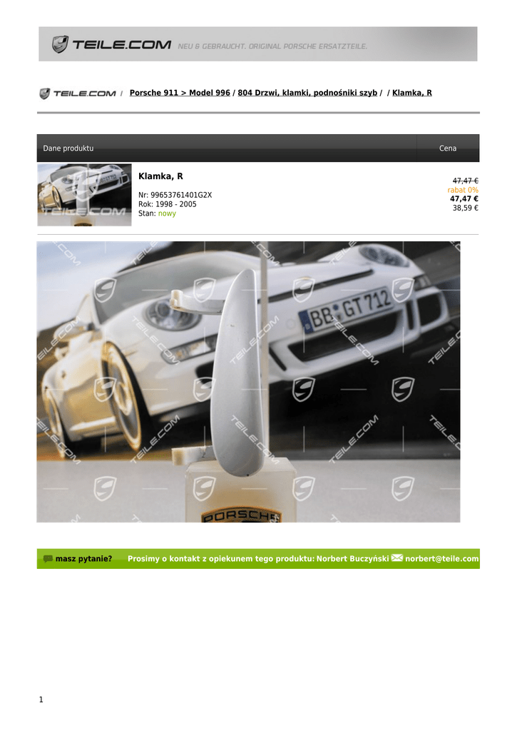 Porsche 911 > Model 996 / 804 Drzwi, klamki, podnośniki szyb / / Klamka, R Dane produktu Cena Klamka, R Nr: 99653761401G2X Rok: 1998 - 2005 Stan: nowy masz pytanie? 1 Prosimy o kontakt z opiekunem tego produktu: Norbert Buczyński 47,47 € rabat 0% 47,47 € 38,59 € [email protected]
