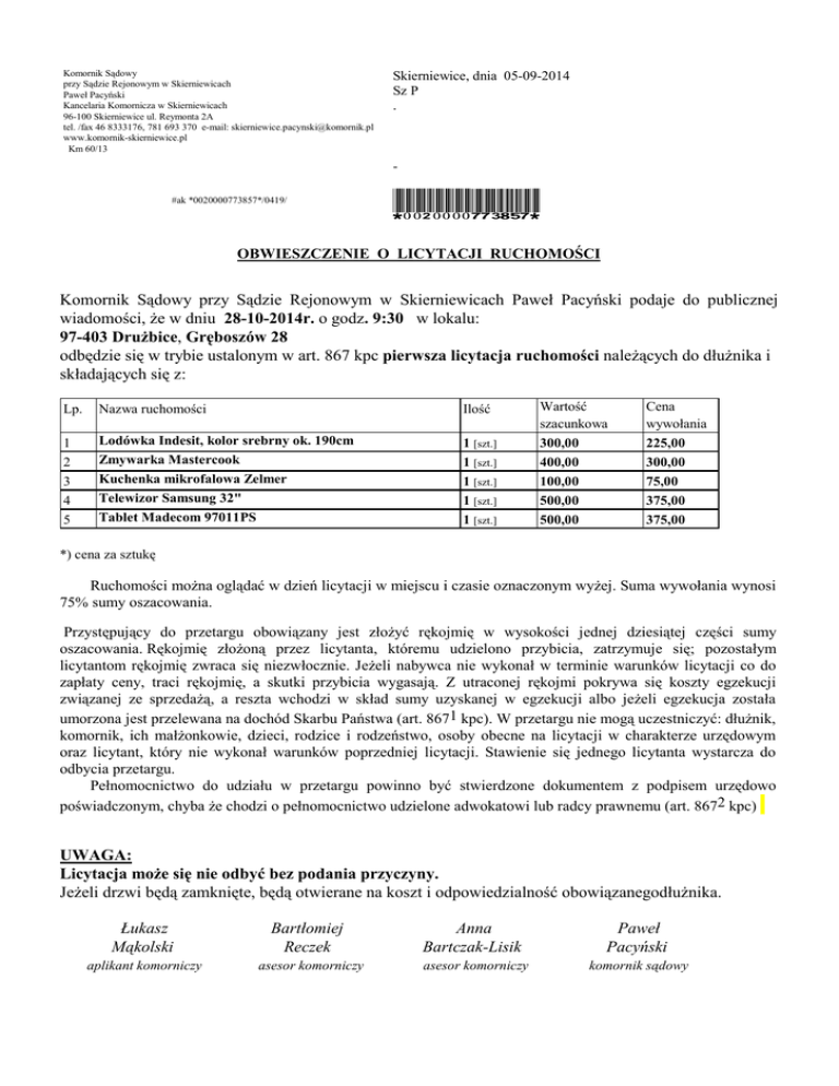 Komornik Sądowy przy Sądzie Rejonowym w Skierniewicach Paweł Pacyński Kancelaria Komornicza w Skierniewicach 96-100 Skierniewice ul. Reymonta 2A tel. /fax 46 8333176, 781 693 370 e-mail: [email protected] www.komornik-skierniewice.pl Km 60/13 Skierniewice, dnia 05-09-2014 Sz P . #ak *0020000773857*/0419/ *0020000773857* OBWIESZCZENIE O LICYTACJI RUCHOMOŚCI Komornik Sądowy przy Sądzie Rejonowym w Skierniewicach Paweł Pacyński podaje do publicznej wiadomości, że w dniu 28-10-2014r. o godz. 9:30 w lokalu: 97-403 Drużbice, Gręboszów 28 odbędzie się w trybie ustalonym w art. 867 kpc pierwsza licytacja ruchomości należących do dłużnika i składających się z: Lp. Nazwa ruchomości Ilość 1 2 3 4 5 Lodówka Indesit, kolor srebrny ok. 190cm Zmywarka Mastercook Kuchenka mikrofalowa Zelmer Telewizor Samsung 32" Tablet Madecom 97011PS 1 [szt.] 1 [szt.] 1 [szt.] 1 [szt.] 1 [szt.] Wartość szacunkowa 300,00 400,00 100,00 500,00 500,00 Cena wywołania 225,00 300,00 75,00 375,00 375,00 *) cena za sztukę Ruchomości można oglądać w dzień licytacji w miejscu i czasie oznaczonym wyżej. Suma wywołania wynosi 75% sumy oszacowania. Przystępujący do przetargu obowiązany jest złożyć rękojmię w wysokości jednej dziesiątej części sumy oszacowania. Rękojmię złożoną przez licytanta, któremu udzielono przybicia, zatrzymuje się; pozostałym licytantom rękojmię zwraca się niezwłocznie. Jeżeli nabywca nie wykonał w terminie warunków licytacji co do zapłaty ceny, traci rękojmię, a skutki przybicia wygasają. Z utraconej rękojmi pokrywa się koszty egzekucji związanej ze sprzedażą, a reszta wchodzi w skład sumy uzyskanej w egzekucji albo jeżeli egzekucja została umorzona jest przelewana na dochód Skarbu Państwa (art. 8671 kpc). W przetargu nie mogą uczestniczyć: dłużnik, komornik, ich małżonkowie, dzieci, rodzice i rodzeństwo, osoby obecne na licytacji w charakterze urzędowym oraz licytant, który nie wykonał warunków poprzedniej licytacji. Stawienie się jednego licytanta wystarcza do odbycia przetargu. Pełnomocnictwo do udziału w przetargu powinno być stwierdzone dokumentem z podpisem urzędowo poświadczonym, chyba że chodzi o pełnomocnictwo udzielone adwokatowi lub radcy prawnemu (art. 8672 kpc) UWAGA: Licytacja może się nie odbyć bez podania przyczyny. Jeżeli drzwi będą zamknięte, będą otwierane na koszt i odpowiedzialność obowiązanegodłużnika. Łukasz Mąkolski Bartłomiej Reczek Anna Bartczak-Lisik Paweł Pacyński aplikant komorniczy asesor komorniczy asesor komorniczy komornik sądowy