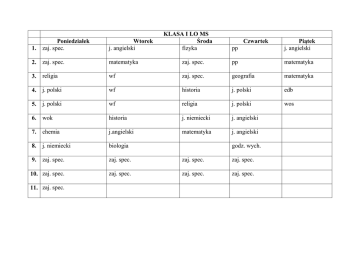 1. Poniedziałek zaj. spec. Wtorek j. angielski 2. zaj. spec. matematyka 3. religia 4. KLASA I LO MS Środa fizyka pp Piątek j. angielski zaj. spec. pp matematyka wf zaj. spec. geografia matematyka j. polski wf historia j. polski edb 5. j. polski wf religia j. polski wos 6. wok historia j. niemiecki j. angielski 7. chemia j.angielski matematyka j. angielski 8. j. niemiecki biologia 9. zaj. spec. zaj. spec. zaj. spec. zaj. spec. 10. zaj. spec. zaj. spec. zaj. spec. zaj. spec. 11. zaj. spec. Czwartek godz. wych. 1. Poniedziałek geografia Wtorek zaj. spec./wf 2. geografia zaj. spec./wf 3. zaj. spec./wf 4. KLASA II LO MS Środa zaj. spec. Czwartek j.ang./j.niem. Piątek wf/zaj. spec. zaj. spec. j.ang./j.niem historia matematyka geografia matematyka j. polski j. polski geografia matematyka j. niem./j.ang 5. historia j. polski j. niem/j.ang j. polski biologia 6. historia godz. wych. religia j. polski biologia 7. biologia matematyka religia zaj. spec. j.ang./j.ang. 8. biologia j. ang/j.ang wf/zaj. spec. zaj. spec. j. niem/j.ang 9. zaj.spec. j.ang./j.niem. wf/zaj. spec. zaj.spec. zaj. spec. zaj.spec. 10. zaj. spec. 11. zaj. spec. Poniedziałek 1. Wtorek zaj. spec./wf KLASA III LO MS Środa zaj. spec. Czwartek Piątek wf/zaj. spec. 2. religia zaj. spec./wf zaj.spec. j. angielski j. polski 3. zaj. spec./wf j. niemiecki j. polski j. niemiecki j. angielski 4. religia historia j. polski j. niemiecki historia 5. j. angielski geografia matematyka j. polski 6. biologia matematyka geografia matematyka j. ang. 7. geografia biologia j. niem. zaj. spec. biologia 8. geografia wf/zaj. spec. zaj. spec. biologia 9. zaj.spec. wf/zaj.spec. zaj.spec. zaj.spec. zaj.spec. 10. zaj.spec. 11. zaj.spec.