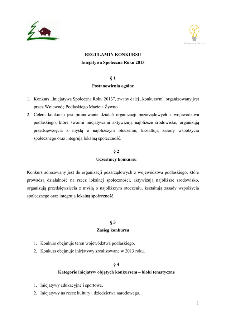 REGULAMIN KONKURSU Inicjatywa Społeczna Roku 2013 §1 Postanowienia ogólne 1. Konkurs „Inicjatywa Społeczna Roku 2013”, zwany dalej „konkursem” organizowany jest przez Wojewodę Podlaskiego Macieja Żywno. 2. Celem konkursu jest promowanie działań organizacji pozarządowych z województwa podlaskiego, które swoimi inicjatywami aktywizują najbliższe środowisko, organizują przedsięwzięcia z myślą o najbliższym otoczeniu, kształtują zasady współżycia społecznego oraz integrują lokalną społeczność. §2 Uczestnicy konkursu Konkurs adresowany jest do organizacji pozarządowych z województwa podlaskiego, które prowadzą działalność na rzecz lokalnej społeczności, aktywizują najbliższe środowisko, organizują przedsięwzięcia z myślą o najbliższym otoczeniu, kształtują zasady współżycia społecznego oraz integrują lokalną społeczność. §3 Zasięg konkursu 1. Konkurs obejmuje teren województwa podlaskiego. 2. Konkurs obejmuje inicjatywy zrealizowane w 2013 roku. §4 Kategorie inicjatyw objętych konkursem – bloki tematyczne 1. Inicjatywy edukacyjne i sportowe. 2. Inicjatywy na rzecz kultury i dziedzictwa narodowego. 1 3. Inicjatywy z zakresu polityki społecznej. 4. Inicjatywy na rzecz ochrony środowiska. § 5 Zasady uczestnictwa 1. Wojewoda Podlaski podaje do publicznej wiadomości informację o ogłoszeniu konkursu i możliwości zgłaszania w nim udziału. 2. Zgłoszenia do konkursu może dokonać organizacja realizująca inicjatywę ubiegającą się o uzyskanie tytułu „Inicjatywa Społeczna Roku 2013”, jak również inny podmiot. 3. Zgłoszeń do konkursu dokonuje się poprzez wypełnienie formularza zgłoszeniowego, stanowiącego załącznik nr 1 do niniejszego regulaminu, dostępnego na stronie www.wojewodapodlaski.pl i przesłanie wypełnionego w zakładce formularza Inicjatywa pocztą Społeczna elektroniczną Roku na adres: [email protected]. 4. Do każdego formularza zgłoszeniowego należy dołączyć opis inicjatywy wraz ze zdjęciami ilustrującymi inicjatywę. 5. Inicjatywa organizacji ubiegająca się o uzyskanie tytułu „Inicjatywa Społeczna Roku 2013” musi uzyskać rekomendacje dwóch innych organizacji, instytucji współpracujących z organizacją realizującą inicjatywę lub opinię beneficjentów inicjatywy, które należy przesłać wraz z formularzem zgłoszeniowym. 6. Dopuszcza się przesyłanie wraz z formularzem zgłoszeniowym dodatkowych materiałów o zgłaszanej inicjatywie. 7. Termin składania zgłoszeń: od 3 lutego 2014 roku do 16 marca 2014 roku. §6 Sposób oceny i rozstrzygnięcie konkursu 1. Rozstrzygnięcia konkursu dokonuje kapituła konkursowa powołana przez organizatora konkursu. 2. Członkowie kapituły konkursowej dokumentują oceny w Formularzach oceny zgłoszeń do konkursu. 3. Poddane ocenie kapituły będą zgłoszenia, które przeszły pozytywnie weryfikację formalną. 4. Kapituła dokonuje oceny zgłoszeń według kryteriów oceny: 1) znaczenie inicjatywy dla społeczności lokalnej, osiągnięta zmiana społeczna, rozwiązany problem lub zaspokojone potrzeby (punktacja 0-5); 2 2) wpływ na rozwój współpracy z innymi organizacjami pozarządowymi i partnerami społecznymi w regionie, w tym z samorządem lokalnym (punktacja 0-5); 3) umiejętność zaangażowania innych organizacji, wolontariuszy do realizacji inicjatywy - partnerstwa lokalne (punktacja 0-5); 4) innowacyjność podjętego działania (punktacja 0-5). 5. Wyniki konkursu zostaną uroczyście ogłoszone podczas gali finałowej konkursu. 3