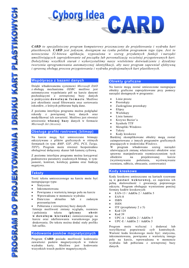 CARD to specjalistyczny program komputerowy przeznaczony do projektowania i wydruku kart plastikowych. CARD jest jedynym, dostępnym na rynku polskim programem tego typu. Jest to nowoczesna 32-bitowa aplikacja, wyposażona w szereg przydatnych funkcji i narzędzi umożliwiających zaprojektowanie od początku lub personalizację wcześniej przygotowanych kart. Dołożyliśmy wszelkich starań i wykorzystaliśmy nasze wieloletnie doświadczenie z dziedziny tworzenia oprogramowania automatycznej identyfikacji, aby nasz program zapewniał efektywną i sprawną obsługę procesu przygotowania i wydruku profesjonalnych kart plastikowych. Współpraca z bazami danych Obiekty graficzne Dzięki wbudowanemu systemowi Microsoft DAO z obsługą mechanizmu ODBC możliwe jest automatyczne wypełnianie pól na karcie danymi pochodzącymi z zewnętrznej bazy danych w praktycznie d o w o l n y m f o r m a c i e . Możliwe jest określenie zasad filtrowania oraz sortowania rekordów, z których pobierane będą dane. Na karcie mogą zostać umieszczone następujące obiekty graficzne zaprojektowane przy pomocy narzędzi dostępnych w programie: Z poziomu interfejsu programu można podglądać rekordy z powiązanej bazy danych oraz modyfikować ich zawartość. Możliwe jest również utworzenie w ł a s n e j b a z y danych w formacie Microsoft Jet (Access). Obsługa grafiki rastrowej (bitmap) Na karcie mogą być umieszczane bitmapy odczytywane z plików graficznych w różnych formatach (w tym: BMP, GIF, JPG, PCX, Targa, TIFF). Program może również bezpośrednio obsługiwać dołączony skaner lub kamerę cyfrową. Z poziomu interfejsu programu można korygować podstawowe parametry osadzonych bitmap, w tym: jasność, kontrast, korekcję gamma oraz funkcję negatywu. Teksty Treść tekstu umieszczonego na karcie może być następującego typu: • Statyczna • Inkrementowana • Powiązana z wartością innego pola na karcie • Wprowadzana w momencie wydruku • Data/czas aktualna lub z zadanym przesunięciem • Pobierana z zewnętrznej bazy danych Istnieje możliwość zmiany wyglądu, rozmiaru i położenia tekstu (p ł y n n y obrót w d o w o l n y m k i e r u n k u ) zamieszczanego na karcie oraz zdefiniowania warunkowego jego drukowania. Do tekstu można dodać stały prefiks lub sufiks. Kodowanie pasków magnetycznych Program CARD posiada możliwość kodowania zawartości pasków magnetycznych w trakcie wydruku karty. Możliwe jest kodowanie wszystkich trzech pasków magnetycznych. • Linie proste • Prostokąty • Zaokrąglone prostokąty • Elipsy • Wielokąty • Linie łamane • Krzywe Bezier’a • Symbole TTF • Metapliki Windows • Teksty • Kody kreskowe Bardziej skomplikowane obiekty mogą zostać zaimportowane z innych programów graficznych pracujących w środowisku Windows. W program wbudowano szereg narzędzi ułatwiających zmianę właściwości obiektów oraz sprawne manipulowanie rozmieszczeniem tych obiektów na projektowanej karcie (wyrównywanie położenia, wyrównywanie rozmiaru, odbicie, obracanie, centrowanie) Kody kreskowe Kody kreskowe umieszczane na kartach rysowane są w p o s t a c i w e k t o r o w e j , co zapewnia ich pełną skalowalność i gwarancję poprawnego odczytu. Program obsługuje wymienione poniżej formaty kodów kreskowych: • EAN-13 / AddOn 2 / AddOn 5 • EAN-8 • ISBN • ISSN • ITF (przeplatany 2 z 5) • Kod 128 • Kod 39 • UPC-A / AddOn 2 / AddOn 5 • UPC-E / AddOn 2 / AddOn 5 Program może wyliczać i dodawać lub weryfikować poprawność cyfr kontrolnych. Wartość kodu kreskowego może być: statyczna, inkrementowana, powiązana z wartością innego pola na karcie, wprowadzana w momencie wydruku lub pobierana z zewnętrznej bazy danych. Tło • Program daje możliwość podkładania w projektowanej karcie tła z możliwością jego wydruku lub nie. Jest to szczególnie pomocne w przypadku druku kart kolorowych i daje możliwość odpowiedniego skomponowania projektu w zależności od kolorystyki zadrukowywanych kart. Tło może stanowić wybrany kolor lub zaimportowana bitmapa. • • • Dodatkowe funkcje programu • • • • • • • • • • Rozbudowany system interaktywnej pomocy Możliwość projektowania i wydruku kart dwustronnych Możliwość pracy z wieloma projektami kart jednocześnie Wielopoziomowy system cofnięcia/ przywrócenia (Undo/Redo) Możliwość edycji wielu niezależnych warstw obiektów Możliwość grupowania obiektów Warunkowe drukowanie poszczególnych obiektów Rejestracja zdarzeń w trakcie pracy programu P R O D U C E N T 31-234 Kraków ul. Kuźnicy Kołłątajowskiej 15c tel: (12) 665 40 10 fax: (12) 665 40 11 tel. kom.: 0601 49 71 32 lub 36 http://www.cyborgidea.com.pl e-mail: [email protected] • • Możliwość zabezpieczenia hasłem przed niepowołanym dostępem do programu Rozbudowany system interaktywnej pomocy Tryb WYSIWYG („widzisz, co projektujesz”) przy projektowaniu i podglądzie wydruku Instalowana z programem czcionka TTF zawierająca najczęściej używane na kartach symbole 2 dodatkowe czcionki TTF instalowane z programem zawierające kroje pisma OCR-A i OCR-B Możliwość sterowania za pomocą parametrów linii komend Możliwość eksportu całości lub części projektu w wektorowym formacie Porady dnia Wymagania programu Program przeznaczony jest do pracy w 32bitowym środowisku Microsoft ® Windows ™ . Może to być system Windows 2000 lub późniejszy (np. Windows XP) ewentualnie Windows 98 lub późniejszy (np. Windows Me). *Ze względu na ograniczone możliwości graficzne systemu Windows 98/Me zalecamy stosowanie Windows NT (2000 lub XP). D Y S T R Y B U T O R LENZ Sp. z o. o. Al. Jerozolimskie 202 02-486 Warszawa tel/fax: 0 (prefiks) (22) 863 70 06 tel: 0 (prefiks) (22) 874 03 87 e-mail: [email protected] www: http://www.lenz.pl