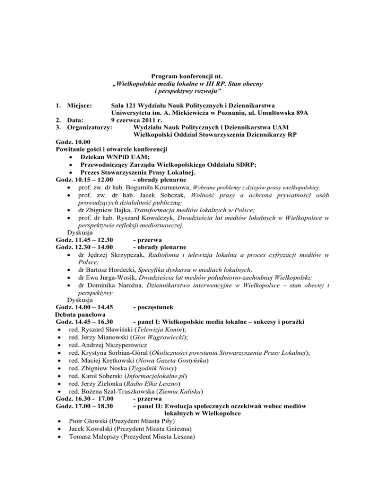 Program konferencji nt. „Wielkopolskie media lokalne w III RP. Stan obecny i perspektywy rozwoju” Sala 121 Wydziału Nauk Politycznych i Dziennikarstwa Uniwersytetu im. A. Mickiewicza w Poznaniu, ul. Umultowska 89A 2. Data: 9 czerwca 2011 r. 3. Organizatorzy: Wydziału Nauk Politycznych i Dziennikarstwa UAM Wielkopolski Oddział Stowarzyszenia Dziennikarzy RP Godz. 10.00 Powitanie gości i otwarcie konferencji Dziekan WNPiD UAM; Przewodniczący Zarządu Wielkopolskiego Oddziału SDRP; Prezes Stowarzyszenia Prasy Lokalnej. Godz. 10.15 – 12.00 - obrady plenarne prof. zw. dr hab. Bogumiła Kosmanowa, Wybrane problemy z dziejów prasy wielkopolskiej; prof. zw. dr hab. Jacek Sobczak, Wolność prasy a ochrona prywatności osób prowadzących działalność publiczną; dr Zbigniew Bajka, Transformacja mediów lokalnych w Polsce; prof. dr hab. Ryszard Kowalczyk, Dwadzieścia lat mediów lokalnych w Wielkopolsce w perspektywie refleksji medioznawczej. Dyskusja Godz. 11.45 – 12.30 - przerwa Godz. 12.30 – 14.00 - obrady plenarne dr Jędrzej Skrzypczak, Radiofonia i telewizja lokalna a proces cyfryzacji mediów w Polsce; dr Bartosz Hordecki, Specyfika dyskursu w mediach lokalnych; dr Ewa Jurga-Wosik, Dwadzieścia lat mediów południowo-zachodniej Wielkopolski; dr Dominika Narożna, Dziennikarstwo interwencyjne w Wielkopolsce – stan obecny i perspektywy Dyskusja Godz. 14.00 – 14.45 - poczęstunek Debata panelowa Godz. 14.45 – 16.30 - panel I: Wielkopolskie media lokalne – sukcesy i porażki red. Ryszard Sławiński (Telewizja Konin); red. Jerzy Mianowski (Głos Wągrowiecki); red. Andrzej Niczyperowicz red. Krystyna Sorbian-Góral (Okoliczności powstania Stowarzyszenia Prasy Lokalnej); red. Maciej Kretkowski (Nowa Gazeta Gostyńska) red. Zbigniew Noska (Tygodnik Nowy) red. Karol Soberski (Informacjelokalne.pl) red. Jerzy Zielonka (Radio Elka Leszno) red. Bożena Szal-Truszkowska (Ziemia Kaliska) Godz. 16.30 - 17.00 - przerwa Godz. 17.00 – 18.30 - panel II: Ewolucja społecznych oczekiwań wobec mediów lokalnych w Wielkopolsce Piotr Głowski (Prezydent Miasta Piły) Jacek Kowalski (Prezydent Miasta Gniezna) Tomasz Malepszy (Prezydent Miasta Leszna) 1. Miejsce: Józef Nowicki (Prezydent Miasta Konina) Janusz Pęcherz (Prezydent Miasta Kalisza) Jarosław Urbaniak (Prezydent Miasta Ostrowa Wlkp.) Godz. 18.30 - podsumowanie i zamknięcie obrad