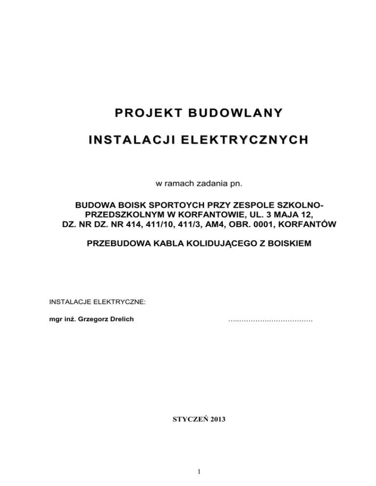 PROJEKT BUDOWLANY INSTALACJI ELEKTRYCZNYCH w ramach zadania pn. BUDOWA BOISK SPORTOYCH PRZY ZESPOLE SZKOLNOPRZEDSZKOLNYM W KORFANTOWIE, UL. 3 MAJA 12, DZ. NR DZ. NR 414, 411/10, 411/3, AM4, OBR. 0001, KORFANTÓW PRZEBUDOWA KABLA KOLIDUJĄCEGO Z BOISKIEM INSTALACJE ELEKTRYCZNE: mgr inż. Grzegorz Drelich …..………….………………. STYCZEŃ 2013 1 WYKAZ ZAWARTOŚCI PROJEKTU CZĘŚĆ OPISOWA STRONA TYTUŁOWA WYKAZ ZAWARTOŚCI PROJEKTU OPIS TECHNICZNY Podstawa i zakres opracowania Podstawa opracowania Zakres opracowania. Opis przebudowy Prowadzenie linii kablowych Uwagi końcowe Oświadczenie 1. 1.1. 1.2. 2. 3. 4. CZĘŚĆ RYSUNKOWA EP-1 Plan zagospodarowania terenu INFORMACJA BIOZ ZAŁĄCZNIKI: 1. Uprawnienia projektującego 2. Zaświadczenie o przynależności do izby inżynierów budownictwa projektującego 3. Pismo Tauron Dystrybucja nr RG3/7-RDE7/RR/7255/2012 dot. warunków przebudowy linii kablowej nN w m. Korfantów w związku z budową boisk sportowych przy ul. 3 Maja 4. Opinia ZUDP nr 44/2013 z dnia 201302-01. 2 OPIS TECHNICZNY 1. PODSTAWA I ZAKRES OPRACOWANIA 1.1.Podstawa opracowania Podstawę niniejszego opracowania stanowią: • Projekt zagospodarowania działki • Projekt architektoniczno - konstrukcyjny obiektu • Projekty branżowe instalacji sanitarnych • Warunki przebudowy sieci • Ustalenia z Inwestorem • Obowiązujące normy i normatywy projektowania, oprogramowanie komputerowe, katalogi branżowe, przepisy budowy i eksploatacji urządzeń elektrycznych 1.2.Zakres opracowania. Niniejsze projekt zawierać będzie przebudowę elektroenergetycznej linii kablowej kolidującej z projektowanymi boiskami sportowymi. W zakres opracowania wchodzi budowa nowej linii kablowych, demontaż istniejących linii kablowych oraz wykonanie mufy nN. 2. OPIS PRZEBUDOWY W miejscu inwestycji w kolizję z projektowanym boiskiem i murem oporowym wchodzi linia kablowa 0,4kV relacji ZK5489 – ZK5490 w obwodzie ZK5489 zasilanym ze stacji transformatorowej Korfantów. Zgodnie z pismem Tauron Dystrybucja nr RG3/7RDE7/RR/7255/2012 dot. warunków przebudowy linii kablowej nN odcinek kolidujący z płytą boiska należy przenieść poza obszar inwestycji. Aby zrealizować usunięcie kolizji należy: • Odkopać istniejącą linię kablową pomiędzy punktami EP-1 i EP -2 zgodnie z rysunkiem EP-1 • Wykopać rów dla projektowanego odcinka linii kablowej, wykonać w nim podsypkę z piasku (wg N SEP-E-004) • Przełożyć istniejący kabel do nowego rowu. • Przecięć istniejący kabel usuwając i utylizując nadmiar jego długości • Wykonać mufę MF-1 łączącą linię kablową (w rejonie mufy pozostawić zapas kabla) • Wykonać badania odbiorcze i zasypać linię zgodnie z N SEP-E-004 Kable należy układać w ziemi zgodnie z normą N SEP-E-004, po wyznaczeniu trasy kablowej przez geodetę. Głębokość rowu kablowego winna wynosić 70cm, dla kabli oświetleniowych w gruncie, szerokość wykopu 50cm, ziemia z wykopu winna być odkładana na jedną stronę celem umożliwienia dostępu do rowu na całej jego długości. Łuki na zmianach kierunku prowadzenia kabla winny wynosić tyle ile promień gięcia kabla (dla kabli polwinitowych 10x średnica zewnętrzna). Po wyrównaniu dna rowu kablowego należy wykonać na nim 10cm podsypkę z piasku, ułożyć kabel lekko falistą linią, przykryć go 10cm warstwą piasku i 15cm warstwą gruntu rodzimego, następnie nad kablem rozłożyć niebieską folię oznaczająca przebieg kabla. Folia winna posiadać grubość min. 0,5mm i szerokość 20cm. W celu umożliwienia identyfikacji ułożonych kabli należy zastosować oznaczniki kablowe. Oznaczniki powinny być wykonane z materiału odpornego na wpływy środowiska oraz mieć trwałe napisy. W niniejszym przypadku oznaczenia wykonać w rejonie mufy i punktu EP-1. uprawnionego 3 3. OCHRONA PRZECIWPORAŻENIOWA Warunki ochrony przeciwporażeniowej w przedmiotowym przypadku ulegną poprawie gdyż linia kablowa ulegnie skróceniu, czyli impedancja pętli zwarcia zmniejszy się. Ochronę należy wykonać zgodnie z PN-HD 60364-4-41 z listopada 2009. 4. UWAGI KOŃCOWE Wykonanie wszystkich prac powinno być zgodne z obowiązującymi normami i przepisami BHP. Wykonawcą prac może być przedsiębiorca lub osoba posiadająca uprawnienia do wykonywania tego rodzaju prac. Warunki pracy linii po przebudowie nie pogorszą się gdyż linia ulegnie zkróceniu. Spadek napięcia i impedancja pętli zwarcia zmaleje. 4 OŚWIADCZENIE Na podstawi Ustawy z dnia 7 lipca 1994r. – Prawo Budowlane (jednolity tekst Dz. U. Z 2003r Nr 207, poz. 2016 z późniejszymi zmianami) ZGODNIE Z ART. 20 UST. 4 PRAWA BUDOWLANEGO OŚWIADCZAM, ŻE PROJEKT BUDOWLANY INSTALACJI ELEKTRYCZNYCH: BUDOWA KOMPLEKSU BOISK SPORTOWYCH PRZY ZESPOLE SZKOLNOPRZEDSZKOLNYM, UL. 3 MAJA 12, 48-317 KORFANTÓW, DZ. NR 414, 411/10, 411/3 – PRZEBUDOWA KABLA KOLIDUJĄCEGO ZOSTAŁ WYKONANY ZGODNIE Z OBOWIĄZUJĄCYMI PRZEPISAMI, ZASADAMI WIEDZY TECHNICZNEJ, NORMAMI I JEST KOMPLETNY DLA CELU, JAKIEMU MA SŁUŻYĆ. Projektował: mgr inż. Grzegorz Drelich projektowanie instalacji, sieci i urządzeń elektrycznych b.o. Nr upr. SLK/0605/POOE/O4 Nr ewid. Ś.O.I.I.B. SLK/IE/1421/02 ............................................................... DOKUMENTACJA PODLEGA OCHRONIE DÓBR OSOBISTYCH I PRAW AUTORSKICH. NIEDOZWOLONE JEST KOPIOWANIE, ODSTĘPOWANIE INNYM JEDNOSTKOM PRAWNYM LUB FIZYCZNYM, W CAŁOŚCI LUB WE FRAGMENTACH, DOKONYWANIE ZMIAN LUB POPRAWEK BEZ WIEDZY AUTORÓW. (Ustawa o prawie autorskim i prawach pokrewnych Dz.U.Nr 24 poz. 83 z dnia 04-021994) 5