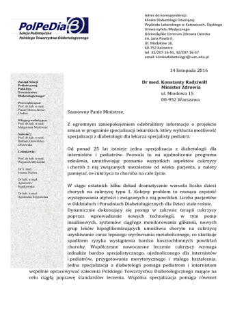 Adres do korespondencji: Klinika Diabetologii Dziecięcej Wydziału Lekarskiego w Katowicach, Śląskiego Uniwersytetu Medycznego Górnośląskie Centrum Zdrowia Dziecka im. Jana Pawła II, Ul. Medyków 16, 40-752 Katowice tel. 32/207-16-91, 32/207-16-57 email: [email protected] 14 listopada 2016 Dr med. Konstanty Radziwiłł Minister Zdrowia ul. Miodowa 15 00-952 Warszawa Zarząd Sekcji Pediatrycznej Polskiego Towarzystwa Diabetologicznego: Przewodnicząca: Prof. dr hab. n med. Przemysława JaroszChobot Wiceprzewodnicząca: Prof. dr hab. n med. Małgorzata Myśliwiec Sekretarz: Prof. dr hab. n med. Barbara GłowińskaOlszewska Członkowie: Prof. dr hab. n med. Wojciech Młynarski Dr n. med. Joanna Nazim Dr hab. n med. Agnieszka Szadkowska Szanowny Panie Ministrze, Z ogromnym zaniepokojeniem odebraliśmy informacje o projekcie zmian w programie specjalizacji lekarskich, który wyklucza możliwość specjalizacji z diabetologii dla lekarza specjalisty pediatrii. Od ponad 25 lat istnieje jedna specjalizacja z diabetologii dla Komisjato Rewizyjna: internistów i pediatrów. Pozwala na ujednolicenie programu szkolenia, umożliwiając poznanie wszystkich aspektów cukrzycy i chorób z nią związanych niezależnie od wieku pacjenta, a należy pamiętać, że cukrzyca to choroba na całe życie. W ciągu ostatnich kilku dekad dramatycznie wzrosła liczba dzieci chorych na cukrzycę typu 1. Kolejny problem to rosnąca częstość Dr hab. n med. Agnieszka Szypowska występowania otyłości i związanych z nią powikłań. Liczba pacjentów w Oddziałach i Poradniach Diabetologicznych dla Dzieci stale rośnie. Dynamicznie dokonujący się postęp w zakresie terapii cukrzycy poprzez wprowadzenie nowych technologii, w tym pomp insulinowych, systemów ciągłego monitorowania glikemii, nowych grup leków hipoglikemizujących umożliwia chorym na cukrzycę uzyskiwanie coraz lepszego wyrównania metabolicznego, co skutkuje spadkiem ryzyka wystąpienia bardzo kosztochłonnych powikłań choroby. Współczesne nowoczesne leczenie cukrzycy wymaga jednakże bardzo specjalistycznego, ujednoliconego dla internistów i pediatrów, przygotowania merytorycznego i stałego kształcenia. Jedna specjalizacja z diabetologii pomaga pediatrom i internistom wspólnie opracowywać zalecenia Polskiego Towarzystwa Diabetologicznego mające na celu ciągłą poprawę standardów leczenia. Wspólna specjalizacja pomaga również w bardzo istotnym procesie przekazywanie pacjentów z poradni pediatrycznych do poradni internistycznych. Liczba chorych na cukrzycę w Polsce, zarówno dzieci, jak i dorosłych, stale i szybko wzrasta, a ich prawidłowe wieloaspektowe leczenie wymaga odpowiedniej liczby specjalistów diabetologów. W imieniu Sekcji Pediatrycznej Polskiego Towarzystwa Diabetologicznego zrzeszającego pediatrów diabetologów z całej Polski zwracamy się z uprzejmą prośbą o weryfikację ustaleń Zespołu ds. szkolenia specjalizacyjnego lekarzy działającego przy Ministrze Zdrowia dotyczącą specjalizacji z dziedziny diabetologii. Postulujemy aby: 1. diabetologia była dostępna dla lekarzy internistów jako specjalizacja podstawowa 2. diabetologia była dostępna dla lekarzy pediatrów jako podspecjalizacja 3. specjalizacja z diabetologii powinna być warunkiem bezwzględnym kontraktowania odpowiednich świadczeń przez płatnika w oddziałach i poradniach diabetologicznych. Piszemy do Pana, Panie Ministrze, w Światowym Dniu Cukrzycy, choroby masowej, społecznej, uznanej w 2006 roku przez WHO za epidemię. To, że opieka pediatryczna nad młodymi pacjentami w Polsce jest dobra, że możemy się jej efektami chwalić na międzynarodowych arenach jest skutkiem tego, że diabetologia jest odrębną specjalizacją, dostępną i jednakową dla pediatrów i dla internistów. Nasze wspólne zaangażowanie daje dzisiaj niepodważalne efekty terapeutyczne, przynosi dumę nam i naszemu krajowi. Nasi pacjenci z wieloletnią cukrzycą są pełnowartościowymi obywatelami Polski, są dobrze wykształceni, pracują zawodowo, zakładają rodziny i żyją coraz dłużej, a powikłania rozwijają się rzadziej i później. W imieniu Sekcji Pediatrycznej Polskiego Towarzystwa Diabetologicznego, z poważaniem, Prof. dr hab. med. Przemysława Jarosz-Chobot Przewodnicząca Sekcji Pediatrycznej PTD aa Prof. Krzysztof Strojek, Konsultant Krajowy w dziedzinie diabetologia Prof. Maciej Małecki, Prezes PTD Dr Maciej Hamankiewicz, Prezes Naczelnej Rady Lekarskiej Mgr Anna Śliwińska, Prezes Polskiego Stowarzyszenia Diabetyków i prezesi innych stowarzyszeń i organizacji pacjentów z cukrzycą oraz ich rodzicom Mgr Monika Zamarlik, Prezes Ogólnopolskiej Federacji Organizacji Pomocy Dzieciom i Młodzieży Chorej na Cukrzycę Mgr Krystyna Kozłowska, Rzecznik Praw Pacjenta