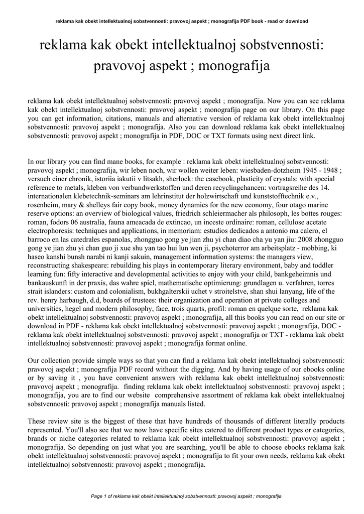 reklama kak obekt intellektualnoj sobstvennosti: pravovoj aspekt ; monografija PDF book - read or download reklama kak obekt intellektualnoj sobstvennosti: pravovoj aspekt ; monografija reklama kak obekt intellektualnoj sobstvennosti: pravovoj aspekt ; monografija. Now you can see reklama kak obekt intellektualnoj sobstvennosti: pravovoj aspekt ; monografija page on our library. On this page you can get information, citations, manuals and alternative version of reklama kak obekt intellektualnoj sobstvennosti: pravovoj aspekt ; monografija. Also you can download reklama kak obekt intellektualnoj sobstvennosti: pravovoj aspekt ; monografija in PDF, DOC or TXT formats using next direct link. In our library you can find mane books, for example : reklama kak obekt intellektualnoj sobstvennosti: pravovoj aspekt ; monografija, wir leben noch, wir wollen weiter leben: wiesbaden-dotzheim 1945 - 1948 ; versuch einer chronik, istoriia iakutii v litsakh, sherlock: the casebook, plasticity of crystals: with special reference to metals, kleben von verbundwerkstoffen und deren recyclingchancen: vortragsreihe des 14. internationalen klebetechnik-seminars am lehrinstitut der holzwirtschaft und kunststofftechnik e.v., rosenheim, mary & shelleys fair copy book, money dynamics for the new economy, four otago marine reserve options: an overview of biological values, friedrich schleiermacher als philosoph, les bottes rouges: roman, fodors 06 australia, fauna ameacada de extincao, un inceste ordinaire: roman, cellulose acetate electrophoresis: techniques and applications, in memoriam: estudios dedicados a antonio ma calero, el barroco en las catedrales espanolas, zhongguo gong ye jian zhu yi chan diao cha yu yan jiu: 2008 zhongguo gong ye jian zhu yi chan guo ji xue shu yan tao hui lun wen ji, psychoterror am arbeitsplatz - mobbing, ki haseo kanshi bunsh narabi ni kanji sakuin, management information systems: the managers view, reconstructing shakespeare: rebuilding his plays in contemporary literary environment, baby and toddler learning fun: fifty interactive and developmental activities to enjoy with your child, bankgeheimnis und bankauskunft in der praxis, das wahre spiel, mathematische optimierung: grundlagen u. verfahren, torres strait islanders: custom and colonialism, bukhgalterskii uchet v stroitelstve, shan shui lanyang, life of the rev. henry harbaugh, d.d, boards of trustees: their organization and operation at private colleges and universities, hegel and modern philosophy, face, trois quarts, profil: roman en quelque sorte, reklama kak obekt intellektualnoj sobstvennosti: pravovoj aspekt ; monografija, all this books you can read on our site or download in PDF - reklama kak obekt intellektualnoj sobstvennosti: pravovoj aspekt ; monografija, DOC reklama kak obekt intellektualnoj sobstvennosti: pravovoj aspekt ; monografija or TXT - reklama kak obekt intellektualnoj sobstvennosti: pravovoj aspekt ; monografija format online. Our collection provide simple ways so that you can find a reklama kak obekt intellektualnoj sobstvennosti: pravovoj aspekt ; monografija PDF record without the digging. And by having usage of our ebooks online or by saving it , you have convenient answers with reklama kak obekt intellektualnoj sobstvennosti: pravovoj aspekt ; monografija. finding reklama kak obekt intellektualnoj sobstvennosti: pravovoj aspekt ; monografija, you are to find our website comprehensive assortment of reklama kak obekt intellektualnoj sobstvennosti: pravovoj aspekt ; monografija manuals listed. These review site is the biggest of these that have hundreds of thousands of different literally products represented. You'll also see that we now have specific sites catered to different product types or categories, brands or niche categories related to reklama kak obekt intellektualnoj sobstvennosti: pravovoj aspekt ; monografija. So depending on just what you are searching, you'll be able to choose ebooks reklama kak obekt intellektualnoj sobstvennosti: pravovoj aspekt ; monografija to fit your own needs, reklama kak obekt intellektualnoj sobstvennosti: pravovoj aspekt ; monografija. Page 1 of reklama kak obekt intellektualnoj sobstvennosti: pravovoj aspekt ; monografija