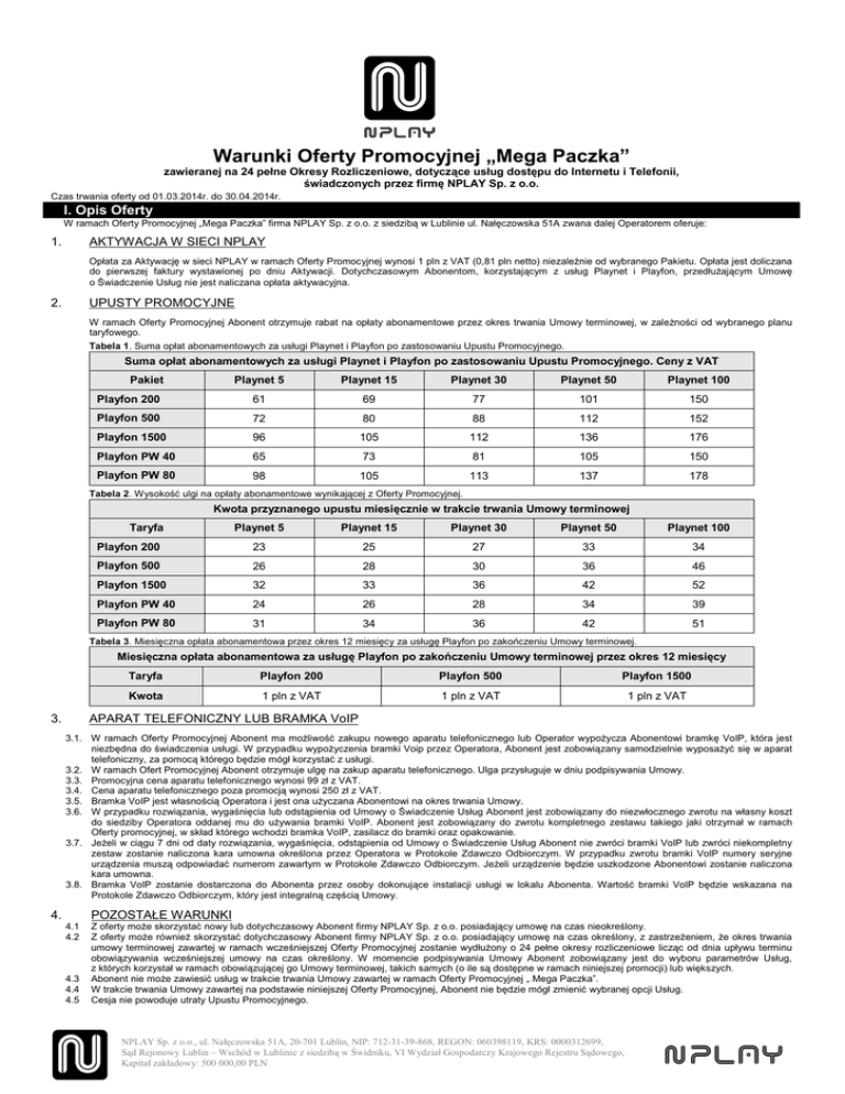 Warunki Oferty Promocyjnej „Mega Paczka” zawieranej na 24 pełne Okresy Rozliczeniowe, dotyczące usług dostępu do Internetu i Telefonii, świadczonych przez firmę NPLAY Sp. z o.o. Czas trwania oferty od 01.03.2014r. do 30.04.2014r. I. Opis Oferty W ramach Oferty Promocyjnej „Mega Paczka” firma NPLAY Sp. z o.o. z siedzibą w Lublinie ul. Nałęczowska 51A zwana dalej Operatorem oferuje: 1. AKTYWACJA W SIECI NPLAY Opłata za Aktywację w sieci NPLAY w ramach Oferty Promocyjnej wynosi 1 pln z VAT (0,81 pln netto) niezależnie od wybranego Pakietu. Opłata jest doliczana do pierwszej faktury wystawionej po dniu Aktywacji. Dotychczasowym Abonentom, korzystającym z usług Playnet i Playfon, przedłużającym Umowę o Świadczenie Usług nie jest naliczana opłata aktywacyjna. 2. UPUSTY PROMOCYJNE W ramach Oferty Promocyjnej Abonent otrzymuje rabat na opłaty abonamentowe przez okres trwania Umowy terminowej, w zależności od wybranego planu taryfowego. Tabela 1. Suma opłat abonamentowych za usługi Playnet i Playfon po zastosowaniu Upustu Promocyjnego. Suma opłat abonamentowych za usługi Playnet i Playfon po zastosowaniu Upustu Promocyjnego. Ceny z VAT Pakiet Playnet 5 Playnet 15 Playnet 30 Playnet 50 Playnet 100 Playfon 200 61 69 77 101 150 Playfon 500 72 80 88 112 152 Playfon 1500 96 105 112 136 176 Playfon PW 40 65 73 81 105 150 Playfon PW 80 98 105 113 137 178 Tabela 2. Wysokość ulgi na opłaty abonamentowe wynikającej z Oferty Promocyjnej. Kwota przyznanego upustu miesięcznie w trakcie trwania Umowy terminowej Playnet 5 Playnet 15 Playnet 30 Playnet 50 Playnet 100 Playfon 200 Taryfa 23 25 27 33 34 Playfon 500 26 28 30 36 46 Playfon 1500 32 33 36 42 52 Playfon PW 40 24 26 28 34 39 Playfon PW 80 31 34 36 42 51 Tabela 3. Miesięczna opłata abonamentowa przez okres 12 miesięcy za usługę Playfon po zakończeniu Umowy terminowej. Miesięczna opłata abonamentowa za usługę Playfon po zakończeniu Umowy terminowej przez okres 12 miesięcy 3. Taryfa Playfon 200 Playfon 500 Playfon 1500 Kwota 1 pln z VAT 1 pln z VAT 1 pln z VAT APARAT TELEFONICZNY LUB BRAMKA VoIP 3.1. W ramach Oferty Promocyjnej Abonent ma możliwość zakupu nowego aparatu telefonicznego lub Operator wypożycza Abonentowi bramkę VoIP, która jest niezbędna do świadczenia usługi. W przypadku wypożyczenia bramki Voip przez Operatora, Abonent jest zobowiązany samodzielnie wyposażyć się w aparat telefoniczny, za pomocą którego będzie mógł korzystać z usługi. 3.2. W ramach Ofert Promocyjnej Abonent otrzymuje ulgę na zakup aparatu telefonicznego. Ulga przysługuje w dniu podpisywania Umowy. 3.3. Promocyjna cena aparatu telefonicznego wynosi 99 zł z VAT. 3.4. Cena aparatu telefonicznego poza promocją wynosi 250 zł z VAT. 3.5. Bramka VoIP jest własnością Operatora i jest ona użyczana Abonentowi na okres trwania Umowy. 3.6. W przypadku rozwiązania, wygaśnięcia lub odstąpienia od Umowy o Świadczenie Usług Abonent jest zobowiązany do niezwłocznego zwrotu na własny koszt do siedziby Operatora oddanej mu do używania bramki VoIP. Abonent jest zobowiązany do zwrotu kompletnego zestawu takiego jaki otrzymał w ramach Oferty promocyjnej, w skład którego wchodzi bramka VoIP, zasilacz do bramki oraz opakowanie. 3.7. Jeżeli w ciągu 7 dni od daty rozwiązania, wygaśnięcia, odstąpienia od Umowy o Świadczenie Usług Abonent nie zwróci bramki VoIP lub zwróci niekompletny zestaw zostanie naliczona kara umowna określona przez Operatora w Protokole Zdawczo Odbiorczym. W przypadku zwrotu bramki VoIP numery seryjne urządzenia muszą odpowiadać numerom zawartym w Protokole Zdawczo Odbiorczym. Jeżeli urządzenie będzie uszkodzone Abonentowi zostanie naliczona kara umowna. 3.8. Bramka VoIP zostanie dostarczona do Abonenta przez osoby dokonujące instalacji usługi w lokalu Abonenta. Wartość bramki VoIP będzie wskazana na Protokole Zdawczo Odbiorczym, który jest integralną częścią Umowy. 4. POZOSTAŁE WARUNKI 4.1 4.2 4.3 4.4 4.5 Z oferty może skorzystać nowy lub dotychczasowy Abonent firmy NPLAY Sp. z o.o. posiadający umowę na czas nieokreślony. Z oferty może również skorzystać dotychczasowy Abonent firmy NPLAY Sp. z o.o. posiadający umowę na czas określony, z zastrzeżeniem, że okres trwania umowy terminowej zawartej w ramach wcześniejszej Oferty Promocyjnej zostanie wydłużony o 24 pełne okresy rozliczeniowe licząc od dnia upływu terminu obowiązywania wcześniejszej umowy na czas określony. W momencie podpisywania Umowy Abonent zobowiązany jest do wyboru parametrów Usług, z których korzystał w ramach obowiązującej go Umowy terminowej, takich samych (o ile są dostępne w ramach niniejszej promocji) lub większych. Abonent nie może zawiesić usług w trakcie trwania Umowy zawartej w ramach Oferty Promocyjnej „ Mega Paczka”. W trakcie trwania Umowy zawartej na podstawie niniejszej Oferty Promocyjnej, Abonent nie będzie mógł zmienić wybranej opcji Usług. Cesja nie powoduje utraty Upustu Promocyjnego. NPLAY Sp. z o.o., ul. Nałęczowska 51A, 20-701 Lublin, NIP: 712-31-39-868, REGON: 060398119, KRS: 0000312699, Sąd Rejonowy Lublin – Wschód w Lublinie z siedzibą w Świdniku, VI Wydział Gospodarczy Krajowego Rejestru Sądowego, Kapitał zakładowy: 500 000,00 PLN 4.6 Warunków Oferty Promocyjnej „Mega Paczka” nie można łączyć z innymi warunkami ofert promocyjnych, innymi cennikami oraz z warunkami innych akcji promocyjnych, które Operator prowadził, prowadzi i będzie prowadził w przyszłości, chyba że ich regulaminy stanowią inaczej. 4.7 Z oferty może skorzystać osoba fizyczna, osoba prawna lub jednostka organizacyjna nie posiadająca osobowości prawnej, która w okresie od 01.03.2014r. do 30.04.2014r. włącznie podpisze Umowę o Świadczenie Usług w ramach Oferty Promocyjnej „Mega Paczka” na 24 Okresy Rozliczeniowe i przedstawi: a) osoba fizyczna, obywatel RP: dowód osobisty wraz z informacją o aktualnym miejscu zam