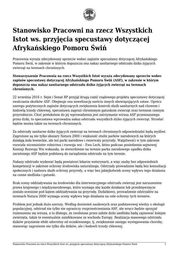 Stanowisko Pracowni na rzecz Wszystkich Istot ws. przyjęcia specustawy dotyczącej Afrykańskiego Pomoru Świń Pracownia wyraża zdecydowany sprzeciw wobec zapisów specustawy dotyczącej Afrykańskiego Pomoru Świń, w zakresie w którym dopuszcza ona nakaz sanitarnego odstrzału dziko żyjących zwierząt na terenach chronionych. Stowarzyszenie Pracownia na rzecz Wszystkich Istot wyraża zdecydowany sprzeciw wobec zapisów specustawy dotyczącej Afrykańskiego Pomoru Świń (ASF), w zakresie w którym dopuszcza ona nakaz sanitarnego odstrzału dziko żyjących zwierząt na terenach chronionych. 22 września 2016 r. Sejm i Senat RP przyjął drugą część rządowego projektu specustawy dotyczącej zwalczania skutków ASF. Obejmuje ona nowelizację sześciu innych obowiązujących ustaw. Oprócz szeregu pożytecznych zapisów dotyczących zwiększenia kontroli służb sanitarnych nad chowem i hodowlą trzody chlewnej, specustawa zagrozi chronionym gatunkom zwierząt oraz terenom cennym przyrodniczo. Choć pretekstem do jej wprowadzenia jest zatrzymanie wirusa ASF przenoszonego przez dziki, to specustawa wprowadza nakaz odstrzału wszystkich dziko żyjących zwierząt. Strzelać będzie można także na terenach chronionych. Za odstrzały sanitarne dziko żyjących zwierząt na terenach chronionych odpowiedzialni będą myśliwi. Zagrożone są nie tylko obszary Natura 2000 i większość otulin parków narodowych na których działają koła łowieckie, ale też parki narodowe i rezerwaty przyrody. Wątpliwości w tym zakresie rozwiała wiceminister rolnictwa i rozwoju wsi – Ewa Lech, która podczas posiedzenia sejmowej Komisji Rozwoju Wsi wskazała, że stwierdzenie na terenie parku narodowego upadku dzika zarażonego ASF będzie podstawą do zarządzenia odstrzału na tym terenie. Nakazy odstrzału wydawać będą powiatowi lekarze weterynarii, a więc osoby bez odpowiednich kompetencji w zakresie ochrony środowiska naturalnego. Odstrzały prowadzone będą bez konsultacji społecznych i nadzoru służb ochrony przyrody, a więc bez jakiejkolwiek oceny wpływu tego działania na cenne siedliska i gatunki. Brak oceny oddziaływania na środowisko dla interwencyjnego odstrzału zwierząt jest naruszeniem prawa krajowego i międzynarodowego, które wymaga aby każde działanie lub przedsięwzięcie zostało ocenione pod kątem oddziaływania na przyrodę. Dodatkowo, prowadzenie odstrzałów na terenach Natura 2000 wymaga oceny wpływu tego działania na cele ochrony tych terenów. Problem jest jednak dużo szerszy. Według doniesień naukowych oraz podstawowej wiedzy o ekologii populacyjnej. odstrzał nie tylko nie ograniczy rozprzestrzeniania ASF, ale wręcz będzie sprzyjał roznoszeniu się wirusa, a to dlatego, że zwolnione przez zabite dziki siedliska będą zajmować kolejne zwierzęta, także te ewentualnie zainfekowane ze wschodu Europy. Realizacja masowego odstrzału dzików przyniesie efekt odwrotny od oczekiwanego, tj. zwiększenie zasięgu występowania choroby, stanowiąc zagrożenie nie tylko dla dzików, ale i hodowli trzody chlewnej. Stanowisko Pracowni na rzecz Wszystkich Istot ws. przyjęcia specustawy dotyczącej Afrykańskiego Pomoru Świń 1 Dożyliśmy powrotu do głębokiej komuny Na mocy arbitralnej decyzji osób bez kompetencji przyrodniczych będzie można odstrzelić dowolną liczbę osobników dowolnych gatunków zwierząt w najcenniejszych terenach kraju, np. w Białowieskim Parku Narodowym. A to wszystko nie tylko nie zabezpieczy kraju przed ASF, ale jeszcze spotęguje zagrożenie tym wirusem. Gdzie tu sens i logika? mówi Radosław Ślusarczyk z Pracowni na rzecz Wszystkich Istot Stowarzyszenie stoi na stanowisku, iż przyjęta przez Parlament ustawa nie może być nadrzędna wobec innych ustaw realizujących cel publiczny jakim jest ochrona przyrody. Stowarzyszenie Pracownia na rzecz Wszystkich Istot Osoba kontaktowa: Radosław Ślusarczyk tel. 660 538 329; e-mail: [email protected] ul. Jasna 17, 43-360 Bystra Stanowisko Pracowni na rzecz Wszystkich Istot ws. przyjęcia specustawy dotyczącej Afrykańskiego Pomoru Świń 2