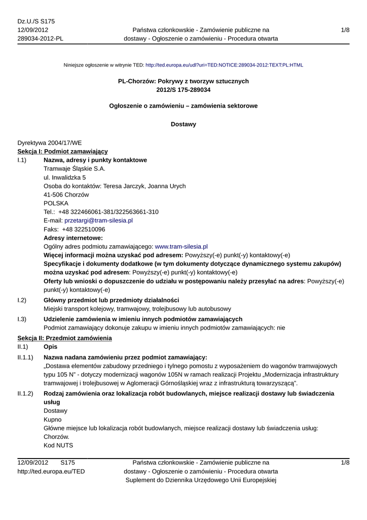 Dz.U./S S175 12/09/2012 289034-2012-PL Państwa członkowskie - Zamówienie publiczne na dostawy - Ogłoszenie o zamówieniu - Procedura otwarta 1/8 Niniejsze ogłoszenie w witrynie TED: http://ted.europa.eu/udl?uri=TED:NOTICE:289034-2012:TEXT:PL:HTML PL-Chorzów: Pokrywy z tworzyw sztucznych 2012/S 175-289034 Ogłoszenie o zamówieniu – zamówienia sektorowe Dostawy Dyrektywa 2004/17/WE Sekcja I: Podmiot zamawiający I.1) Nazwa, adresy i punkty kontaktowe Tramwaje Śląskie S.A. ul. Inwalidzka 5 Osoba do kontaktów: Teresa Jarczyk, Joanna Urych 41-506 Chorzów POLSKA Tel.: +48 322466061-381/322563661-310 E-mail: [email protected] Faks: +48 322510096 Adresy internetowe: Ogólny adres podmiotu zamawiającego: www.tram-silesia.pl Więcej informacji można uzyskać pod adresem: Powyższy(-e) punkt(-y) kontaktowy(-e) Specyfikacje i dokumenty dodatkowe (w tym dokumenty dotyczące dynamicznego systemu zakupów) można uzyskać pod adresem: Powyższy(-e) punkt(-y) kontaktowy(-e) Oferty lub wnioski o dopuszczenie do udziału w postępowaniu należy przesyłać na adres: Powyższy(-e) punkt(-y) kontaktowy(-e) I.2) Główny przedmiot lub przedmioty działalności Miejski transport kolejowy, tramwajowy, trolejbusowy lub autobusowy I.3) Udzielenie zamówienia w imieniu innych podmiotów zamawiających Podmiot zamawiający dokonuje zakupu w imieniu innych podmiotów zamawiających: nie Sekcja II: Przedmiot zamówienia II.1) Opis II.1.1) Nazwa nadana zamówieniu przez podmiot zamawiający: „Dostawa elementów zabudowy przedniego i tylnego pomostu z wyposażeniem do wagonów tramwajowych typu 105 N” - dotyczy modernizacji wagonów 105N w ramach realizacji Projektu „Modernizacja infrastruktury tramwajowej i trolejbusowej w Aglomeracji Górnośląskiej wraz z infrastrukturą towarzyszącą”. II.1.2) Rodzaj zamówienia oraz lokalizacja robót budowlanych, miejsce realizacji dostawy lub świadczenia usług Dostawy Kupno Główne miejsce lub lokalizacja robót budowlanych, miejsce realizacji dostawy lub świadczenia usług: Chorzów. Kod NUTS 12/09/2012 S175 http://ted.europa.eu/TED Państwa członkowskie - Zamówienie publiczne na dostawy - Ogłoszenie o zamówieniu - Procedura otwarta Suplement do Dziennika Urzędowego Unii Europejskiej 1/8 Dz.U./S S175 12/09/2012 289034-2012-PL Państwa członkowskie - Zamówienie publiczne na dostawy - Ogłoszenie o zamówieniu - Procedura otwarta 2/8 II.1.3) Informacje na temat zamówienia publicznego, umowy ramowej lub dynamicznego systemu zakupów (DSZ) Ogłoszenie dotyczy zamówienia publicznego II.1.4) Informacje na temat umowy ramowej II.1.5) Krótki opis zamówienia lub zakupu: Przedmiotem zamówienia jest dostarczenie kompletów elementów zabudowy przedniego i tylnego pomostu dla wagonów silnikowych sterujących oraz doczep czynnych. Elementy zabudowy muszą umożliwiać jazdę pojedynczą wagonów silnikowych sterujących, połączenie wagonów silnikowych sterujących w skład oraz połączenie wagonów silnikowych sterujących w skład z doczepami czynnymi. II.1.6) Wspólny Słownik Zamówień (CPV) 44618350, 44100000 II.1.7) Informacje na temat Porozumienia w sprawie zamówień rządowych (GPA) Zamówienie jest objęte Porozumieniem w sprawie zamówień rządowych (GPA): nie II.1.8) Informacje o częściach zamówienia To zamówienie podzielone jest na części: nie II.1.9) Informacje o ofertach wariantowych Dopuszcza się składanie ofert wariantowych: nie II.2) Wielkość lub zakres zamówienia II.2.1) Całkowita wielkość lub zakres: Zamówienie publiczne sektorowe prowadzone jest w trybie przetargu nieograniczonego o wartości większej od kwot określonych w przepisach wydanych na podstawie art. 11 ust. 8 ustawy Prawo zamówień publicznych (teks jednolity Dz. U. z 2010 r. nr 113, poz. 759 z późn. zm.) - dla zamówień sektorowych. II.2.2) Informacje o opcjach II.2.3) Informacje o wznowieniach Jest to zamówienie podlegające wznowieniu: nie II.3) Czas trwania zamówienia lub termin realizacji Rozpoczęcie 9.11.2012 Zakończenie 10.9.2014 Sekcja III: Informacje o charakterze prawnym, ekonomicznym, finansowym i technicznym III.1) Warunki dotyczące zamówienia III.1.1) Wymagane wadia i gwarancje: 1. Wykonawca zobowiązany jest wnieść wadium w wysokości 50 000,00 PLN (słownie: pięćdziesiąt tysięcy PLN). 2. Wadium wnosi się przed upływem terminu składania ofert w jednej lub kilku następujących formach: a) pieniądzu, b) poręczeniach bankowych lub poręczeniach spółdzielczej kasy oszczędnościowo-kredytowej, z tym że poręczenie kasy jest zawsze poręczeniem pieniężnym, c) gwarancjach bankowych, d) gwarancjach ubezpieczeniowych, e) poręczeniach udzielanych przez podmioty, o których mowa w art. 6b ust. 5 pkt 2 ustawy z dnia 9.11.2000 r. o utworzeniu Polskiej Agencji Rozwoju Przedsiębiorczości (teks jednolity Dz. U. z 2007 r., nr 52, poz. 275 ze zm.). 3. Wadium wnoszone w pieniądzu wpłaca się przelewem na rachunek bankowy Zamawiającego: BANK PEKAO S.A. 64 12404272 1111 0000 4834 3969, określając tytuł wpłaty i numer sprawy. 12/09/2012 S175 http://ted.europa.eu/TED Państwa członkowskie - Zamówienie publiczne na dostawy - Ogłoszenie o zamówieniu - Procedura otwarta Suplement do Dziennika Urzędowego Unii Europejskiej 2/8 Dz.U./S S175 12/09/2012 289034-2012-PL Państwa członkowskie - Zamówienie publiczne na dostawy - Ogłoszenie o zamówieniu - Procedura otwarta 3/8 4. O uznaniu przez Zamawiającego, że wadium w pieniądzu wniesiono w wymaganym terminie, decyduje data wpływu środków na rachunek Zamawiającego. 5. Wadium wnoszone w pieniądzu Zamawiający przechowuje na rachunku bankowym. 6. Wykonawca winien załączyć do oferty oryginał dokumentu świadczącego o wniesieniu do Zamawiającego wadium w formie niepieniężnej lub kopię dokumentu potwierdzającego wniesienie wadium w pieniądzu. Wskazane jest, aby oryginał dokumentu świadczącego o wniesieniu wadium w formie niepieniężnej nie został n