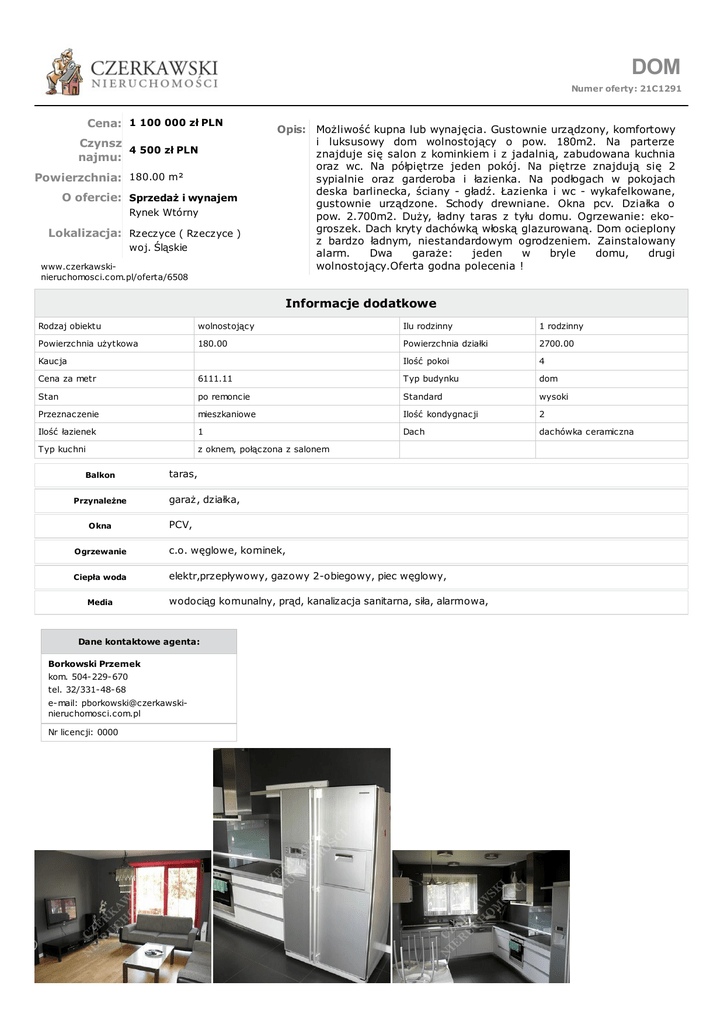 DOM Numer oferty: 21C1291 Cena: 1 100 000 zł PLN Czynsz 4 500 zł PLN najmu: Powierzchnia: 180.00 m² O ofercie: Sprzedaż i wynajem Rynek Wtórny Lokalizacja: Rzeczyce ( Rzeczyce ) woj. Śląskie www.czerkawskinieruchomosci.com.pl/oferta/6508 Opis: Możliwość kupna lub wynajęcia. Gustownie urządzony, komfortowy i luksusowy dom wolnostojący o pow. 180m2. Na parterze znajduje się salon z kominkiem i z jadalnią, zabudowana kuchnia oraz wc. Na półpiętrze jeden pokój. Na piętrze znajdują się 2 sypialnie oraz garderoba i łazienka. Na podłogach w pokojach deska barlinecka, ściany - gładź. Łazienka i wc - wykafelkowane, gustownie urządzone. Schody drewniane. Okna pcv. Działka o pow. 2.700m2. Duży, ładny taras z tyłu domu. Ogrzewanie: ekogroszek. Dach kryty dachówką włoską glazurowaną. Dom ocieplony z bardzo ładnym, niestandardowym ogrodzeniem. Zainstalowany alarm. Dwa garaże: jeden w bryle domu, drugi wolnostojący.Oferta godna polecenia ! Informacje dodatkowe Rodzaj obiektu wolnostojący Ilu rodzinny 1 rodzinny Powierzchnia użytkowa 180.00 Powierzchnia działki 2700.00 Ilość pokoi 4 Kaucja Cena za metr 6111.11 Typ budynku dom Stan po remoncie Standard wysoki Przeznaczenie mieszkaniowe Ilość kondygnacji 2 Ilość łazienek 1 Dach dachówka ceramiczna Typ kuchni z oknem, połączona z salonem Balkon Przynależne Okna taras, garaż, działka, PCV, Ogrzewanie c.o. węglowe, kominek, Ciepła woda elektr,przepływowy, gazowy 2-obiegowy, piec węglowy, Media wodociąg komunalny, prąd, kanalizacja sanitarna, siła, alarmowa, Dane kontaktowe agenta: Borkowski Przemek kom. 504-229-670 tel. 32/331-48-68 e-mail: [email protected] Nr licencji: 0000 www.czerkawski-nieruchomosci.com.pl