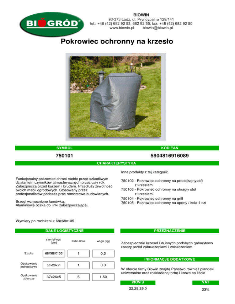 Pokrowiec ochronny na krzesło SYMBOL KOD EAN 750101 5904816916089 CHARAKTERYSTYKA Inne produkty z tej kategorii: Funkcjonalny pokrowiec chroni meble przed szkodliwym działaniem czynników atmosferycznych przez cały rok. Zabezpiecza przed kurzem i brudem. Przedłuży żywotność twoich mebli ogrodowych. Stosowany przez profesjonalistów podczas prac remontowo-budowlanych. Brzegi wzmocnione lamówką. Aluminiowe oczka do linki zabezpieczającej. 750102 - Pokrowiec ochronny na prostokątny stół z krzesłami 750103 - Pokrowiec ochronny na okrągły stół z krzesłami 750104 - Pokrowiec ochronny na grill 750105 - Pokrowiec ochronny na opony / koła 4 szt Wymiary po rozłożeniu: 68x68x105 DANE LOGISTYCZNE Sztuka PRZEZNACZENIE szer/gł/wys [cm] Ilość sztuk waga [kg] 68X68X105 1 0.3 Zabezpiecznie krzeseł lub innych podobych gabarytowo rzeczy przed zabrudzeniami i zniszczeniem. INFORMACJE DODATKOWE Opakowanie jednostkowe 36x29xx1 Opakowanie zbiorcze 37x26x5 1 0.3 W ofercie firmy Biowin znajdą Państwo również plandeki uniwersalne oraz rozkładaną torbę i kosze na liście. 5 1.50 PKWiU VAT 22.29.29.0 23%
