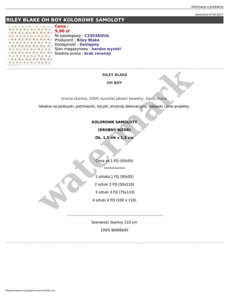 Informacje o produkcie Utworzono 07-03-2017 RILEY BLAKE OH BOY KOLOROWE SAMOLOTY Cena : 9,90 zł Nr katalogowy : C3303AQUA Producent : Riley Blake Dostępność : Dostępny Stan magazynowy : bardzo wysoki Średnia ocena : brak recenzji RILEY BLAKE er m ar k OH BOY Urocza tkanina, 100% wysokiej jakości bawełny. Gęsto tkana. Idealna na poduszki, patchworki, kocyki, artykuły dekoracyjne, zabawki i inne projekty. KOLOROWE SAMOLOTY (DROBNY WZÓR) Ok. 1,5 cm x 1,5 cm Cena za 1 FQ (50x55) at ************ 1 sztuka 1 FQ (50x55) 2 sztuki 2 FQ (50x110) w 3 sztuki 3 FQ (75x110) 4 sztuki 4 FQ (100 x 110) ........................................................................................ Szerokość tkaniny 110 cm 100% BAWEŁNY Wygenerowano w programie www.oscGold.com