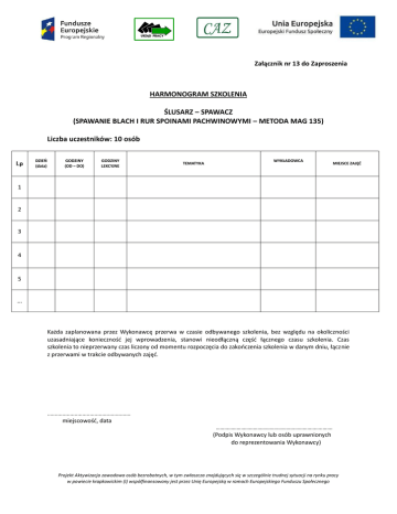 Załącznik nr 13 do Zaproszenia HARMONOGRAM SZKOLENIA ŚLUSARZ – SPAWACZ (SPAWANIE BLACH I RUR SPOINAMI PACHWINOWYMI – METODA MAG 135) Liczba uczestników: 10 osób l.p DZIEŃ (data) GODZINY (OD – DO) GODZINY LEKCYJNE TEMATYKA WYKŁADOWCA MIEJSCE ZAJĘĆ 1 2 3 4 5 ... Każda zaplanowana przez Wykonawcę przerwa w czasie odbywanego szkolenia, bez względu na okoliczności uzasadniające koniecznośd jej wprowadzenia, stanowi nieodłączną częśd łącznego czasu szkolenia. Czas szkolenia to nieprzerwany czas liczony od momentu rozpoczęcia do zakooczenia szkolenia w danym dniu, łącznie z przerwami w trakcie odbywanych zajęd. ....................................................... miejscowośd, data …………………………………………………………………..……. (Podpis Wykonawcy lub osób uprawnionych do reprezentowania Wykonawcy) Projekt Aktywizacja zawodowa osób bezrobotnych, w tym zwłaszcza znajdujących się w szczególnie trudnej sytuacji na rynku pracy w powiecie krapkowickim (I) współfinansowany jest przez Unię Europejską w ramach Europejskiego Funduszu Społecznego