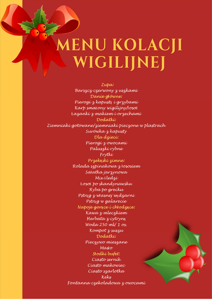 Zupa: Barszcz czerwony z uszkami Danie główne: Pierogi z kapustą i grzybami Karp smażony wigilijny/łosoś Łazanki z makiem i orzechami Dodatki: Ziemniaki gotowane/ziemniaki pieczone w plastrach Surówka z kapusty Dla dzieci: Pierogi z owocami Paluszki rybne Frytki Przekąski zimne: Rolada szpinakowa z łososiem Sałatka jarzynowa Mix śledzi Łosoś po skandynawsku Ryba po grecku Pstrąg z własnej wędzarni Pstrąg w galarecie Napoje gorące i chłodzące: Kawa z mleczkiem Herbata z cytryną Woda 250 ml/ 1 os. Kompot z suszu Dodatki: Pieczywo mieszane Masło Słodki bufet: Ciasto sernik Ciasto makowiec Ciasto szarlotka Keks Fontanna czekoladowa z owocami