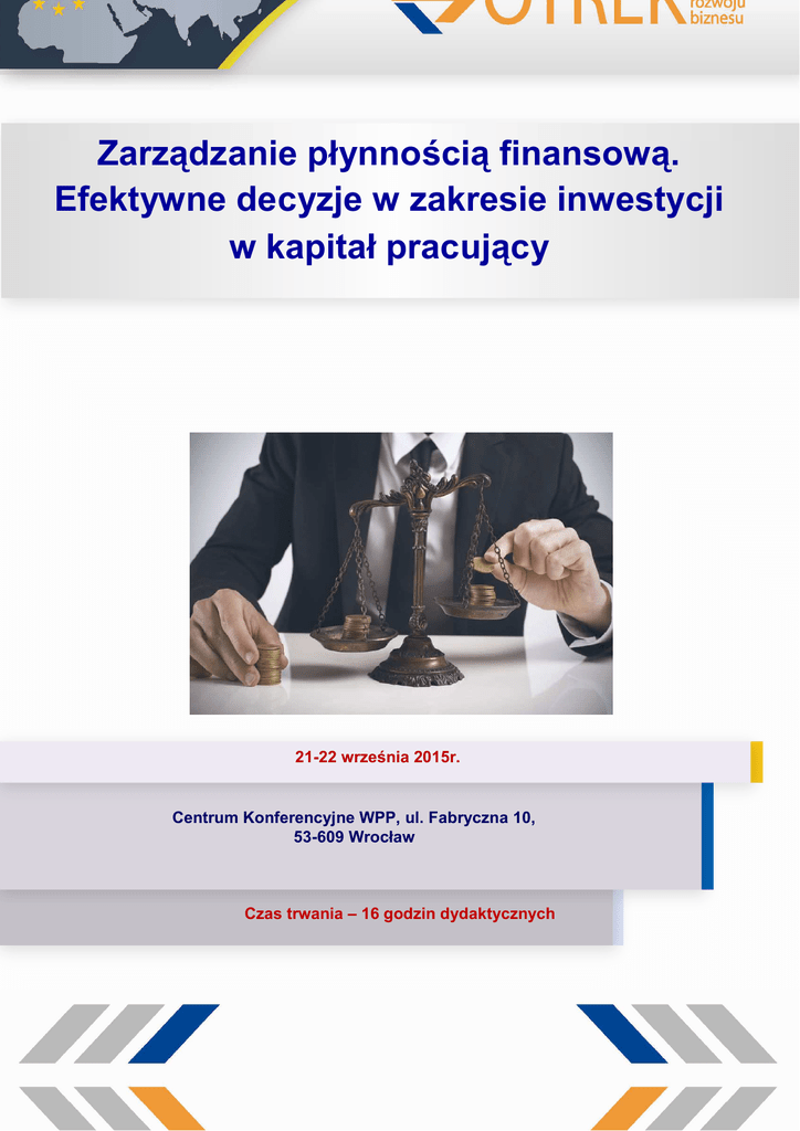 Zarządzanie płynnością finansową. Efektywne decyzje w zakresie inwestycji w kapitał pracujący 21-22 września 2015r. Centrum Konferencyjne WPP, ul. Fabryczna 10, 53-609 Wrocław Czas trwania – 16 godzin dydaktycznych Cel szkolenia: Celem szkolenia jest przybliżenie finansowych zasad dotyczących zarządzania aktywami bieżącymi, mającymi wpływ na płynność finansową z punktu widzenia maksymalizacji ekonomicznej wartości przedsiębiorstwa. W trakcie szkolenia dokonana zostanie prezentacja wiedzy pozwalającej na efektywniejsze decyzje w zakresie zarządzania zapasami, środkami pieniężnymi i należnościami. Niniejsze elementy majątku obrotowego zaprezentowane zostaną, jako krótkoterminowe inwestycje rzeczowe. Przedstawione w czasie szkolenia propozycje zastosowania prezentowanych zagadnień w praktyce ilustrować będą studia przypadków. Wykładowca: dr hab. Grzegorz Michalski specjalista z zakresu finansów przedsiębiorstw adiunkt w Instytucie Zarządzania Finansami Uniwersytetu Ekonomicznego we Wrocławiu. Współredaktor i członek rad naukowych specjalistycznych, branżowych czasopism z zakresu płynności finansowej i zarządzania finansami, nadających ton przyszłemu kierunkowi rozwoju praktyki zarządzania płynnością finansową i finansami takich jak m.in.: Journal of Corporate Treasury Management (JCTM), Australasian Accounting Business & Finance Journal (AABFJ). Jako trener przede wszystkim ukierunkowuje uczestników na sposób rozumienia głównych idei związanych z tematem szkolenia, łącząc je z prostotą i jasnością przekazu i jak najwyższym poziomem merytorycznym. Autor wielu naukowych i praktycznych publikacji oraz książek m.in.: "Strategiczne zarządzanie płynnością finansową w przedsiębiorstwie" oraz "Płynność finansowa w małych i średnich przedsiębiorstwach. Miejsce i czas warsztatów: Sala szkoleniowa Centrum Konferencyjnego WPP, ul. Fabryczna 10, 53-609 Wrocław, w godzinach 9:00 – 16:00 Program: 1. Cel i potrzeba zarządzania płynnością finansową. Zgłoszenia: Zgłoszenie udziału w warsztatach należy przesłać faksem na nr 71/356 50 90, najpóźniej na 5 dni przed terminem rozpoczęcia zajęć. Formularz zgłoszenia w załączeniu lub do pobrania z naszej strony, www.otrek.com.pl 2. Podstawowe definicje i pojęcia odnoszące się do zarządzania Kontakt: 4. Kapitał obrotowy netto (Net Working Capital NWC): Dodatkowych informacji Halina Skórska, Tel. 71/ 356 email: [email protected] udziela: 50 90, Cena: Opłata za szkolenie, wynosi 1.190, 00 PLN + 23% VAT i obejmuje udział w warsztatach, 16 godzin dydaktycznych, materiały dydaktyczne piśmiennicze, przerwy kawowe oraz zaświadczenie. Dla dwóch lub więcej osób zgłoszonych z jednej firmy rabat w wysokości 5% Przy oświadczeniu, iż szkolenie finansowane jest ze środków publicznych, opłata za szkolenie bez podatku VAT Należność za udział w szkoleniu, prosimy przekazać przelewem, po otrzymaniu potwierdzenia o rozpoczęciu szkolenia, na konto: BZ WBK I/O Wrocław, Nr: 85 1090 2398 0000 0001 1426 1336 płynnością finansową. 3. Pomiar poziomu płynności finansowe.: 5. Zarządzanie zapasami w przedsiębiorstwie. 6. Zarządzanie należnościami. 7. Strategie przedsiębiorstwa wobec odbiorców w zakresie udzielania kredytu kupieckiego. 8. Zarządzanie środkami pieniężnymi. 9. Krótkoterminowe źródła finansowania przedsiębiorstwa. 10. Wartość płynności finansowej. Szczegółowy program szkolenia do pobrania z naszej strony internetowej www.otrek.com.pl