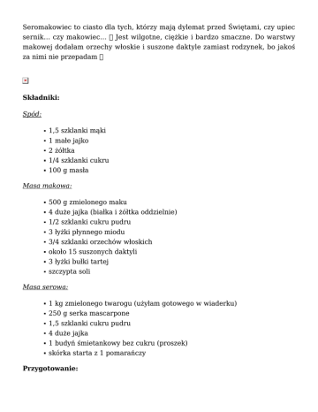 Seromakowiec to ciasto dla tych, którzy mają dylemat przed Świętami, czy upiec sernik… czy makowiec… Jest wilgotne, ciężkie i bardzo smaczne. Do warstwy makowej dodałam orzechy włoskie i suszone daktyle zamiast rodzynek, bo jakoś za nimi nie przepadam Składniki: Spód: 1,5 szklanki mąki 1 małe jajko 2 żółtka 1/4 szklanki cukru 100 g masła Masa makowa: 500 g zmielonego maku 4 duże jajka (białka i żółtka oddzielnie) 1/2 szklanki cukru pudru 3 łyżki płynnego miodu 3/4 szklanki orzechów włoskich około 15 suszonych daktyli 3 łyżki bułki tartej szczypta soli Masa serowa: 1 kg zmielonego twarogu (użyłam gotowego w wiaderku) 250 g serka mascarpone 1,5 szklanki cukru pudru 4 duże jajka 1 budyń śmietankowy bez cukru (proszek) skórka starta z 1 pomarańczy Przygotowanie: Spód: Mąkę przesiać i dodać resztę składników. Posiekać nożem masło na malutkie kawałeczki, następnie wszystko zagnieść, uformować kulę, zawinąć folią i włożyć do lodówki na około 30 min. Następnie ciasto rozwałkować między dwoma arkuszami papieru do pieczenia, wyłożyć nim dno prostokątnej formy (forma mierzona u góry: 24 x 36) wyłożonej papierem do pieczenia i ponakłuwać widelcem. Jeżeli ciasto będzie się rwało, należy wylepić formę ręcznie. Piec w piekarniku nagrzanym do 180 °C przez około 15 min. Masa makowa: Mielony mak zalać wrzątkiem i odstawić do wystudzenia. Dokładnie odsączyć, dodać drobno posiekane orzechy włoskie i daktyle, żółtka, cukier puder, miód i bułkę tartą. Wszystko wymieszać. Białka ubić na sztywną pianę ze szczyptą soli i delikatnie wymieszać z masą makową. Masa serowa: Ser zmiksować z jajkami, cukrem pudrem i mascarpone. Dodać budyń i skórkę startą z pomarańczy. Krótko zmiksować, tylko do połączenia składników. Na podpieczony spód przełożyć masę makową i wyrównać. Na nią wylać masę serową i również wyrównać. Piec w piekarniku nagrzanym do 170°C przez 50 minut, następnie zmniejszyć temperaturę do 150°C i piec przez około 35 minut. Wyłączyć piekarnik, uchylić drzwiczki i pozostawić na około 15 minut. Następnie wystudzić i schłodzić w lodówce. Smacznego