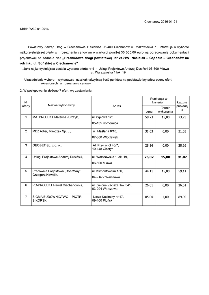 Ciechanów 2016-01-21 SBBHP.232.01.2016 Powiatowy Zarząd Dróg w Ciechanowie z siedzibą 06-400 Ciechanów ul. Mazowiecka 7 , informuje o wyborze najkorzystniejszej oferty w rozeznaniu cenowym o wartości poniżej 30 000,00 euro na opracowanie dokumentacji projektowej na zadanie pn.: ,,Przebudowa drogi powiatowej nr 2421W Nasielsk – Gąsocin – Ciechanów na odcinku ul. Sońskiej w Ciechanowie” 1. Jako najkorzystniejsza została wybrana oferta nr 4 - Usługi Projektowe Andrzej Dusiński 06-500 Mława ul. Warszawska 1 lok. 19 Uzasadnienie wyboru: wykonawca uzyskał najwyższą ilość punktów na podstawie kryteriów oceny ofert określonych w rozeznaniu cenowym 2. W postępowaniu złożono 7 ofert wg zestawienia: Nr oferty 1 Punktacja w kryterium Nazwa wykonawcy MATPROJEKT Mateusz Jurczyk, Adres ul. Łąkowa 12f, Łączna punktacj a cena Termin wykonania 58,73 15,00 73,73 31,03 0,00 31,03 05-135 Komornica 2 MBZ Adler, Tomczak Sp. J., ul. Maślana 8/10, 87-800 Włocławek 3 GEOBET Sp. z o. o., Al. Przyjaciół 40/7, 10-148 Olsztyn 28,26 0,00 28,26 4 Usługi Projektowe Andrzej Dusiński, ul. Warszawska 1 lok. 19, 76,02 15,00 91,02 44,11 15,00 59,11 06-500 Mława 5 Pracownia Projektowa „RoadWay” Grzegorz Kowalik, ul. Klimontowska 15b, 6 PC-PROJEKT Paweł Ciechanowicz, ul. Zielone Zacisze 1m. 341, 03-294 Warszawa 26,01 0,00 26,01 7 SIGMA BUDOWNICTWO – PIOTR SIKORSKI Nowe Koziminy nr 17, 09-100 Płońsk 85,00 4,00 89,00 04 – 672 Warszawa