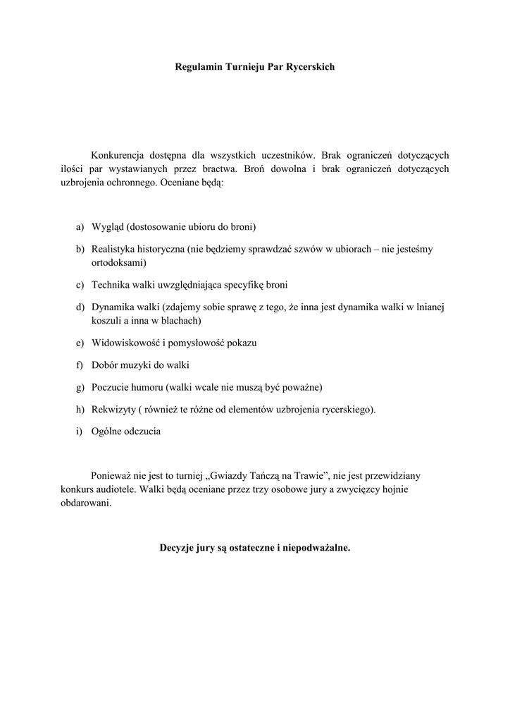 Regulamin Turnieju Par Rycerskich Konkurencja dostępna dla wszystkich uczestników. Brak ograniczeń dotyczących ilości par wystawianych przez bractwa. Broń dowolna i brak ograniczeń dotyczących uzbrojenia ochronnego. Oceniane będą: a) Wygląd (dostosowanie ubioru do broni) b) Realistyka historyczna (nie będziemy sprawdzać szwów w ubiorach – nie jesteśmy ortodoksami) c) Technika walki uwzględniająca specyfikę broni d) Dynamika walki (zdajemy sobie sprawę z tego, Ŝe inna jest dynamika walki w lnianej koszuli a inna w blachach) e) Widowiskowość i pomysłowość pokazu f) Dobór muzyki do walki g) Poczucie humoru (walki wcale nie muszą być powaŜne) h) Rekwizyty ( równieŜ te róŜne od elementów uzbrojenia rycerskiego). i) Ogólne odczucia PoniewaŜ nie jest to turniej „Gwiazdy Tańczą na Trawie”, nie jest przewidziany konkurs audiotele. Walki będą oceniane przez trzy osobowe jury a zwycięzcy hojnie obdarowani. Decyzje jury są ostateczne i niepodwaŜalne.