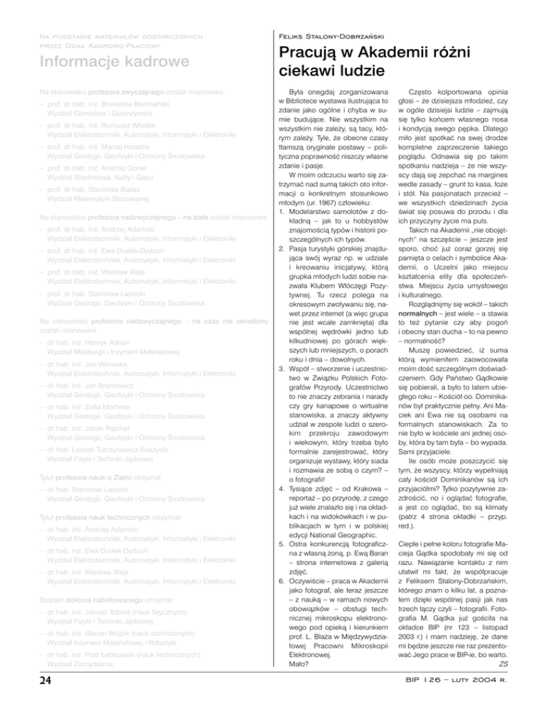 Na podstawie materia³ów dostarczonych przez Dzia³ Kadrowo-P³acowy Informacje kadrowe Na stanowisko profesora zwyczajnego zostali mianowani: – prof. dr hab. in¿. Bronis³aw Barchañski Wydzia³ Górnictwa i Geoin¿ynierii – prof. dr hab. in¿. Romuald W³odek Wydzia³ Elektrotechniki, Automatyki, Informatyki i Elektroniki – prof. dr hab. in¿. Maciej Kotarba Wydzia³ Geologii, Geofizyki i Ochrony Œrodowiska – prof. dr hab. in¿. Andrzej Gonet Wydzia³ Wiertnictwa, Nafty i Gazu – prof. dr hab. Stanis³aw Bia³as Wydzia³ Matematyki Stosowanej Na stanowisko profesora nadzwyczajnego – na sta³e zostali mianowani: – prof. dr hab. in¿. Andrzej Adamski Wydzia³ Elektrotechniki, Automatyki, Informatyki i Elektroniki – prof. dr hab. in¿. Ewa Dudek-Dyduch Wydzia³ Elektrotechniki, Automatyki, Informatyki i Elektroniki – prof. dr hab. in¿. Wies³aw Wajs Wydzia³ Elektrotechniki, Automatyki, Informatyki i Elektroniki – prof. dr hab. Stanis³aw Lasocki Wydzia³ Geologii, Geofizyki i Ochrony Œrodowiska Na stanowisko profesora nadzwyczajnego – na czas nie okreœlony zostali mianowani: – dr hab. in¿. Henryk Adrian Wydzia³ Metalurgii i In¿ynierii Materia³owej – dr hab. in¿. Jan Werewka Wydzia³ Elektrotechniki, Automatyki, Informatyki i Elektroniki – dr hab. in¿. Jan Bromowicz Wydzia³ Geologii, Geofizyki i Ochrony Œrodowiska – dr hab. in¿. Zofia Mortimer Wydzia³ Geologii, Geofizyki i Ochrony Œrodowiska – dr hab. in¿. Jacek Rajchel Wydzia³ Geologii, Geofizyki i Ochrony Œrodowiska – dr hab. Leszek Turczynowicz-Suszycki Wydzia³ Fizyki i Techniki J¹drowej Tytu³ profesora nauk o Ziemi otrzyma³: – dr hab. Stanis³aw Lasocki Wydzia³ Geologii, Geofizyki i Ochrony Œrodowiska Tytu³ profesora nauk technicznych otrzymali: – dr hab. in¿. Andrzej Adamski Wydzia³ Elektrotechniki, Automatyki, Informatyki i Elektroniki – dr hab. in¿. Ewa Dudek-Dyduch Wydzia³ Elektrotechniki, Automatyki, Informatyki i Elektroniki – dr hab. in¿. Wies³aw Wajs Wydzia³ Elektrotechniki, Automatyki, Informatyki i Elektroniki Stopieñ doktora habilitowanego otrzyma³: – dr hab. in¿. Janusz Tobo³a (nauk fizycznych) Wydzia³ Fizyki i Techniki J¹drowej – dr hab. in¿. Marian Wójcik (nauk technicznych) Wydzia³ In¿ynierii Materia³owej i Robotyki – dr hab. in¿. Piotr £ebkowski (nauk technicznych) Wydzia³ Zarz¹dzania 24 Feliks Stalony-Dobrzañski Pracuj¹ w Akademii ró¿ni ciekawi ludzie By³a onegdaj zorganizowana w Bibliotece wystawa ilustruj¹ca to zdanie jako ogólne i chyba w sumie buduj¹ce. Nie wszystkim na wszystkim nie zale¿y, s¹ tacy, którym zale¿y. Tyle, ¿e obecne czasy t³amsz¹ oryginale postawy – polityczna poprawnoœæ niszczy w³asne zdanie i pasje. W moim odczuciu warto siê zatrzymaæ nad sum¹ takich oto informacji o konkretnym stosunkowo m³odym (ur. 1967) cz³owieku: 1. Modelarstwo samolotów z dok³adn¹ – jak to u hobbystów znajomoœci¹ typów i historii poszczególnych ich typów. 2. Pasja turystyki górskiej znajduj¹ca swój wyraz np. w udziale i kreowaniu inicjatywy, któr¹ grupka m³odych ludzi sobie nazwa³a Klubem W³óczêgi Pozytywnej. Tu rzecz polega na okresowym zwo³ywaniu siê, nawet przez internet (a wiêc grupa nie jest wcale zamkniêta) dla wspólnej wêdrówki jedno lub kilkudniowej po górach wiêkszych lub mniejszych, o porach roku i dnia – dowolnych. 3. Wspó³ – stworzenie i uczestnictwo w Zwi¹zku Polskich Fotografów Przyrody. Uczestnictwo to nie znaczy zebrania i narady czy gry kanapowe o wirtualne stanowiska, a znaczy aktywny udzia³ w zespole ludzi o szerokim przekroju zawodowym i wiekowym, który trzeba by³o formalnie zarejestrowaæ, który organizuje wystawy, który siada i rozmawia ze sob¹ o czym? – o fotografii! 4. Tysi¹ce zdjêæ – od Krakowa – reporta¿ – po przyrodê, z czego ju¿ wiele znalaz³o siê i na ok³adkach i na widokówkach i w publikacjach w tym i w polskiej edycji National Geographic. 5. Ostra konkurencj¹ fotograficzna z w³asn¹ ¿on¹, p. Ew¹ Baran – strona internetowa z galeri¹ zdjêæ. 6. Oczywiœcie – praca w Akademii jako fotograf, ale teraz jeszcze – z nauk¹ – w ramach nowych obowi¹zków – obs³ugi technicznej mikroskopu elektronowego pod opiek¹ i kierunkiem prof. L. Bla¿a w Miêdzywydzia³owej Pracowni Mikroskopii Elektronowej. Ma³o? Czêsto kolportowana opinia g³osi – ¿e dzisiejsza m³odzie¿, czy w ogóle dzisiejsi ludzie – zajmuj¹ siê tylko koñcem w³asnego nosa i kondycj¹ swego pêpka. Dlatego mi³o jest spotkaæ na swej drodze kompletne zaprzeczenie takiego pogl¹du. Odnawia siê po takim spotkaniu nadzieja – ¿e nie wszyscy daj¹ siê zepchaæ na margines wedle zasady – grunt to kasa, ³o¿e i stó³. Na pasjonatach przecie¿ – we wszystkich dziedzinach ¿ycia œwiat siê posuwa do przodu i dla ich przyczyny ¿ycie ma puls. Takich na Akademii „nie obojêtnych” na szczêœcie – jeszcze jest sporo, choæ ju¿ coraz gorzej siê pamiêta o celach i symbolice Akademii, o Uczelni jako miejscu kszta³cenia elity dla spo³eczeñstwa. Miejscu ¿ycia umys³owego i kulturalnego. Rozgl¹dnijmy siê wokó³ – takich normalnych – jest wiele – a stawia to te¿ pytanie czy aby pogoñ i obecny stan ducha – to na pewno – normalnoœæ? Muszê powiedzieæ, i¿ suma któr¹ wymieni³em zaowocowa³a moim doœæ szczególnym doœwiadczeniem. Gdy Pañstwo G¹dkowie siê pobierali, a by³o to latem ubieg³ego roku – Koœció³ oo. Dominikanów by³ praktycznie pe³ny. Ani Maciek ani Ewa nie s¹ osobami na formalnych stanowiskach. Za to nie by³o w koœciele ani jednej osoby, która by tam by³a – bo wypada. Sami przyjaciele. Ile osób mo¿e poszczyciæ siê tym, ¿e wszyscy, którzy wype³niaj¹ ca³y koœció³ Dominikanów s¹ ich przyjació³mi? Tylko pozytywnie zazdroœciæ, no i ogl¹daæ fotografie, a jest co ogl¹daæ, bo s¹ klimaty (patrz 4 strona ok³adki – przyp. red.). Ciep³e i pe³ne koloru fotografie Ma