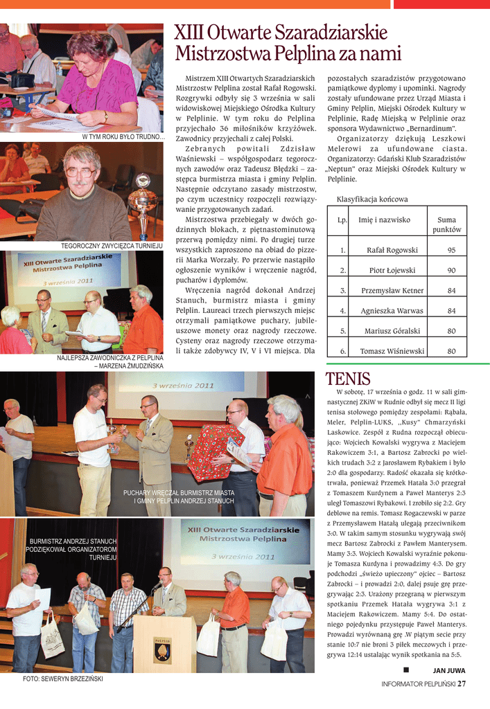 XIII Otwarte Szaradziarskie Mistrzostwa Pelplina za nami w tym roku Było trudno… tegoroczny zwycięzca turnieju najlepsza zawodniczka z pelplina – marzena żmudzińska pozostałych szaradzistów przygotowano Mistrzem XIII Otwartych Szaradziarskich Mistrzostw Pelplina został Rafał Rogowski. pamiątkowe dyplomy i upominki. Nagrody zostały ufundowane przez Urząd Miasta i Rozgrywki odbyły się 3 września w sali Gminy Pelplin, Miejski Ośrodek Kultury w widowiskowej Miejskiego Ośrodka Kultury Pelplinie, Radę Miejską w Pelplinie oraz w Pelplinie. W tym roku do Pelplina przyjechało 36 miłośników krzyżówek. sponsora Wydawnictwo „Bernardinum”. Organizatorzy dziękują Leszkowi Zawodnicy przyjechali z całej Polski. Melerowi za ufundowane ciasta. Zebranych pow it al i Zd zisław Waśniewski – współgospodarz tegorocz- Organizatorzy: Gdański Klub Szaradzistów nych zawodów oraz Tadeusz Błędzki – za- „Neptun” oraz Miejski Ośrodek Kultury w stępca burmistrza miasta i gminy Pelplin. Pelplinie. Następnie odczytano zasady mistrzostw, po czym uczestnicy rozpoczęli rozwiązyKlasyfikacja końcowa wanie przygotowanych zadań. Mistrzostwa przebiegały w dwóch goLp. Imię i nazwisko Suma dzinnych blokach, z piętnastominutową punktów przerwą pomiędzy nimi. Po drugiej turze wszystkich zaproszono na obiad do pizze1. Rafał Rogowski 95 rii Marka Worzały. Po przerwie nastąpiło ogłoszenie wyników i wręczenie nagród, 2. Piotr Łojewski 90 pucharów i dyplomów. Wręczenia nagród dokonał Andrzej 3. Przemysław Ketner 84 Stanuch, burmistrz miasta i gminy Pelplin. Laureaci trzech pierwszych miejsc 4. Agnieszka Warwas 84 otrzymali pamiątkowe puchary, jubileuszowe monety oraz nagrody rzeczowe. 5. Mariusz Góralski 80 Cysteny oraz nagrody rzeczowe otrzymali także zdobywcy IV, V i VI miejsca. Dla 6. Tomasz Wiśniewski 80 puchary wręczał Burmistrz miasta i gminy pelplin andrzej stanuch Burmistrz andrzej stanuch podziękował organizatorom turnieju Foto: seweryn Brzeziński TENIS W sobotę, 17 września o godz. 11 w sali gimnastycznej ZKiW w Rudnie odbył się mecz II ligi tenisa stołowego pomiędzy zespołami: Rąbała, Meler, Pelplin-LUKS, ,,Kusy” Chmarzyński Laskowice. Zespół z Rudna rozpoczął obiecująco: Wojciech Kowalski wygrywa z Maciejem Rakowiczem 3:1, a Bartosz Zabrocki po wielkich trudach 3:2 z Jarosławem Rybakiem i było 2:0 dla gospodarzy. Radość okazała się krótkotrwała, ponieważ Przemek Hatała 3:0 przegrał z Tomaszem Kurdynem a Paweł Manterys 2:3 uległ Tomaszowi Rybakowi. I zrobiło się 2:2. Gry deblowe na remis. Tomasz Rogaczewski w parze z Przemysławem Hatałą ulegają przeciwnikom 3:0. W takim samym stosunku wygrywają swój mecz Bartosz Zabrocki z Pawłem Manterysem. Mamy 3:3. Wojciech Kowalski wyraźnie pokonuje Tomasza Kurdyna i prowadzimy 4:3. Do gry podchodzi „świeżo upieczony” ojciec – Bartosz Zabrocki – i prowadzi 2:0, dalej psuje grę przegrywając 2:3. Urażony przegraną w pierwszym spotkaniu Przemek Hatała wygrywa 3:1 z Maciejem Rakowiczem. Mamy 5:4. Do ostatniego pojedynku przystępuje Paweł Manterys. Prowadzi wyrównaną grę .W piątym secie przy stanie 10:7 nie broni 3 piłek meczowych i przegrywa 12:14 ustalając wynik spotkania na 5:5. Jan Juwa INFORMATOR PELPLIŃSKI 27