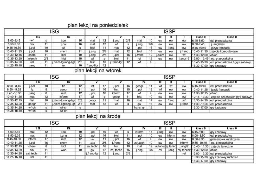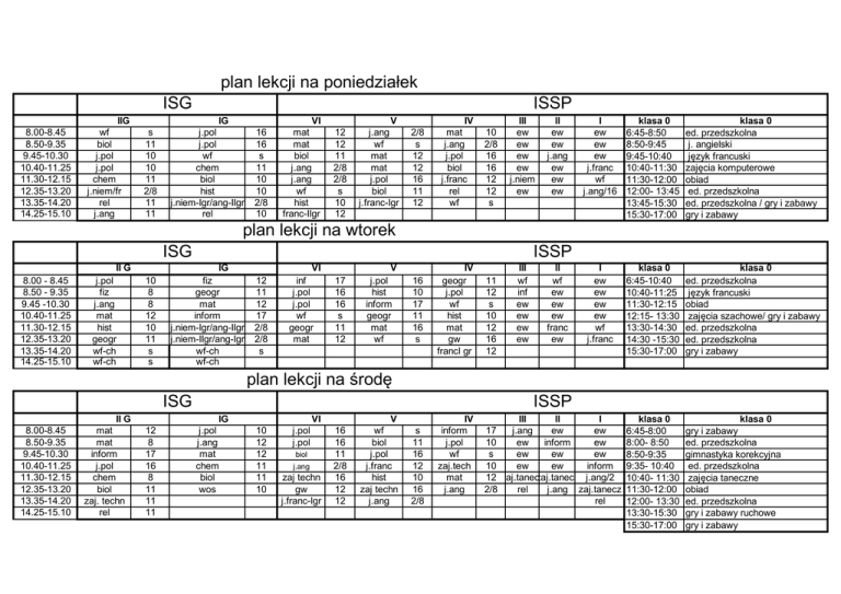 plan lekcji na poniedziałek ISG 8.00-8.45 8.50-9.35 9.45-10.30 10.40-11.25 11.30-12.15 12.35-13.20 13.35-14.20 14.25-15.10 IIG wf biol j.pol j.pol chem j.niem/fr rel j.ang s 11 10 10 11 2/8 11 11 ISSP IG j.pol j.pol wf chem biol hist j.niem-Igr/ang-IIgr rel 16 16 s 11 10 10 2/8 10 VI mat mat biol j.ang j.ang wf hist franc-IIgr 12 12 11 2/8 2/8 s 10 12 V j.ang wf mat mat j.pol biol j.franc-Igr 2/8 s 12 12 16 11 12 IV mat j.ang j.pol biol j.franc rel wf 10 2/8 16 16 12 12 s III ew ew ew ew j.niem ew II ew ew j.ang ew ew ew I ew ew ew j.franc wf j.ang/16 klasa 0 6:45-8:50 8:50-9:45 9:45-10:40 10:40-11:30 11:30-12:00 12:00- 13:45 13:45-15:30 15:30-17:00 klasa 0 ed. przedszkolna j. angielski język francuski zajęcia komputerowe obiad ed. przedszkolna ed. przedszkolna / gry i zabawy gry i zabawy I ew ew ew ew wf j.franc klasa 0 6:45-10:40 10:40-11:25 11:30-12:15 12:15- 13:30 13:30-14:30 14:30 -15:30 15:30-17:00 klasa 0 ed. przedszkolna język francuski obiad zajęcia szachowe/ gry i zabawy ed. przedszkolna ed. przedszkolna gry i zabawy klasa 0 6:45-8:00 8:00- 8:50 8:50-9:35 9:35- 10:40 10:40- 11:30 11:30-12:00 12:00- 13:30 13:30-15:30 15:30-17:00 klasa 0 gry i zabawy ed. przedszkolna gimnastyka korekcyjna ed. przedszkolna zajęcia taneczne obiad ed. przedszkolna gry i zabawy ruchowe gry i zabawy plan lekcji na wtorek ISG 8.00 - 8.45 8.50 - 9.35 9.45 -10.30 10.40-11.25 11.30-12.15 12.35-13.20 13.35-14.20 14.25-15.10 II G j.pol fiz j.ang mat hist geogr wf-ch wf-ch 10 8 8 12 10 11 s s ISSP IG fiz geogr mat inform j.niem-Igr/ang-IIgr j.niem-IIgr/ang-Igr wf-ch wf-ch 12 11 12 17 2/8 2/8 s VI inf j.pol j.pol wf geogr mat 17 16 16 s 11 12 V j.pol hist inform geogr mat wf 16 10 17 11 16 s IV geogr j.pol wf hist mat gw francI gr 11 12 s 10 12 16 12 III wf inf ew ew ew ew II wf ew ew ew franc ew plan lekcji na środę ISG II G 8.00-8.45 8.50-9.35 9.45-10.30 10.40-11.25 11.30-12.15 12.35-13.20 13.35-14.20 14.25-15.10 mat mat inform j.pol chem biol zaj. techn rel ISSP IG 12 8 17 16 8 11 11 11 j.pol j.ang mat chem biol wos VI 10 12 12 11 11 10 j.pol j.pol biol j.ang zaj techn gw j.franc-Igr V 16 16 11 2/8 16 12 12 wf biol j.pol j.franc hist zaj techn j.ang s 11 16 12 10 16 2/8 IV inform j.pol wf zaj.tech mat j.ang 17 10 s 10 12 2/8 III II I j.ang ew ew ew inform ew ew ew ew ew ew inform zaj.tanecz zaj.tanecz j.ang/2 rel j.ang zaj.tanecz rel plan lekcji na czwartek ISG 8.00-8.45 8.50-9.35 9.45-10.30 10.40-11.25 11.30-12.15 12.35-13.20 13.35-14.20 14.25-15.10 II G wf fiz geogr j.pol gw mat ISSP IG s 8 12 16 16 fiz j.pol wf mat mat 10 10 s 12 12 12 geogr zaj.art rel 11 11 10 VI mat j.pol j.pol j.ang geogr wf rel V IV mat geogr j.pol j.pol rel 11 16 16 2/8 11 j.pol mat rel plast wf 16 12 11 11 s 12 11 10 10 10 s 10 muz j.ang 10 j.ang 2/8 2/8 j. franc II gr 12 III muz j.ang ew ew ew II ew ew ew rel muz I ew ew j.ang/8 ew ew rel wf j.ang wf ew klasa 0 6:45-8:50 8:50- 9:45 9:45-10:30 10:30 -11:30 11:30-12:15 12:15-14.30 klasa 0 ed. przedszkolna język angielski rytmika gimnastyka korekcyjna obiad ed. przedszkolna/ gry i zabawy 14.30-15.30 Klub Europejczyka 15:30-17:00 gry i zabawy plan lekcji na piątek ISG 8.00-8.45 8.50-9.35 9.45-10.30 10.40-11.25 11.30-12.15 12.35-13.20 13.35-14.20 14.25-15.10 IIG plast hist mat j.niem/j.fra j.ang wos wf dz wf dz 8 8 12 2/8 8 10 s IG hist mat j.niem/j.ang muz j.pol godz.wych wf dz wf dz ISSP VI 10 12 2/8 11 16 12 s mat plas muz wf hist rel franc 11 11 11 s 10 16 12 V j.ang mat j.pol gw rel j.franc-IIgr 16 16 16 16 11 8 IV mat j.ang wf hist muz plast 12 10 s 10 12 11 III II wf wf ew rel ew j.franc j.ang ew ew ew j.niem ew I ew ew rel ew ew wf muz klasa 0 6:45-7:50 7:50- 8:50 8:50- 9:35 9:35- 11:30 11:30-12:15 12:15- 14:20 14:20 -15:30 15:30-17:00 klasa 0 gry i zabawy/ ed. przedszkolna religia gimnastyka korekcyjna ed. przedszkolna obiad zajęcia literackie Klub Europejczyka gry i zabawy