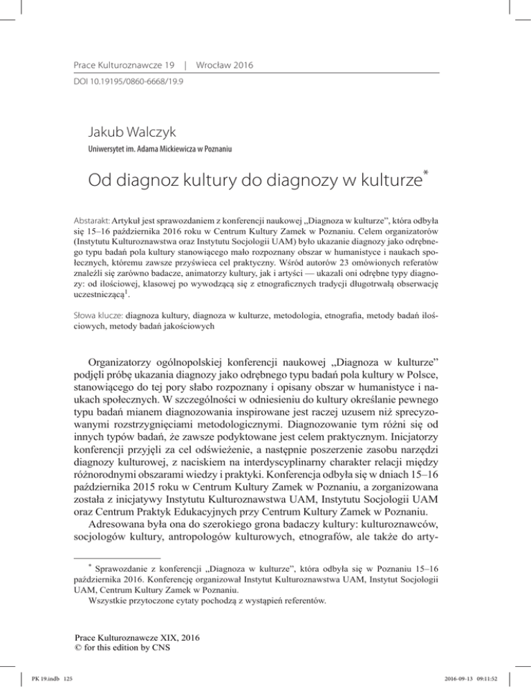 Prace Kulturoznawcze 19 | Wrocław 2016 DOI 10.19195/0860-6668/19.9 Jakub Walczyk Uniwersytet im. Adama Mickiewicza w Poznaniu Od diagnoz kultury do diagnozy w kulturze* Abstarakt: Artykuł jest sprawozdaniem z konferencji naukowej „Diagnoza w kulturze”, która odbyła się 15–16 października 2016 roku w Centrum Kultury Zamek w Poznaniu. Celem organizatorów (Instytutu Kulturoznawstwa oraz Instytutu Socjologii UAM) było ukazanie diagnozy jako odrębnego typu badań pola kultury stanowiącego mało rozpoznany obszar w humanistyce i naukach społecznych, któremu zawsze przyświeca cel praktyczny. Wśród autorów 23 omówionych referatów znaleźli się zarówno badacze, animatorzy kultury, jak i artyści — ukazali oni odrębne typy diagnozy: od ilościowej, klasowej po wywodzącą się z etnograficznych tradycji długotrwałą obserwację uczestniczącą1. Słowa klucze: diagnoza kultury, diagnoza w kulturze, metodologia, etnografia, metody badań ilościowych, metody badań jakościowych Organizatorzy ogólnopolskiej konferencji naukowej „Diagnoza w kulturze” podjęli próbę ukazania diagnozy jako odrębnego typu badań pola kultury w Polsce, stanowiącego do tej pory słabo rozpoznany i opisany obszar w humanistyce i naukach społecznych. W szczególności w odniesieniu do kultury określanie pewnego typu badań mianem diagnozowania inspirowane jest raczej uzusem niż sprecyzowanymi rozstrzygnięciami metodologicznymi. Diagnozowanie tym różni się od innych typów badań, że zawsze podyktowane jest celem praktycznym. Inicjatorzy konferencji przyjęli za cel odświeżenie, a następnie poszerzenie zasobu narzędzi diagnozy kulturowej, z naciskiem na interdyscyplinarny charakter relacji między różnorodnymi obszarami wiedzy i praktyki. Konferencja odbyła się w dniach 15–16 października 2015 roku w Centrum Kultury Zamek w Poznaniu, a zorganizowana została z inicjatywy Instytutu Kulturoznawstwa UAM, Instytutu Socjologii UAM oraz Centrum Praktyk Edukacyjnych przy Centrum Kultury Zamek w Poznaniu. Adresowana była ona do szerokiego grona badaczy kultury: kulturoznawców, socjologów kultury, antropologów kulturowych, etnografów, ale także do arty* Sprawozdanie z konferencji „Diagnoza w kulturze”, która odbyła się w Poznaniu 15–16 października 2016. Konferencję organizował Instytut Kulturoznawstwa UAM, Instytut Socjologii UAM, Centrum Kultury Zamek w Poznaniu. Wszystkie przytoczone cytaty pochodzą z wystąpień referentów. Prace Kulturoznawcze XIX, 2016 © for this edition by CNS PK 19.indb 125 2016-09-13 09:11:52 126 Jakub Walczyk stów i edukatorów artystycznych, animatorów społeczno-kulturowych, edukatorów, aktywistów miejskich — wszystkich tych, którzy w swoich działaniach stosują diagnozę społeczno-kulturową. Poddano refleksji samo rozumienie diagnozy, ale także koncentrowano się na różnych jej typach: od diagnozy społeczności lokalnych przez badania otoczenia instytucji kultury po diagnozowanie jako etap w realizacji projektów animacyjno-kulturowych. Podkreślano rolę diagnozy w prowadzeniu działalności i tworzeniu projektów najbardziej odpowiadających potrzebom ich odbiorców, nie zaś „oderwanych” od kontekstu, otoczenia i ludzi. Program konferencji składał się z dwudziestu trzech referatów, pogrupowanych przez organizatorów w pięć sesji: „Różnicujące uczestnictwo w kulturze”, „Diagnoza w animacji i etnografii”, „Diagnozując sztukę”, „Diagnoza lokalna” oraz „Diagnozując instytucje kultury”. W ramach każdej z nich prelegenci — zarówno badacze, jak i animatorzy kultury czy artyści — proponowali własne modele i schematy badawcze, wypracowane w praktyce zrealizowanych projektów. Dodatkowo, w każdym dniu właściwe sesje poprzedziły wystąpienia plenerowe z udziałem zaproszonych gości. Konferencję zainicjował referat Barbary Fatygi Diagnoza i diagnozowanie kultury. W swoim wystąpieniu autorka skoncentrowała się zarówno na metodologicznych, jak i etycznych dylematach badaczy oraz samym przebiegu procesu diagnostycznego. Następnie referat Drugie dno badań, drugie życie raportów, czyli o sposobach instrumentalizowania badań kultury wygłosił Rafał Drozdowski. W wystąpieniu wskazał na komercyjny charakter badań i kontekst ekonomiczny, w jakim są one przeprowadzane. W krytyczny sposób zobrazował praktyki instrumentalizacji badań społecznych oraz etyczne napięcie związane z opracowywaniem wyników badań „ pod sugestie” i potrzeby zamawiającego. Po wystąpieniach otwierających przyszedł czas na pierwszą sesję „Różnicujące uczestnictwo w kulturze”, podczas której swoje referaty wygłosili: Jan Grad, Krzysztof Stachura, Przemysław Sadura oraz Katarzyna Murawska. W wystąpieniu Badanie a diagnozowanie uczestnictwa w kulturze Jan Grad uporządkował relację między diagnozą a innymi typami badań i ukazał — odwołując się do tradycji badań uczestnictwa w kulturze — metodologiczny punkt widzenia nauk o kulturze i nauk społecznych. Nawiązywał do historii i tradycji badań uczestnictwa w kulturze w Polsce i na tym gruncie charakteryzował diagnozę jako typ badań stosowanych. Krzysztof Stachura oparł swoje wystąpienie Czym są i jak badać hierarchię w kulturze — raport z przygotowań do analiz nad dystynkcjami, powinnościami i satysfakcją na analizie założeń projektu „Kulturalna hierarchia. Nowe dystynkcje i powinności w kulturze a satysfakcja społeczna”, realizowanego w ramach programu Obserwatorium kultury MKiDN w latach 2015–2016. Projekt zakładał przeprowadzenie badań, których celem było rozpoznanie wzajemnych relacji między praktykami kulturowymi, stylem życia a umiejscowieniem uczestników kultury w strukturze społecznej. Autor poddał refleksji sposoby diagnozowania Prace Kulturoznawcze XIX, 2016 © for this edition by CNS PK 19.indb 126 2016-09-13 09:11:52 Od diagnoz kultury do diagnozy w kulturze 